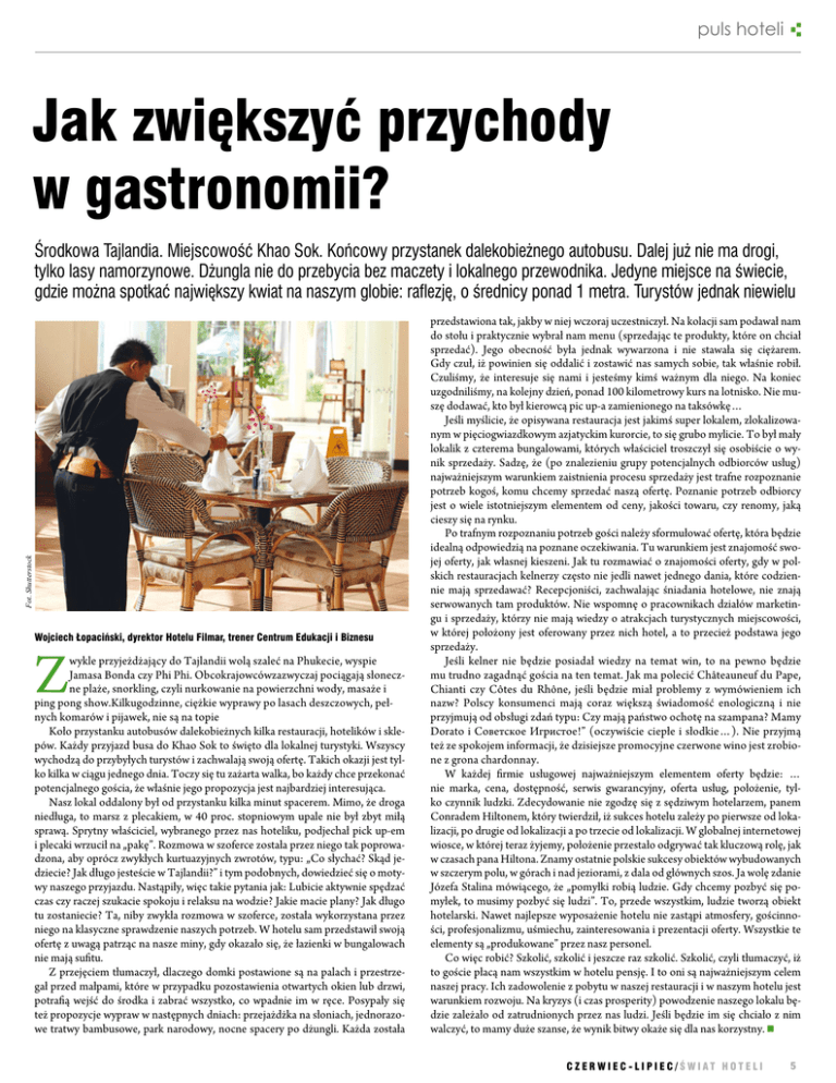 puls hoteli Jak zwiększyć przychody w gastronomii? Fot. Shutterstock Środkowa Tajlandia. Miejscowość Khao Sok. Końcowy przystanek dalekobieżnego autobusu. Dalej już nie ma drogi, tylko lasy namorzynowe. Dżungla nie do przebycia bez maczety i lokalnego przewodnika. Jedyne miejsce na świecie, gdzie można spotkać największy kwiat na naszym globie: raflezję, o średnicy ponad 1 metra. Turystów jednak niewielu Wojciech Łopaciński, dyrektor Hotelu Filmar, trener Centrum Edukacji i Biznesu Z wykle przyjeżdżający do Tajlandii wolą szaleć na Phukecie, wyspie Jamasa Bonda czy Phi Phi. Obcokrajowcówzazwyczaj pociągają słoneczne plaże, snorkling, czyli nurkowanie na powierzchni wody, masaże i ping pong show.Kilkugodzinne, ciężkie wyprawy po lasach deszczowych, pełnych komarów i pijawek, nie są na topie Koło przystanku autobusów dalekobieżnych kilka restauracji, hotelików i sklepów. Każdy przyjazd busa do Khao Sok to święto dla lokalnej turystyki. Wszyscy wychodzą do przybyłych turystów i zachwalają swoją ofertę. Takich okazji jest tylko kilka w ciągu jednego dnia. Toczy się tu zażarta walka, bo każdy chce przekonać potencjalnego gościa, że właśnie jego propozycja jest najbardziej interesująca. Nasz lokal oddalony był od przystanku kilka minut spacerem. Mimo, że droga niedługa, to marsz z plecakiem, w 40 proc. stopniowym upale nie był zbyt miłą sprawą. Sprytny właściciel, wybranego przez nas hoteliku, podjechał pick up-em i plecaki wrzucił na „pakę”. Rozmowa w szoferce została przez niego tak poprowadzona, aby oprócz zwykłych kurtuazyjnych zwrotów, typu: „Co słychać? Skąd jedziecie? Jak długo jesteście w Tajlandii?” i tym podobnych, dowiedzieć się o motywy naszego przyjazdu. Nastąpiły, więc takie pytania jak: Lubicie aktywnie spędzać czas czy raczej szukacie spokoju i relaksu na wodzie? Jakie macie plany? Jak długo tu zostaniecie? Ta, niby zwykła rozmowa w szoferce, została wykorzystana przez niego na klasyczne sprawdzenie naszych potrzeb. W hotelu sam przedstawił swoją ofertę z uwagą patrząc na nasze miny, gdy okazało się, że łazienki w bungalowach nie mają sufitu. Z przejęciem tłumaczył, dlaczego domki postawione są na palach i przestrzegał przed małpami, które w przypadku pozostawienia otwartych okien lub drzwi, potrafią wejść do środka i zabrać wszystko, co wpadnie im w ręce. Posypały się też propozycje wypraw w następnych dniach: przejażdżka na słoniach, jednorazowe tratwy bambusowe, park narodowy, nocne spacery po dżungli. Każda została przedstawiona tak, jakby w niej wczoraj uczestniczył. Na kolacji sam podawał nam do stołu i praktycznie wybrał nam menu (sprzedając te produkty, które on chciał sprzedać). Jego obecność była jednak wywarzona i nie stawała się ciężarem. Gdy czuł, iż powinien się oddalić i zostawić nas samych sobie, tak właśnie robił. Czuliśmy, że interesuje się nami i jesteśmy kimś ważnym dla niego. Na koniec uzgodniliśmy, na kolejny dzień, ponad 100 kilometrowy kurs na lotnisko. Nie muszę dodawać, kto był kierowcą pic up-a zamienionego na taksówkę… Jeśli myślicie, że opisywana restauracja jest jakimś super lokalem, zlokalizowanym w pięciogwiazdkowym azjatyckim kurorcie, to się grubo mylicie. To był mały lokalik z czterema bungalowami, których właściciel troszczył się osobiście o wynik sprzedaży. Sadzę, że (po znalezieniu grupy potencjalnych odbiorców usług) najważniejszym warunkiem zaistnienia procesu sprzedaży jest trafne rozpoznanie potrzeb kogoś, komu chcemy sprzedać naszą ofertę. Poznanie potrzeb odbiorcy jest o wiele istotniejszym elementem od ceny, jakości towaru, czy renomy, jaką cieszy się na rynku. Po trafnym rozpoznaniu potrzeb gości należy sformułować ofertę, która będzie idealną odpowiedzią na poznane oczekiwania. Tu warunkiem jest znajomość swojej oferty, jak własnej kieszeni. Jak tu rozmawiać o znajomości oferty, gdy w polskich restauracjach kelnerzy często nie jedli nawet jednego dania, które codziennie mają sprzedawać? Recepcjoniści, zachwalając śniadania hotelowe, nie znają serwowanych tam produktów. Nie wspomnę o pracownikach działów marketingu i sprzedaży, którzy nie mają wiedzy o atrakcjach turystycznych miejscowości, w której położony jest oferowany przez nich hotel, a to przecież podstawa jego sprzedaży. Jeśli kelner nie będzie posiadał wiedzy na temat win, to na pewno będzie mu trudno zagadnąć gościa na ten temat. Jak ma polecić Châteauneuf du Pape, Chianti czy Côtes du Rhône, jeśli będzie miał problemy z wymówieniem ich nazw? Polscy konsumenci mają coraz większą świadomość enologiczną i nie przyjmują od obsługi zdań typu: Czy mają państwo ochotę na szampana? Mamy Dorato i Coвeтcкoe Игpиcтoe!” (oczywiście ciepłe i słodkie…). Nie przyjmą też ze spokojem informacji, że dzisiejsze promocyjne czerwone wino jest zrobione z grona chardonnay. W każdej firmie usługowej najważniejszym elementem oferty będzie: … nie marka, cena, dostępność, serwis gwarancyjny, oferta usług, położenie, tylko czynnik ludzki. Zdecydowanie nie zgodzę się z sędziwym hotelarzem, panem Conradem Hiltonem, który twierdził, iż sukces hotelu zależy po pierwsze od lokalizacji, po drugie od lokalizacji a po trzecie od lokalizacji. W globalnej internetowej wiosce, w której teraz żyjemy, położenie przestało odgrywać tak kluczową rolę, jak w czasach pana Hiltona. Znamy ostatnie polskie sukcesy obiektów wybudowanych w szczerym polu, w górach i nad jeziorami, z dala od głównych szos. Ja wolę zdanie Józefa Stalina mówiącego, że „pomyłki robią ludzie. Gdy chcemy pozbyć się pomyłek, to musimy pozbyć się ludzi”. To, przede wszystkim, ludzie tworzą obiekt hotelarski. Nawet najlepsze wyposażenie hotelu nie zastąpi atmosfery, gościnności, profesjonalizmu, uśmiechu, zainteresowania i p