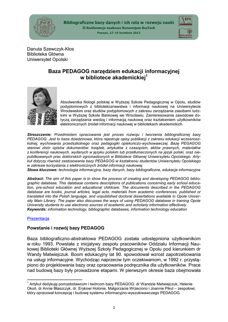 Danuta Szewczyk-Kłos Biblioteka Główna Uniwersytet Opolski Baza PEDAGOG narzędziem edukacji informacyjnej w bibliotece akademickiej1 Absolwentka filologii polskiej w Wyższej Szkole Pedagogicznej w Opolu, studiów podyplomowych z bibliotekoznawstwa i informacji naukowej na Uniwersytecie Wrocławskim oraz studiów podyplomowych z zakresu zarządzania zasobami ludzkimi w Wyższej Szkole Bankowej we Wrocławiu. Zainteresowania zawodowe dotyczą zarządzania wiedzą i informacją naukową oraz kształceniem użytkowników elektronicznych źródeł informacji naukowej w bibliotekach akademickich. Streszczenie: Przedmiotem opracowania jest proces rozwoju i tworzenia bibliograficznej bazy PEDAGOG. Jest to baza dziedzinowa, która rejestruje opisy publikacji z zakresu edukacji wczesnoszkolnej, wychowania przedszkolnego oraz pedagogiki opiekuńczo-wychowawczej. Bazę PEGAGOG stanowi zbiór opisów dokumentów: książek, artykułów z czasopism, aktów prawnych, materiałów z konferencji naukowych, wydanych w języku polskim lub przetłumaczonych na język polski, oraz niepublikowanych prac doktorskich zgromadzonych w Bibliotece Głównej Uniwersytetu Opolskiego. Artykuł dotyczy również zastosowania bazy PEDAGOG w kształceniu studentów Uniwersytetu Opolskiego w zakresie korzystania z elektronicznych źródeł informacji naukowej. Słowa kluczowe: technologia informacyjna, bazy danych, bazy bibliograficzne, edukacja informacyjna Abstract: The aim of this paper is to show the process of creating and developing PEDAGOG bibliographic database. This database contains descriptions of publications concerning early school education, pre-school education and educational childcare. The documents described in the PEDAGOG database are books, journal articles, legal acts, materials from academic conferences, published or translated into the Polish language, and unpublished doctoral dissertations available in Opole University Main Library. The paper also discusses the ways of using PEDAGOG database in training Opole University students to use electronic sources of academic and scholarly information effectively. Keywords: information technology, bibliographic databases, information technology education Prezentacja Powstanie i rozwój bazy PEDAGOG Baza bibliograficzno-abstraktowa PEDAGOG została udostępniona użytkownikom w roku 1993. Powstała z inicjatywy zespołu pracowników Oddziału Informacji Naukowej Biblioteki Głównej Wyższej Szkoły Pedagogicznej w Opolu pod kierunkiem dr Wandy Matwiejczuk. Boom edukacyjny lat 90. spowodował wzrost zapotrzebowania na usługi informacyjne. Wychodząc naprzeciw tym oczekiwaniom, w 1992 r. przystąpiono do projektowania bazy oraz opracowania podręcznika dla użytkowników. Prace nad budową bazy były prowadzone etapami. W pierwszym okresie baza obejmowała 1 Artykuł dedykuję pomysłodawcom i twórcom bazy PEDAGOG: dr Wandzie Matwiejczuk, Helenie Okoń, dr Annie Błaszczyk, dr. Erykowi Holonie, Małgorzacie Wrzeciono i Joannie Pikul – zespołowi, który opracował koncepcję i budowę systemu informacyjno-wyszukiwawczego PEDAGOG. 1 swym zakresem materiały dotyczące pedagogiki opiekuńczo-wychowawczej. Przy pomocy pracowników Instytutu Nauk Pedagogicznych, prof. dr hab. Józefy Brągiel oraz dr. Eryka Holony, opracowano pierwszą wersję słownika słów kluczowych, wykazów nazw i instytucji. Przygotowane zostały szablony ekranowe z formatami dla poszczególnych rodzajów dokumentów. Elementy szablonu odpowiadały poszczególnym polom opisu bibliograficznego i mogły być wielokrotnie edytowane i poprawiane przez redaktorów bazy. Rys. 1. Przykład szablonu ekranowego dla wydawnictw zwartych bazy PEDAGOG Źródło: Pedagog. System Informacyjny Nauk Pedagogicznych. Podręcznik użytkownika. Część I: Pedagogika opiekuńczo-wychowawcza. Opole, 1993. Baza była dystrybuowana wśród zainteresowanych odbiorców na dyskietkach. W pierwszej wersji była tworzona w systemie SDI (selektywnej dystrybucji informacji) i aktualizowana dwa razy w roku. Odbiorcami bazy były przede wszystkim biblioteki uczelni pedagogicznych i uniwersyteckie. W kolejnych latach funkcjonowania bazę obsługiwał pakiet zagranicznego oprogramowania Mikro CDS/ISIS 2, który w tamtym czasie był bardzo popularny w polskich bibliotekach. Oprogramowanie to było uruchamiane w systemie operacyjnym DOS i wykorzystywane przez biblioteki akademickie do tworzenia pierwszych komputerowych katalogów z informacjami o zasobach biblioteki oraz baz bibliograficznych. PEDAGOG udostępniany był lokalnie na komputerach w Oddziale Informacji Naukowej, a personel oddziału służył pomocą użytkownikom przy wyszukiwaniu danych. Zasięg chronologiczny bazy obejmuje wyselekcjonowane opisy dokumentów publikowanych i niepublikowanych od roku 1990. Od początku funkcjonowania bazy sporządzano je z autopsji w oparciu o literaturę gromadzoną w zasobach biblioteki 2 JACQUESSON, A. Automatyzacja bibliotek. Zarys historyczny, strategia, perspektywy. Warszawa, 1999, s. 18. 2 i uzupełniano (od 1997 r.) o dokumenty otrzymane o obowiązkowych egzemplarzach bibliotecznych3. w ramach Ustawy Po kilku latach funkcjonowania baza została rozbudowana o kolejne dwa zakresy tematyczne – wychowanie przedszkolne i edukację wczesnoszkolną – i udostępniona użytkownikom za pomocą nowego komputerowego oprogramowania opracowanego specjalnie na potrzeby tej bazy przez Daniela Łasia, informatyka z Biblioteki Głównej. Oprogramowanie miało nazwę PEDAGOG SQL i uruchamiane było w środowisku Linux. Na potrzeby tej bazy przygotowano odpowiednie formaty wprowadzania danych rekordów opisów bibliograficznych wraz z adnotacją o treści dokumentu. Od kwietnia 1999 r., kiedy Biblioteka Główna UO zamieściła własną stronę WWW w Internecie, baza PEDAGOG została uruchomiona wraz z innymi bazami komputerowymi biblioteki w ogólnodostępnej sieci komputerowej. Rys. 2. Formularz wyszukiwania w bazie PEDAGOG pr