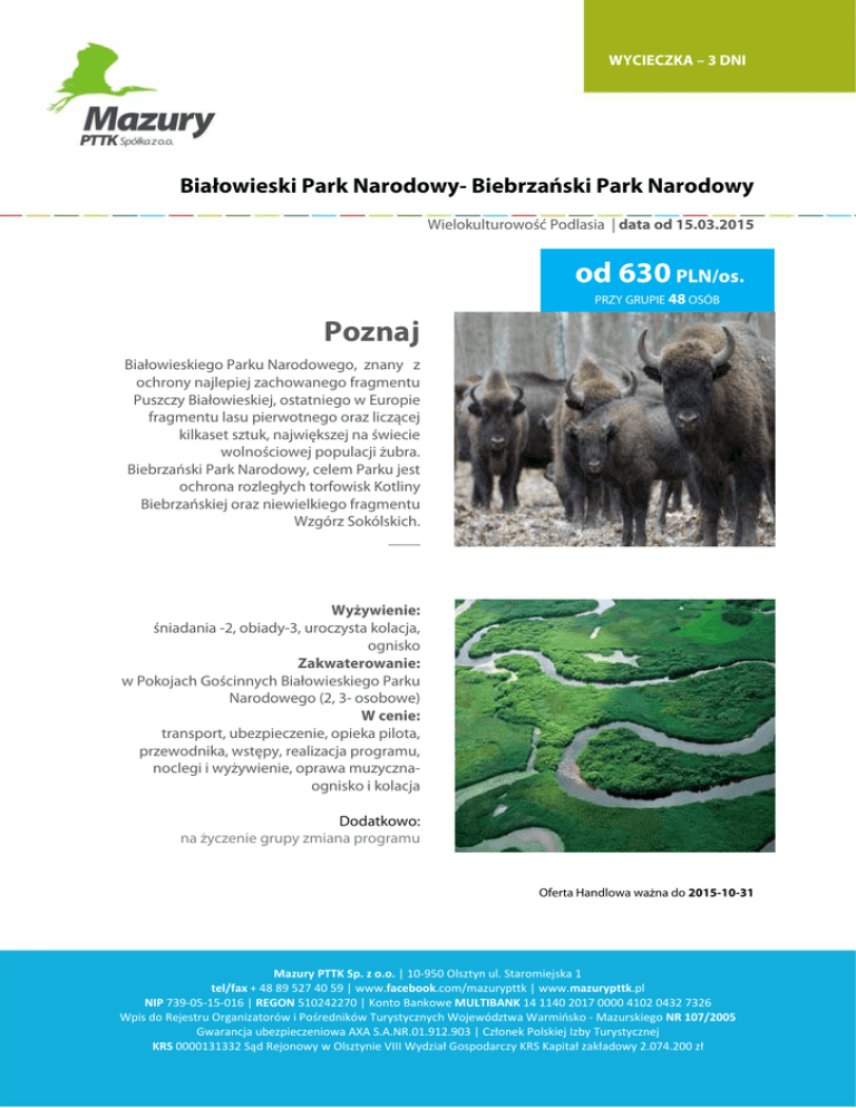 WYCIECZKA – 3 DNI Białowieski Park Narodowy- Biebrzański Park Narodowy Wielokulturowość Podlasia | data od 15.03.2015 od 630 PLN/os. PRZY GRUPIE 48 OSÓB Poznaj Białowieskiego Parku Narodowego, znany z ochrony najlepiej zachowanego fragmentu Puszczy Białowieskiej, ostatniego w Europie fragmentu lasu pierwotnego oraz liczącej kilkaset sztuk, największej na świecie wolnościowej populacji żubra. Biebrzański Park Narodowy, celem Parku jest ochrona rozległych torfowisk Kotliny Biebrzańskiej oraz niewielkiego fragmentu Wzgórz Sokólskich. ____ Wyżywienie: śniadania -2, obiady-3, uroczysta kolacja, ognisko Zakwaterowanie: w Pokojach Gościnnych Białowieskiego Parku Narodowego (2, 3- osobowe) W cenie: transport, ubezpieczenie, opieka pilota, przewodnika, wstępy, realizacja programu, noclegi i wyżywienie, oprawa muzycznaognisko i kolacja Dodatkowo: na życzenie grupy zmiana programu Oferta Handlowa ważna do 2015-10-31 Mazury PTTK Sp. z o.o. | 10-950 Olsztyn ul. Staromiejska 1 tel/fax + 48 89 527 40 59 | www.facebook.com/mazurypttk | www.mazurypttk.pl NIP 739-05-15-016 | REGON 510242270 | Konto Bankowe MULTIBANK 14 1140 2017 0000 4102 0432 7326 Wpis do Rejestru Organizatorów i Pośredników Turystycznych Województwa Warmińsko - Mazurskiego NR 107/2005 Gwarancja ubezpieczeniowa AXA S.A.NR.01.912.903 | Członek Polskiej Izby Turystycznej KRS 0000131332 Sąd Rejonowy w Olsztynie VIII Wydział Gospodarczy KRS Kapitał zakładowy 2.074.200 zł PROGRAM WYCIECZKI DZIEŃ 1 6:00-wyjazd, przejazd do Osowca, zwiedzanie: Muzeum Przyrody Biebrzańskiego Parku Narodowego, Twierdzy Osowiec, przejazd do Tykocina, zwiedzanie Tykocina ,bardzo ciekawa zabudowa miasta Synagoga, kościoły, przerwa obiadowa, przejazd do Białowieży, zakwaterowanie, przygotowanie do kolacji (zakwaterowanie w Pokojach Gościnnych Białowieskiego Parku Narodowego (2, 3- osobowe).Uroczysta kolacja przy muzyce DJ (lub dłużej). DZIEŃ 2 Śniadanie (szwedzki stół), zwiedzanie Białowieskiego Parku Narodowego (Muzeum Białowieskiego Parku Narodowego, spacer szlakiem Dębów Królewskich, Rezerwat Pokazowy Żubrów, Rezerwat Ścisły- 3 godz. spacer na trasie 7 km spacer, czas do dyspozycji grupy, ognisko (kiełbaska, bigos, kiszka, herbata, pieczywo), muzyka akordeonowa. DZIEŃ 3 Śniadanie (szwedzki stół), przejazd do Kruszynian, zwiedzanie Meczetu, przejazd i zwiedzanie Bohonik, przejazd Supraśl, zwiedzanie Monasteru w Supraślu,(koncerty muzyki cerkiewnej w wykonaniu chóru przyklasztornego), przejazd do Białegostoku, zwiedzanie Pałac Branickich i ogrodów, Jarmark Regionalny, obiad. Przejazd do Św. Wody, zwiedzanie Sanktuarium i Góry Krzyży, przyjazd do Olsztyn około 22:00. zapraszamy Więcej na www.mazurypttk.pl/oferta Oferta handlowa zawiera cenę brutto | Mazury PTTK Sp. z o.o. | str. 1