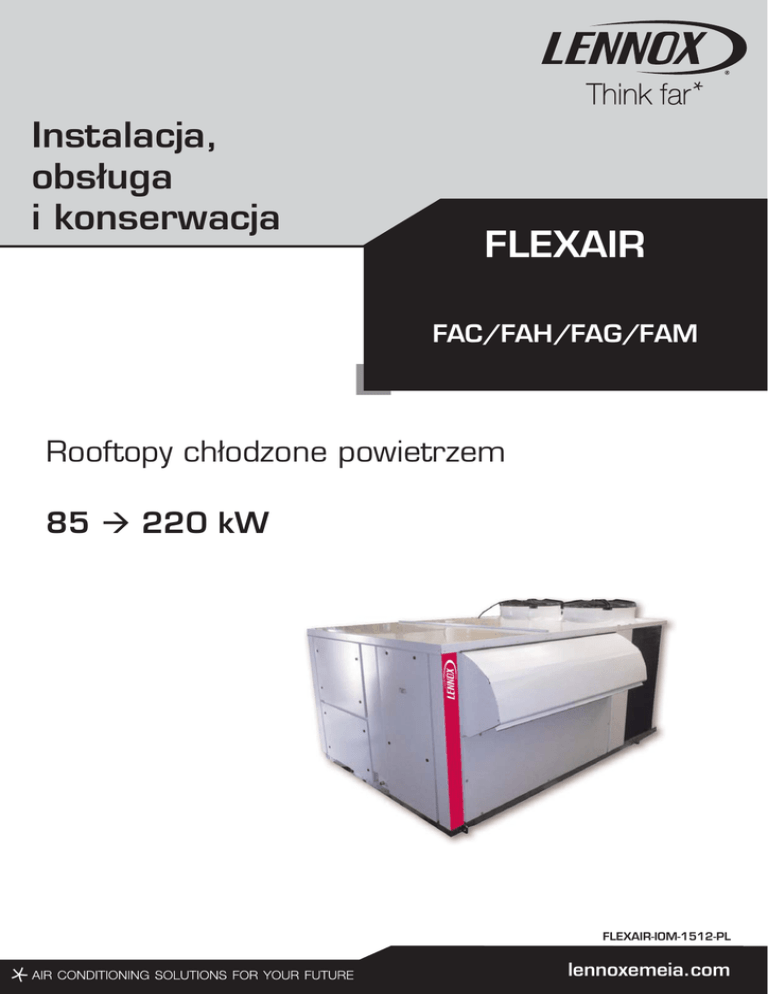 Instalacja, obsługa i konserwacja FLEXAIR FAC/FAH/FAG/FAM Rooftopy chłodzone powietrzem 85 220 kW FLEXAIR-IOM-1512-PL lennoxemeia.com SPIS TREŚCI INSTRUKCJA MONTAŻU OBSŁUGI KONSERWACJI Ref: FLEXAIR-IOM-1512-PL UWAGA - Zasady bezpieczeństwa 6 OSTRZEŻENIA DOTYCZĄCE TRANSPORTU I ROZŁADUNKU 8 Sprawdzenie przy dostawie 8 Tabliczka znamionowa 8 Przechowywanie Klucz serwisowy 8 8 Syfony spustu skroplin 8 Obowiązkowe urządzenia do przeładunku 9 Wymiary i wagi 10 Podnoszenie urządzeń 11 INSTALACJA Osłony zabezpieczające przy przenoszeniu wózkiem widłowym 12 12 Minimalna przestrzeń wokół urządzenia 13 Połączenia kanałów 14 INSTALACJA PODSTAWY DACHOWEJ Zabezpieczenie i izolacja 15 16 Instalacja nie regulowanej nie zmontowanej podstawy dachowej 17 Przejściowa podstawa dachowa 18 Moduł odzysku ciepła - instalacja 19 ROZRUCH 20 INSTRUKCJA SERWISOWA 28 FLEXAIR-IOM-1512-PL •1• SŁOWNICZEK Konfiguracja przepływu powietrza powrotnego (standard = przepływ w dół) symbol Powrót poziomy Konfiguracja przepływu powietrza nawiewanego (standard = przepływ w dół) HORE symbol Nawiew poziomy HOSU Opcje wywiewu powietrza symbol GEDD Przepustnica grawitacyjna dla powrotu w dół •2• Osiowy wentylator wyciągowy, przepustnica grawitacyjna dla powrotu w dół PEFA Podstawa wywiewna z niskociśnieniowym wentylatorem EC z przepływem pionowym (system z 3 przepustnicami z wentylatorem promieniowo- osiowym EC) Podstawa wywiewna z niskociśnieniowym wentylatorem EC z przepływem poziomym (system z 3 przepustnicami z wentylatorem promieniowo- osiowym EC) Podstawa wywiewna z wysokociśnieniowym wentylatorem EC (przepływ pionowy w dół lub przepływ poziomy) ERVL HPER Opcje filtracji Filtry G 4 z metalową ramą symbol FEU4 ERHL Filtry F7 i filtry wstępne G 4 FEU7 Filtry G4 z wymiennym wkładem REU4 Opcje chłodnicze Cicha praca symbol Dobór zestawu napędowego / Opcje wentylacji symbol LONO Wysoko wydajny wentylator nawiewny HP HEHP Opcje grzewcze symbol Nagrzewnica elektryczna (moc standardowa) 2 stopnie ELHS Nagrzewnica elektryczna (moc średnia) modulowana ELHM Nagrzewnica elektryczna (moc duża) modulowana ELHH Nagrzewnica wodna (moc standardowa) HWCS Nagrzewnica wodna (moc duża) HWCH Opcja gazu ziemnego 300 mbar Opcje ochrony antykorozyjnej wymienników symbol 300M Zabezpieczenie antykorozyjne skraplaczy i parowników LenGuardTM BLCE Opcje elektryczne i zabezpieczające symbol Detektor dymu DAD DADS Czujka przeciwpożarowa FIRS Czujnik CO2 CO2S Miernik energii ELME Opcje sterowania eCLIMATIC symbol Wyświetlacz komfortu DC60 Wyświetlacz serwisowy DS60 Wyświetlacz Multirooftop DM60 Płytka styków bezpotencjałowych DCBO Rozszerzony pakiet sterujący (sterowanie entalpią i wilgotnością) ADCP Interfejs transmisji danych LonWorks® FTT10 ECLO Interfejs transmisji danych BACnet® MSTP BNET Interfejs transmisji danych Modbus RS485 MBUS Interfejs transmisji danych Modbus/BACnet® interfejs TCP/IP MBIP Inne opcje symbol Nie regulowana nie zmontowana podstawa dachowa NARC Regulowana zmontowana podstawa dachowa ADRC Wielokierunkowa podstawa dachowa MDRC Panel z blachą z dwóch stron - 25mm DBSK Moduł odzysku ciepła (przepływ pionowy w dół i przepływ poziomy) HRMO Pakowanie do przewozu w kontenerze z folią zabezpieczającą PACK FLEXAIR-IOM-1512-PL WPROWADZENIE CHŁODZENIE GRZANIE Moc chłodnicza netto Pobór mocy ERR Moc grzewcza netto Pobór mocy COP FAC085DNM1M 84.1 26.0 3.24 - - - FAC100DNM1M 98.3 33.7 2.92 - - - FAC120DNM1M 115.1 40.4 2.85 - - - FAC150DNM1M 143.4 51.7 2.77 - - - FAC170DNM1M 158.8 59.9 2.65 - - - FAC200DNM1M 184.8 64.0 2.89 - - - FAC230DNM1M 223.0 78.6 2.84 - - - FAG085DNM1M 83.6 26.6 3.15 - - - FAG100DNM1M 97.2 34. 8 2.80 - - - FAG120DNM1M 113.8 41.7 2.73 - - - FAG150DNM1M 142.2 52. 9 2.69 - - - FAG170DNM1M 157.0 61.7 2.54 - - - FAG200DNM1M 183.3 65.5 2.80 - - - FAG230DNM1M 220.8 80.8 2.74 - - - FAH085DNM1M 83.1 26.0 3.20 80.3 23.7 3.39 FAH100DNM1M 97.0 33.7 2.88 97.7 29.5 3.32 FAH120DNM1M 113.4 40.3 2.81 113.2 37.6 3.01 FAH150DNM1M 138.0 51.5 2.68 137.6 40.7 3.38 FAH170DNM1M 156.0 59.8 2.61 161.4 49.0 3.29 FAH200DNM1M 182. 1 64.0 2.85 191.2 55.7 3.43 FAH230DNM1M 220.2 78.6 2.80 231.6 75.0 3.09 FAM085DNM1M 82.6 26.6 3.11 80.9 24.2 3.34 FAM100DNM1M 95.9 34.77 2.76 98.8 30.5 3.24 FAM120DNM1M 112. 0 41.7 2.69 114.5 39.0 2.94 FAM150DNM1M 136.8 52.7 2.60 138.7 41.9 3.31 FAM170DNM1M 154.2 61.6 2.50 163.2 50.9 3.21 FAM200DNM1M 180.6 65. 5 2.76 192.7 57.2 3.37 FAM230DNM1M 218.1 80.7 2.70 233.7 77.1 3.03 FLEXAIR-IOM-1512-PL •3• WPROWADZENIE ZGODNOŚĆ Z DYREKTYWĄ EMC UWAGA: To urządzenie posiada klasę „A” zgodnie z dyrektywą CEM. W środowisku przemysłowym, urządzenie może wytwarzać zakłócenia radioelektryczne. W takim przypadku właściciel może być wezwany do podjęcia stosownych działań Stosuje się to do wszystkich urządzeń o znamionowym przepływie prądu poniżej <75A: Poziom zwarcia Rsce=33 jest zdefiniowany w normie EN61000-3-12 względem odczytów prądu sieci zasilającej. Urządzenia zgodne z ograniczeniami prądu sinusoidalnego równymi Rsce=33 mogą być przyłączone w dowolnym miejscu do głównego systemu zasilania. Maksymalna dopuszczalna impedancja głównego systemu zasilania Zmax=0,051W jest zdefiniowana w normie EN 61000-3-11 względem odczytów zmian, fluktuacji i wahań napięcia. Przyłączenie do zasilania jest przyłączeniem warunkowym, zgodnie z umową wstępną z miejscowym dostawcą energii elektrycznej. Przy wykonywanym na miejscu podłączaniu kanałów powietrznych do urządzenia należy przestrzegać pewnych zasad. Bez względu na konfigurację nawiewu, należy przestrzegać minimalnej (D) 2-metrowej długości kanałów wentylacyjnych przed jakimkolwiek kolankiem lub zmianą wielkości przekroju kanałów. ROZPORZĄDZENIE dot. Gazów Fluorowych Rozporządzenie EC Nr 842/2006 dotyczące cieplarnianych gazów fluorowych Osoby obsługujące urządzenia chłodnicze muszą przestrzegać 6 głównych zal