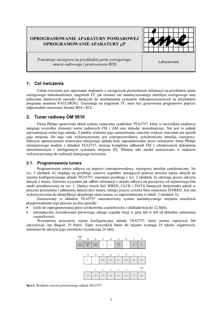 OPROGRAMOWANIE APARATURY POMIAROWEJ OPROGRAMOWANIE APARATURY µP Transmisja szeregowa na przykładzie portu szeregowego, tunera radiowego i preprocesora RDS Laboratorium 1. Cel ćwiczenia Celem ćwiczenia jest zapoznanie studentów z szeregowym przesyłaniem informacji na przykładzie portu szeregowego mikrokontrolera, magistrali I2C jak również nie standaryzowanego interfejsu szeregowego oraz pokazanie darmowych narzędzi służących do uruchamiania systemów mikroprocesorowych na przykładzie programu monitora PAULMON2. Transmisja na magistrali I2C musi być generowana programowo poprzez odpowiednie sterowanie liniami SDA i SCL. 2. Tuner radiowy OM 5610 Firma Philips opracowała układ scalony oznaczony symbolem TEA5757, który w niewielkiej strukturze integruje wszystkie elementy torów radiowych FM i AM oraz dekoder stereofoniczny. Nie jest to jednak najważniejsza cecha tego układu. Z punktu widzenia jego zastosowania, znacznie większe znaczenie ma sposób jego strojenia. Do tego celu wykorzystywany jest czteroprzewodowy, synchroniczny interfejs szeregowy. Dalszym uproszczeniem stosowania niniejszego układu było zaprojektowanie przez inżynierów firmy Philips miniaturowego modułu z układem TEA5757, tworząc kompletny odbiornik FM z wbudowanym dekoderem stereofonicznym i inteligentnym systemem strojenia [9]. Właśnie taki moduł zastosowano w makiecie wykorzystywanej do realizacji niniejszego ćwiczenia. 2.1. Programowanie tunera Programowanie tunera odbywa się poprzez czteroprzewodowy, szeregowy interfejs synchroniczny. Na rys. 3 (dodatek A) znajdują się przebiegi czasowe sygnałów sterujących podczas procesu zapisu danych do rejestru konfiguracyjnego układu TEA5757, natomiast przebiegi z rys. 2 (dodatek A) obrazują proces odczytu danych z tunera. Zarówno wysyłanie jak odbiór informacji z układu odbywa się począwszy od najstarszego bita ramki przedstawionej na rys. 1. Oprócz trzech linii WREN, CLCK i DATA biorących bezpośredni udział w procesie przesyłania i odbierania danych do/z tunera, istnieje jeszcze czwarta linia oznaczona STEREO. Jest ona wykorzystywana do identyfikacji aktualnego stanu tunera, co zaprezentowano w tabeli. 2 (dodatek A). Zastosowany w układzie TEA5757 zaawansowany system automatycznego strojenia umożliwia przeprowadzenie tego procesu na dwa sposoby: • ściśle do zaprogramowanej przez użytkownika częstotliwości z dokładnością do 12,5kHz, • automatyczne wyszukiwanie pierwszego silnego sygnału stacji w górę lub w dół od aktualnie ustawionej częstotliwości. Wewnętrzny przesuwny rejestr konfiguracyjny układu TEA5757, który można zapisywać lub odczytywać, ma długość 25 bitów. Zapis wszystkich bitów do rejestru wymaga 25 taktów zegarowych, natomiast do odczytu jego zawartości wystarczają 24 takty. MSB 24 Start strojenia 23 22 21 20 19 18 17 16 Kierunek Góra Doł Mono Stereo 0 0 Local DX 0 S0 S1 15 14 13 12 11 10 9 8 0 0 F13 F12 F11 F10 F9 F8 7 6 5 4 3 2 1 LSB 0 F7 F6 F5 F4 F3 F2 F1 F0 Rys.1. Struktura rejestru przesuwnego układu TEA5757 1 14 najmłodszych bitów (F0÷F13) służy do ustalania częstotliwości stacji radiowej i jest brane przez układ pod uwagę tylko wtedy, gdy użytkownik chce zaprogramować odbiór stacji o ściśle określonej częstotliwości (bit 24 = 0). Wagi poszczególnych bitów przedstawiono w tabeli 4 (dodatek A). Po ustaleniu kodu pożądanej częstotliwości należy dodać do niego wartość odpowiadającą częstotliwości 10,7MHz (częstotliwość pośrednia dla sygnału zmodulowanego częstotliwościowo). Dla przykładu kod odpowiadający częstotliwości 94,1MHz (Polskie Radio Program 3) wynosi 1D68H. Kod częstotliwości 10,7MHz wynosi 0358H. Zatem zapis wartości 20C0H na bitach F0÷F13 będącej sumą przedstawionych kodów pozwoli na dostrojenie tunera do częstotliwości 94,1MHz. Bit 15 nie jest używany. Dwa kolejne bity (16 i 17) służą do ustalania czułości systemu wyszukiwania zgodnie z tabelą 4 (dodatek A). Również bit 18 nie jest w niniejszej aplikacji wykorzystywany. Za pomocą bitu 19 ustalany jest tryb pracy bloku automatycznej regulacji wzmocnienia (ARW) – patrz tabela 3 (dodatek A). Dwa kolejne bity (20 i 21) wykorzystywane są do przełączania zakresów FM MW, LW lub SW. W niniejszej aplikacji mogą przyjąć tylko wartość 0 wybierając zakres FM w paśmie 88..108MHz. Bit 22 odpowiada za wymuszenie pracy dekodera w trybie monofonicznym (logiczne 0) lub zezwolenie na pracę w trybie stereo (logiczne 1), o ile odbierana stacja nadaje sygnał w takim trybie [9]. Wysłanie ramki sterującej z ustawiony bitem 24 w stan jedynki logicznej uruchamia automatyczne przeszukiwanie zakresu częstotliwości i dostrojenie się układu tunera do odbioru sygnału pierwszej napotkanej stacji radiowej. Kierunek strojenia (0 – w górę, 1 – w dół) od aktualnie ustawionej częstotliwości określa bit 23. UWAGA: Należy pamiętać, że po zapisie informacji do tunera a przed dokonaniem operacji odczytu należy do linii portu, do której jest podłączone wejście DATA tunera wpisać 1 w celu ustawienia jej jako wejście. 3. Podstawowe informacje o RDS 3.1. Zarys historyczny System RDS (ang. Radio Data System) powstał jako ułatwienie posługiwania się odbiornikiem UKF FM i jest stosowany do przesyłania dodatkowych informacji cyfrowych w trakcie nadawania audycji radiowych w paśmie UKF/FM (87,5..108MHz) [3]. Dane docierające do radioodbiorników wykorzystywane są m.in do strojenia urządzenia. Dzięki temu zazwyczaj nie sposób jest zauważyć, kiedy odbiornik przełączył się na odbiór z nadajnika o silniejszym sygnale odbieranej stacji [5]. Pierwsze prace nad stworzeniem systemu przekazującego dodatkowe informacje i zarazem nie powodującego zakłóceń przeprowadzone zostały pod koniec lat siedemdziesiątych XX wieku. Swoje projekty przygotowały takie kraje jak: Wielka Brytania, Szwecja, Finlandia, Holandia i Francja. Po przeprowadzeniu test