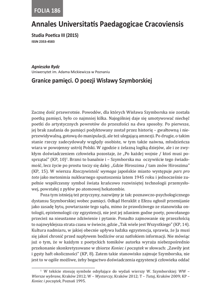 Folia 186 Annales Universitatis Paedagogicae Cracoviensis Studia Poetica III (2015) ISSN 2353-4583 Agnieszka Rydz Uniwersytet im. Adama Mickiewicza w Poznaniu Granice pamięci. O poezji Wisławy Szymborskiej Zacznę dość przewrotnie. Powodów, dla których Wisława Szymborska nie została poetką pamięci, było co najmniej kilka. Najogólniej daje się umotywować niechęć poetki do artystycznych powrotów do przeszłości na dwa sposoby. Po pierwsze, jej brak zaufania do pamięci podyktowany został przez historię – gwałtowną i nieprzewidywalną, gotową do manipulacji, ale też ulegającą amnezji. Po drugie, o takim stanie rzeczy zadecydowały względy osobiste, w tym także naiwna, młodzieńcza wiara w powojenny ustrój Polski. W zgodzie z żelazną logiką dziejów, ale i ze zwykłym doświadczeniem człowieka pozostaje, że „Po każdej wojnie / ktoś musi posprzątać” (KP, 10)1. Brzmi to banalnie i – Szymborska ma oczywiście tego świadomość, lecz życie po prostu toczy się dalej: „Gdzie Hiroszima / tam znów Hiroszima” (KP, 15). W wierszu Rzeczywistość wymaga japońskie miasto występuje pars pro toto jako metonimia nuklearnego spustoszenia latem 1945 roku i jednocześnie zupełnie współczesny symbol świata krańcowo rozwiniętej technologii przemysłowej, powstałej z pyłów po atomowej hekatombie. Poza tym istnieją też przyczyny, nazwijmy je tak: poznawczo-psychologicznego dystansu Szymborskiej wobec pamięci. Odkąd Heraklit z Efezu ogłosił przemijanie jako zasadę bytu, powtarzanie tego sądu, mimo że prawdziwego ze stanowiska ontologii, epistemologii czy egzystencji, nie jest jej zdaniem godne poety, powołanego przecież na nieustanne zdziwienie i pytanie. Ponadto zajmowanie się przeszłością to najzwyklejsza strata czasu w świecie, gdzie „Tak wiele jest Wszystkiego” (KP, 14). Kultura nadmiaru, w jakiej obecnie upływa ludzka egzystencja, sprawia, że Ja musi się jakoś chronić przed napływem bodźców oraz natłokiem informacji. Nie mówiąc już o tym, że w każdym z poetyckich tomików autorka wyraża niebezpośrednio przekonanie skonkretyzowane w zbiorze Koniec i początek w słowach: „Zawiły jest i gęsty haft okoliczności” (KP, 8). Zatem takie stanowisko zajmuje Szymborska, nie jest to w ogóle możliwe, żeby bogactwo doświadczenia egzystencji człowieka oddać W tekście stosuję symbole odsyłające do wydań wierszy W. Szymborskiej: WW – Wiersze wybrane, Kraków 2012; W – Wystarczy, Kraków 2012; T – Tutaj, Kraków 2009; KP – Koniec i początek, Poznań 1995. 1 [92] Agnieszka Rydz używając jednego tylko ściegu pamięci. Inna rzecz, że nitka pamięci kojarzy się z nicią „pani Atropos”, pracoholiczki, która ma „w świecie opinię najgorszą” (WW, 387). Na koniec pozostaje znana wszystkim osobista niechęć Wisławy Szymborskiej do upubliczniania prywatnej biografii. Przypuszczalnie, by uchronić się przed natrętami, poetka wymyśliła mit o słabej pamięci własnej, a nie miała wcale powodów, żeby na pamięć narzekać. Zwróćmy uwagę, że nasycenie jej wielogatunkowej twórczości (poezja, felieton, prace plastyczne) szczegółem, nierzadko humorystycznym (za przykład niech posłuży znany wierszu o tarsjuszu)2, musi prowadzić do wniosku wręcz przeciwnego. Świadczy nie tyle o pamięci dobrej, co wręcz – znakomitej. W tym miejscu przytoczmy anegdotę, którą Szymborska powtórzyła swoim biografkom, by już na wstępie zniechęcić dziennikarki do pomysłu opracowywania jej wspomnień. Brzmi ona następująco i warto się jej dokładniej przyjrzeć: Zobaczyłam kiedyś w filmie Buñuela osobliwą scenę. Fernando Rey, ulubiony aktor Buñuela, zawsze z bródką, zawsze lekko lubieżny idzie ulicą, a w załomie muru siedzi starucha z rozpuszczonymi siwymi włosami. W ręku trzyma tamborek, na który naciągnięta jest ociekająca pomyjami szmata. Chichocząc w bezzębnym uśmiechu, cudownym jedwabiem haftuje na tej szmacie lilie. Oto scena, która usprawiedliwia istnienie kina – powtarzałam przyjaciołom. A potem ten film pokazano w telewizji. Patrzę, idzie ulicą Rey, żadnej staruchy nie ma, jest kobieta, dosyć młoda, która rozciąga na szmatach ślubne welony. Tak że przestrzegam: w najlepszej wierze mogę opowiadać rzeczy, których nie było3. Ktoś mógłby próbować podważyć tezę o znakomitej pamięci poetki, korzystając z przytoczonej właśnie anegdoty biograficznej, obrawszy za argument odkształcenia fabularne między sceną zapamiętaną przez autorkę Wielkiej liczby (1976) a przebiegiem zdarzeń w autentycznym filmie Buñuela. Lecz gdy o logiczną ścisłość idzie, paradoksalnie, w cytowanej opowieści obserwujemy zgodność między wspomnieniem a dziełem; dotyczy ona głównych elementów obu narracji: w każdej z nich występują mężczyzna (Rey) i kobieta (rozkładająca tkaninę). Również biografki noblistki żywo obchodziła pamięć poetki, a przygotowując książkę podpatrzyły nawet mechanizm jej funkcjonowania. Otóż, specyficzną właściwością memorii Szymborskiej było, a w kontekście już powiedzianego (z uwzględnieniem anegdoty o filmie Buñuela) nie ma w tym odkryciu żadnego zaskoczenia, że „wydobywała Chodzi o wiersz pt. Tarsjusz, w którym formuła rozpoczęcia utworu: „Ja tarsjusz, syn tarsjusza / wnuk tarsjusza i prawnuk” (WW, 149), niczym fragment z dynastycznej opowieści przywodzi na myśl królewskie pochodzenie „bohatera” tekstu. Nie dziwi więc przypuszczenie Stanisława Balbusa, że tytułowa postać to dyplomata albo filozof ze starożytności. Rzeczywisty „tarsjusz” należy do gatunku małpiatek żyjących na Madagaskarze. Polska nazwa: „wyrak upiór” bierze się z przerażającej oprawy ogromnych oczu zwierzęcia. Zob. S. Balbus, Świat ze wszystkich stron świata. O Wisławie Szymborskiej, Kraków 1996, s. 155–156. 2 A. Bikont, J. Szczęsna, Pamiątkowe rupiecie. Biografia Wisławy Sz
