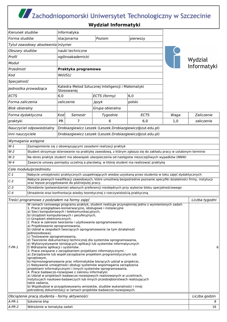 [ logo uczelni ] Wydział Informatyki Kierunek studiów Informatyka Forma studiów stacjonarna Poziom pierwszy Tytuł zawodowy absolwenta inżynier Obszary studiów nauki techniczne Profil ogólnoakademicki Moduł Przedmiot Praktyka programowa Kod WI/I/S1/ Specjalność Jednostka prowadząca Katedra Metod Sztucznej Inteligencji i Matematyki Stosowanej ECTS 6,0 ECTS (formy) 6,0 Forma zaliczenia zaliczenie Język polski Blok obieralny Forma dydaktyczna Grupa obieralna Kod Semestr Tygodnie ECTS Waga Zaliczenie praktyki PR 7 6 6,0 1,0 zaliczenie Nauczyciel odpowiedzialny Drobiazgiewicz Leszek ([email protected]) Inni nauczyciele Drobiazgiewicz Leszek ([email protected]) Wymagania wstępne W-1 Zaznajomienie się z obowiązującymi zasadami realizacji praktyk W-2 Student otrzymuje skierowanie na praktykę zawodową, z którym zgłasza się do zakładu pracy w ustalonym terminie W-3 Na okres praktyk student ma obowiązek ubezpieczenia od następstw nieszczęśliwych wypadków (NNW) W-4 Zawarcie umowy pomiędzy uczelnią a placówką, w której student ma realizować praktykę Cele modułu/przedmiotu C-1 Nabycie umiejętności praktycznych uzupełniających wiedzę uzyskaną przez studenta w toku zajęć dydaktycznych C-2 Nabycie pewnych kwalifikacji zawodowych, które umożliwią bezpośrednie poznanie specyfiki działalności firmy, instytucji oraz lepsze przygotowanie do późniejszej pracy. C-3 Określenie (potwierdzenie) własnych preferencji niezbędnych przy wyborze bloku specjalnościowego C-4 Utrwalenie oraz konfrontacja wiedzy teoretycznej z rzeczywistością praktyczną Treści programowe z podziałem na formy zajęć T-PR-1 Liczba tygodni W ramach ramowego programu praktyk, student realizuje przynajmniej jedno z wymienionych zadań: 1. Prace przeglądowo-konserwacyjne, obsługowe i instalacyjne a) Sieci komputerowych i telekomunikacyjnych, b) Urządzeń komputerowych i peryferyjnych, c) Urządzeń elektronicznych. 2. Prace w zakresie tworzenia i użytkowania oprogramowania: a) Projektowanie oprogramowania, b) Udział w zespołach tworzących oprogramowanie (w tym działalność jednoosobowa), c) Testowanie oprogramowania, d) Tworzenie dokumentacji technicznej dla systemów oprogramowania, e) Wykorzystywanie istniejących aplikacji lub systemów informatycznych f) Wdrażanie aplikacji i systemów. 3. Prace związane z zarządzaniem projektami informatycznymi : a) Zarządzanie lub współ-zarządzanie projektem programistycznym lub sprzętowym, b) Harmonogramowanie prac informatyków biorących udział w projekcie, c) Nabywanie umiejętności obsługi systemów wspomagania zarządzania projektami informatycznymi i innych systemów oprogramowania. 4. Prace badawczo-rozwojowe z zakresu informatyki: a) Udział w projektach badawczo-rozwojowych realizowanych w uczelniach, instytucjach naukowo-badawczych lub innych przedsiębiorstwach realizujących takie zadania, b) Współudział w przygotowywaniu wniosków, studiów wykonalności i innej potrzebnej dokumentacji w ramach projektów badawczo-rozwojowych. Obciążenie pracą studenta - formy aktywności A-PR-1 Szkolenie bhp A-PR-2 Wdrożenie w tematykę zadań 6 Liczba godzin 8 16 [ logo uczelni ] Wydział Informatyki Obciążenie pracą studenta - formy aktywności Liczba godzin A-PR-3 Realizacja zadań zgodnych merytorycznie z przynajmniej jednym punktem ramowego programu praktyk dla kierunku Informatyka A-PR-4 Rejestracja przebiegu praktyki w formie dzienniczka praktyk 150 6 Metody nauczania / narzędzia dydaktyczne Spotkanie informacyjne zaznajamiające studentów z zasadami obowiązującymi przy realizacji praktyk, ich obowiązkami, prawami oraz obowiązkami praktykodawcy. Spotkanie przeprowadza pełnomocnik dziekana ds. praktyk Zapoznanie studenta z tematyką realizowanych zadań, przez zakładowego opiekuna praktyk. Metody nauczania mogą być różne (objaśnienie, szkolenie itd.) M-1 M-2 M-3 Przez okres trwania praktyk kontrola zakładowego opiekuna Sposoby oceny (F - formująca, P - podsumowująca) S-1 P Weryfikacja dzienniczka praktyk S-2 P Pytania dotyczące realizowanych przez studenta zadań Zamierzone efekty kształcenia Odniesienie do efektów kształcenia dla kierunku studiów Odniesienie do efektów zdefiniowanych dla obszaru kształcenia Odniesienie do efektów kształcenia prowadzących do Cel uzyskania tytułu przedmiotu zawodowego inżyniera Treści programowe Metody nauczania Sposób oceny M-2 M-3 S-1 S-2 M-2 M-3 S-2 Wiedza I_1A_P_W01 Student powinien posiadać wiedzę odnośnie zrealizowanych zadań praktycznych I_1A_P_W02 Student powinien posiadać rozeznanie odnośnie swoich preferencji oraz charakteru ewentualnej przyszłej pracy I_1A_P_W03 Student powinien posiadać rozeznanie odnośnie relacji pomiędzy potrzebami rynku a wiedzą zdobywaną w trakcie edukacji C-1 C-4 T-PR-1 C-2 C-3 C-4 Umiejętności I_1A_P_U01 Student potrafi w sposób praktyczny wykorzystać wiedzę, zdobytą w dotychczasowym toku studiów, do konkretnego zastosowania, zgodnego z przynajmniej jednym punktem ramowego programu praktyk T-PR-1 I_1A_U12 I_1A_U20 T1A_U01 T1A_U05 T1A_U07 T1A_U11 InzA_U04 I_1A_K06 T1A_K03 T1A_K06 InzA_K02 C-1 Inne kompetencje społeczne i personalne I_1A_P_K01 ma kompetencje otwartości i współpracy w innym środowisku niż szkoła Efekt Ocena Kryterium oceny Wiedza I_1A_P_W01 I_1A_P_W02 I_1A_P_W03 Umiejętności 2,0 3,0 3,5 4,0 4,5 5,0 2,0 3,0 3,5 4,0 4,5 5,0 2,0 3,0 3,5 4,0 4,5 5,0 ma niezbędną wiedzę zgodną z zakresem praktyki Student zna preference w zkresie praktycznyego zakresu ewentualnej przyszłej pracy Student zna i potrafi określić relacje pomiędzy potrzebami rynku a wiedzą zdobywaną w trakcie edukacji [ logo uczelni ] Wydział Informatyki Umiejętności I_1A_P_U01 2,0 3,0 Student potrafi w sposób praktyczny wykorzystać wiedzę, zdobytą w dotychczasowym toku studiów, do konkretnego zastosowania, zgodnego z przynajmniej jednym punktem ramowego programu praktyk oraz wypełnił dzienniczek prakt
