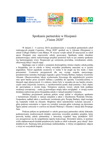 Otwórz się na zmiany ! Spotkanie partnerskie w Hiszpanii „Vision 2020” W dniach 2 - 4 czerwca 2015r przedstawiciele z wszystkich partnerskich szkół realizujących projekt Comenius „Wizja 2020” spotkali się w Alicante (Hiszpania) w szkole Collegio Publico Costa Blanca. W wizycie wzięło udział 20 nauczycieli ze szkół spoza Hiszpanii oraz nauczyciele szkoły goszczącej. Spotkanie miało charakter podsumowujący całość realizowanego projektu ponieważ było to już ostatnie spotkanie wg harmonogramu wizyt. Rozpoczęto go ceremonią powitalną, zwiedzaniem szkoły, obserwacją lekcji i innych zajęć. Spędzając czas w szkole z uznaniem dostrzegliśmy różnice między szkołą polską a hiszpańską: jest to szkoła w której wszystkie przedmioty nauczane są w języku angielskim. Nawet najmłodsi uczniowie w wieku 6 lat mogli się bez trudu z mani porozumieć. Uczniowie przygotowali dla nas występ zespołu muzycznego, przedstawienie teatralne ilustrujące legendę o górze Świętej Barbary, będącej wizytówka Alicante. Obserwowaliśmy lekcje wychowania fizycznego dla najmłodszych uczniów oraz sport bardzo przez uczniów lubiany a podobny do squosha. Uczestniczyliśmy w lekcjach zajęć plastycznych. Co ciekawe, dzieci były w stosunku do nas bardzo otwarte, często same inicjowały rozmowy, z zaciekawieniem pytały skąd jesteśmy i były chętne do opowiadania o swoim kraju. Nietypowo podczas wizyty szkoła była poddana ewaluacji zewnętrznej – osoby ją prowadzące mogły także uwzględnić w swojej ocenie działania realizowane przez hiszpańską szkołę w ramach projektu Comenius. Mieliśmy przyjemność podczas pobytu wziąć udział w oficjalnym spotkaniu z burmistrzem Alicante w ratuszu miejskim a także z Dyrektorem Wydziału Oświaty. Gospodarze zadbali także o możliwość zwiedzenia góry Świętej Barbary, skąd rozciąga się wspaniały widok na Alicante. Mogliśmy także samodzielnie wykonać naczynia z gliny podczas warsztatów w Agost czy zwiedzić warsztat gdzie wykonuje się drewniane figury palone corocznie w czerwcu na ulicach Walencji i Alicante z okazji dnia Świętego Jana. Podczas pobytu na spotkaniach w szkole goszczącej partnerskie szkoły dokonały podsumowania zrealizowanych działań, omówiono wszystkie produkty projektu, które pozwolą każdej szkole partnerskiej z łatwością wypełnić bazę produktów EST czy przygotować się do uzupełnienia raportu końcowego. Stwierdzić należy, iż pomimo wielu zaplanowanych działań projektowych, każda ze szkól wykonała „przy okazji” dużo dodatkowych. Ilustracją była prezentacja multimedialna, w której uwzględniono zdjęcia z wizyt we wszystkich krajach. Projekt, który niedługo kończymy należy zaliczyć do bardzo udanych ponieważ osiągnięto cele jakie na początku zaplanowano. Przyjaźnie i kontakty z nauczycielami poznanymi podczas tej wielostronnej współpracy naszych szkół będą nadal kontynuowane.
