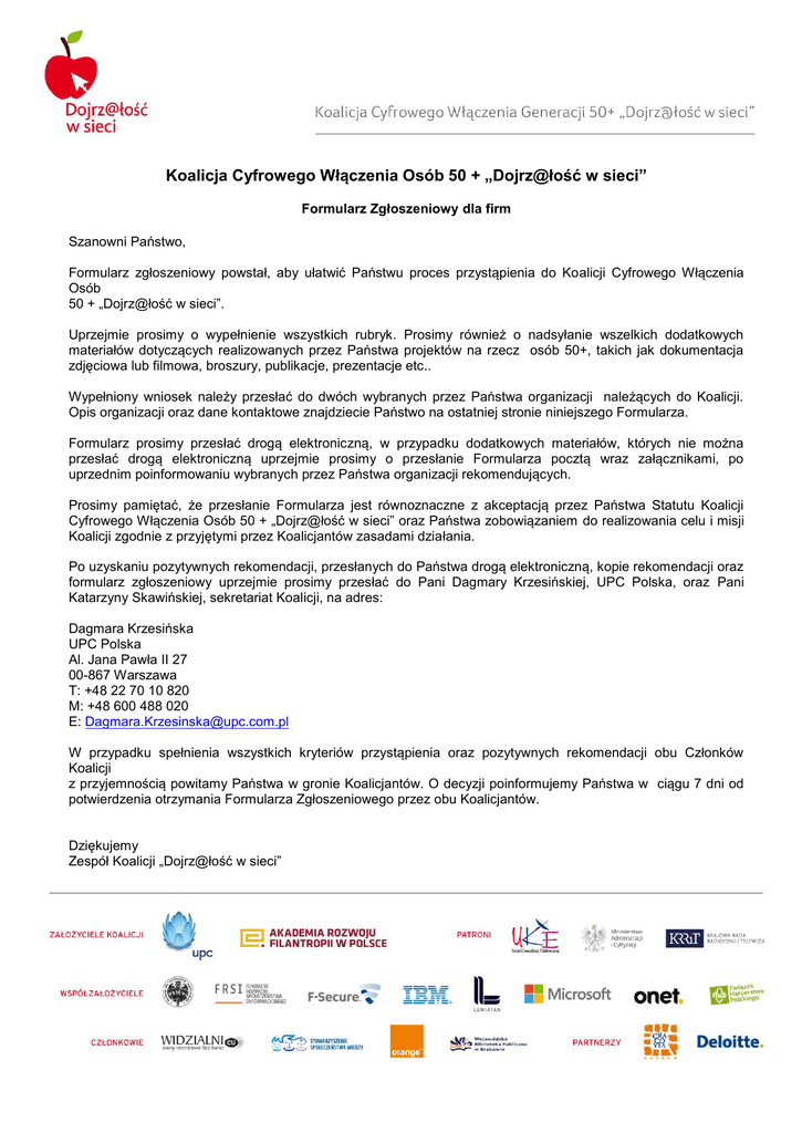 Koalicja Cyfrowego Włączenia Osób 50 + „Dojrz@łość w sieci” Formularz Zgłoszeniowy dla firm Szanowni Państwo, Formularz zgłoszeniowy powstał, aby ułatwić Państwu proces przystąpienia do Koalicji Cyfrowego Włączenia Osób 50 + „Dojrz@łość w sieci”. Uprzejmie prosimy o wypełnienie wszystkich rubryk. Prosimy również o nadsyłanie wszelkich dodatkowych materiałów dotyczących realizowanych przez Państwa projektów na rzecz osób 50+, takich jak dokumentacja zdjęciowa lub filmowa, broszury, publikacje, prezentacje etc.. Wypełniony wniosek należy przesłać do dwóch wybranych przez Państwa organizacji należących do Koalicji. Opis organizacji oraz dane kontaktowe znajdziecie Państwo na ostatniej stronie niniejszego Formularza. Formularz prosimy przesłać drogą elektroniczną, w przypadku dodatkowych materiałów, których nie można przesłać drogą elektroniczną uprzejmie prosimy o przesłanie Formularza pocztą wraz załącznikami, po uprzednim poinformowaniu wybranych przez Państwa organizacji rekomendujących. Prosimy pamiętać, że przesłanie Formularza jest równoznaczne z akceptacją przez Państwa Statutu Koalicji Cyfrowego Włączenia Osób 50 + „Dojrz@łość w sieci” oraz Państwa zobowiązaniem do realizowania celu i misji Koalicji zgodnie z przyjętymi przez Koalicjantów zasadami działania. Po uzyskaniu pozytywnych rekomendacji, przesłanych do Państwa drogą elektroniczną, kopie rekomendacji oraz formularz zgłoszeniowy uprzejmie prosimy przesłać do Pani Dagmary Krzesińskiej, UPC Polska, oraz Pani Katarzyny Skawińskiej, sekretariat Koalicji, na adres: Dagmara Krzesińska UPC Polska Al. Jana Pawła II 27 00-867 Warszawa T: +48 22 70 10 820 M: +48 600 488 020 E: [email protected] W przypadku spełnienia wszystkich kryteriów przystąpienia oraz pozytywnych rekomendacji obu Członków Koalicji z przyjemnością powitamy Państwa w gronie Koalicjantów. O decyzji poinformujemy Państwa w ciągu 7 dni od potwierdzenia otrzymania Formularza Zgłoszeniowego przez obu Koalicjantów. Dziękujemy Zespół Koalicji „Dojrz@łość w sieci” 1. Pełna nazwa Firmy: 2. Pełny Adres Firmy: Ulica: Miejscowość: Kod pocztowy: Powiat/Województwo: Telefon/fax: Strona www: 3. Adres do korespondencji (jeżeli jest inny niż powyżej): Ulica: Miejscowość: Kod pocztowy: Powiat/Województwo: Telefon/fax: 4. Dane kontaktowe do osoby lub osób reprezentujących Firmę w Koalicji: Imię i nazwisko Funkcja w organizacji Numer telefonu Adres email 5. Zasięg terytorialny działalności Firmy prowadzonej na terytorium Polski: 6. Przedmiot działalności Firmy: (prosimy o opis działalności Państwa Firmy) 7. Opis działalności Firmy na rzecz osób 50+ w zakresie włączenia cyfrowego: (prosimy o opis Państwa dobrych praktyk i projektów prowadzonych na rzecz seniorów związanych z nowymi technologiami. Jeżeli posiadają Państwo publikacje, ulotki lub raporty związane z prowadzonymi przez Państwa projektami oraz dokumentację zdjęciową lub filmową uprzejmie prosimy o przesłanie jej w osobnym pliku) 8. Organizacje rekomendujące (prosimy o zaznaczenie Państwa wyboru znakiem X ) Członek Koalicji Zaznaczenie wyboru Akademia Rozwoju Filantropii w Polsce F-Secure Sp. z o.o. Fundacja dla Uniwersytetu Jagiellońskiego Fundacja Rozwoju Społeczeństwa Informacyjnego IBM Polska Microsoft Sp. z o.o. Onet.pl S.A. Polska Konfederacja Pracodawców Prywatnych LEWIATAN UPC Polska Sp. z o.o. Związek Harcerstwa Polskiego 9. Dane kontaktowe osoby lub osób zgłaszających kandydaturę organizacji. Imię i nazwisko Funkcja w organizacji Numer telefonu Adres e-mail Lista Koalicjantów, do których można składać formularz zgłoszeniowy: Założyciele: UPC Polska jest wiodącym dostawcą potrójnej usługi: telewizji kablowej, szerokopasmowego dostępu do Internetu i usług telefonicznych dla klientów indywidualnych i biznesowych. W zasięgu sieci telewizji kablowej UPC znajdują się ponad 2 mln gospodarstw domowych w dziesięciu największych aglomeracjach miejskich i wielu mniejszych miastach. UPC Polska jest częścią Liberty Global, Inc., międzynarodowego lidera usług szerokopasmowych. Akademia e-Seniora UPC to program społeczny, którego celem jest przeciwdziałanie wykluczeniu technologicznemu osób 50+. W ramach akcji powstało 10 pracowni UPC w 9 miastach Polski oraz autorski program nauczania obsługi komputera i internetu, dzięki któremu przeszkolono już kilka tysięcy osób. Więcej informacji: www.upc.pl oraz www.akademiaeseniora.pl Osoba kontaktowa: Dagmara Krzesińska, adres e-mail: [email protected] Stowarzyszenie Akademia Rozwoju Filantropii w Polsce jest niezależną, nienastawioną na zysk organizacją pozarządową działająca od 1998 roku. Akademia inwestuje w grupy obywateli i organizacje pozarządowe, aby miały one możliwość rozwijania swoich społeczności oraz przejęcia odpowiedzialności za siebie i innych. Udziela wsparcia finansowego, szkoleniowego, doradczego oraz rzeczowego. Adresatami jej programów są również samorządy, media i opinia publiczna. Ważnym obszarem działalności Akademii są inicjatywy koncentrujące się na wspieraniu aktywności społecznej i zawodowej osób starszych. Akademia promuję edukację przez całe życie i korzyści płynące ze współpracy międzypokoleniowej oraz działania zajmujące się przeciwdziałaniem dyskryminacji ze względu na wiek. Więcej informacji: www.filantropia.org.pl Osoba kontaktowa: Paweł Łukasiak, adres e-mail: [email protected] Współzałożyciele: Fundacja dla Uniwersytetu Jagiellońskiego wspomaga rozwój społeczeństwa obywatelskiego poprzez promocję edukacji na poziomie uniwersyteckim. Fundacja kreuje i pomaga zrealizować marzenie o studiach na Uniwersytecie Jagiellońskim – Alma Mater uczelni polskich oraz wspiera Uniwersytet i integruje środowisko absolwentów. Fundacja została powołana do życia w 1988 roku jako jedna z pierwszych 