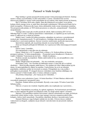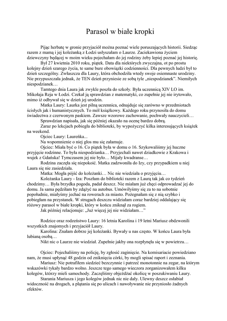 Parasol w białe kropki Pijąc herbatę w gronie przyjaciół można poznać wiele poruszających historii. Siedząc razem z mamą i jej koleżanką z Łodzi usłyszałam o Laurze. Zaciekawiona życiem dziewczyny będącej w moim wieku pojechałam do jej rodziny żeby lepiej poznać jej historię. Był 27 kwietnia 2010 roku, piątek. Data dla niektórych zwyczajna, ot po prostu kolejny dzień szarego życia, te same bure obowiązki codzienności. Dla pewnych ludzi był to dzień szczególny. Zwłaszcza dla Laury, która obchodziła wtedy swoje osiemnaste urodziny. Nie przypuszczała jednak, że TEN dzień przyniesie ze sobą tyle „niespodzianek”. Niemiłych niespodzianek… Tamtego dnia Laura jak zwykle poszła do szkoły. Była uczennicą XIV LO im. Mikołaja Reja w Łodzi. Czekał ją sprawdzian z matematyki, co zupełnie jej nie irytowało, mimo iż odbywał się w dzień jej urodzin. Matka Laury: Laurka jest pilną uczennica, odnajduje się zarówno w przedmiotach ścisłych jak i humanistycznych. To mól książkowy. Każdego roku przynosiła do domu świadectwa z czerwonym paskiem. Zawsze wzorowe zachowanie, pochwały nauczycieli… Sprawdzian napisała, jak się później okazało na ocenę bardzo dobrą. Zaraz po lekcjach pobiegła do biblioteki, by wypożyczyć kilka interesujących książek na weekend. Ojciec Laury: Laureńka... Na wspomnienie o niej głos mu się załamuje. Ojciec: Miała być o 16. Co piątek była w domu o 16. Szykowaliśmy jej huczne przyjęcie rodzinne. To była niespodzianka… Przyjechali nawet dziadkowie z Krakowa i wujek z Gdańska! Tymczasem jej nie było… Mijały kwadranse… Rodzina zaczęła się niepokoić. Matka zadzwoniła do Izy, czy przypadkiem u niej Laura się nie zasiedziała. Matka: Mogła pójść do koleżanki… Nic nie wiedziała o przyjęciu… Koleżanka Laury - Iza: Poszłam do biblioteki razem z Laurą tak jak co tydzień chodzimy… Była brzydka pogoda, padał deszcz. Nie miałam już chęci odprowadzać jej do domu. Ja sama pędziłam by zdążyć na autobus. Umówiłyśmy się za to na sobotnie popołudnie, miałyśmy jechać na rowerach za miasto. Pożegnałam się z nią szybko i pobiegłam na przystanek. W strugach deszczu widziałam coraz bardziej oddalający się różowy parasol w białe kropki, który w końcu zniknął za rogiem. Jak później relacjonuje: „Już więcej jej nie widziałam…” Rodzice oraz rodzeństwo Laury: 16 letnia Karolina i 19 letni Mariusz obdzwonili wszystkich znajomych i przyjaciół Laury. Karolina: Znałam dobrze jej koleżanki. Bywały u nas często. W końcu Laura była lubianą osobą… Nikt nic o Laurze nie wiedział. Zupełnie jakby ona rozpłynęła się w powietrzu… Ojciec: Pojechaliśmy na policję, by zgłosić zaginięcie. Na komisariacie powiedziano nam, że musi upłynąć 48 godzin od zniknięcia córki, by mogli spisać raport i zeznania. Mariusz: Nie potrafiłem siedzieć bezczynnie i patrzeć monotonnie na zegar, na którym wskazówki tykały bardzo wolno. Jeszcze tego samego wieczora zorganizowałem kilku kolegów, którzy mieli samochody. Zaczęliśmy objeżdżać okolicę w poszukiwaniu Laury. Starania Mariusza i jego kolegów jednak nic nie dały. Ulewny deszcz osłabiał widoczność na drogach, a plątania się po ulicach i nawoływanie nie przyniosło żadnych efektów. Następnego dnia Karolina wpadła na pomysł by rozwiesić informację o zaginięciu siostry. Karolina: Jestem taka jak Mariusz. Nie mogę siedzieć bezczynnie. Znalazłam aktualne zdjęcie Laury, wydrukowałam na komputerze, opisałam jej wygląd. Miała wtedy na sobie ciemne dżinsy, czarny płaszczyk i szare tenisówki. I jeszcze ten różowy parasol w białe kropki… Babcia jej kupiła kiedyś i miała do niego sentyment. Karolina wraz z Mariuszem i mamą udali się do punktu ksero gdzie informację o zaginięciu skserowali jak wspominają około tysiąc razy. Mama: Jeździliśmy po całym mieście i umieszczaliśmy te kartki gdzie tylko się dało. Staraliśmy się je rozwieszać w miejscach najczęściej uczęszczanych, by mogła je zobaczyć jak największa ilość osób. Dawaliśmy je w restauracjach, kinach, barach, sklepach, klubach. Wszędzie… W niedzielę zgłosili zaginięcie. Ojciec: Policjant spisał protokół i powiedział tą fałszywą formułkę: „Zrobimy wszystko, co w naszej mocy, by znaleźć pańską córkę.”. Akurat! Tata Laury był największym sceptykiem w tej sprawie. Nie pokładał wielu nadziei w staraniach policji. Pragnął przekonać rodzinę, by wynająć prywatnego detektywa. Ojciec: Śledztwo policji szło mozolnie. Przez pierwszy tydzień nie znaleźli ŻADNYCH tropów, poszlak czy dowodów. Kompletnie nic. Jednak żona wybiła mu to z głowy. Matka: Nie mieliśmy tylu pieniędzy, by opłacać prywatnego detektywa… Ojcu Laury udało się przekonać innych członków rodziny, którzy zdecydowali się pokryć koszty wynajęcia profesjonalnego detektywa. Mimo ich starań nawet śledztwo agencji detektywistycznej nie przyniosło żadnych pożądanych efektów. W lokalnej prasie i telewizji zaczęło huczeć od plotek o zaginięciu Laury. Jak się później okazało sprawcą tego zamieszania był właśnie Mariusz. Mariusz: Tygodnie mijały. Nie było żadnych nowych informacji w sprawie zaginięcia Laury… Byłem bezradny. Nic nie mogłem zrobić. Aż nagle wpadłem na pomysł, by w mediach podać informację o Laurce. Do domu państwa R. przyjechali dziennikarze i reporterzy. Zaczęli przeprowadzać wywiady, robić zdjęcia. Matka: Obudziła się we mnie nadzieja… Po tygodniu od umieszczeniu pierwszej informacji o zaginięciu Laury zadzwonił telefon. W domu był wtedy tylko Mariusz i to on odebrał telefon. Mariusz: Rozmawiałem z jakaś kobietą, nie chciała powiedzieć kim jest. Powiedziała jedynie, że na wylotówce na Warszawę widziała dziewczynę podobną do opisu z gazet i telewizji, która łapała autostop. Miała ze sobą różowy p