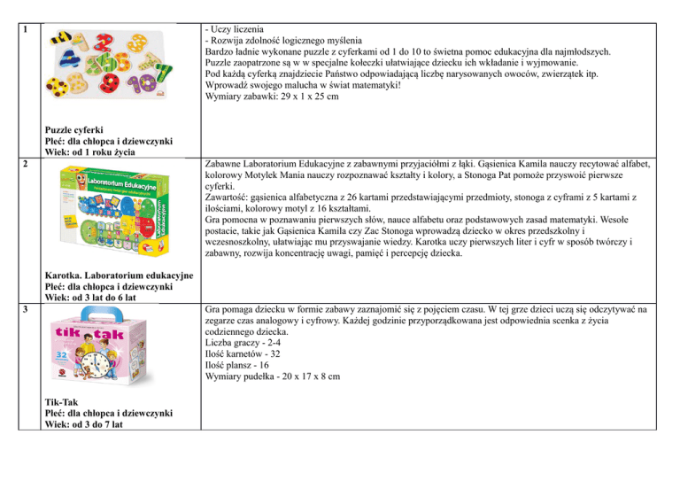 1 - Uczy liczenia - Rozwija zdolność logicznego myślenia Bardzo ładnie wykonane puzzle z cyferkami od 1 do 10 to świetna pomoc edukacyjna dla najmłodszych. Puzzle zaopatrzone są w w specjalne kołeczki ułatwiające dziecku ich wkładanie i wyjmowanie. Pod każdą cyferką znajdziecie Państwo odpowiadającą liczbę narysowanych owoców, zwierzątek itp. Wprowadź swojego malucha w świat matematyki! Wymiary zabawki: 29 x 1 x 25 cm Puzzle cyferki Płeć: dla chłopca i dziewczynki Wiek: od 1 roku życia 2 Zabawne Laboratorium Edukacyjne z zabawnymi przyjaciółmi z łąki. Gąsienica Kamila nauczy recytować alfabet, kolorowy Motylek Mania nauczy rozpoznawać kształty i kolory, a Stonoga Pat pomoże przyswoić pierwsze cyferki. Zawartość: gąsienica alfabetyczna z 26 kartami przedstawiającymi przedmioty, stonoga z cyframi z 5 kartami z ilościami, kolorowy motyl z 16 kształtami. Gra pomocna w poznawaniu pierwszych słów, nauce alfabetu oraz podstawowych zasad matematyki. Wesołe postacie, takie jak Gąsienica Kamila czy Zac Stonoga wprowadzą dziecko w okres przedszkolny i wczesnoszkolny, ułatwiając mu przyswajanie wiedzy. Karotka uczy pierwszych liter i cyfr w sposób twórczy i zabawny, rozwija koncentrację uwagi, pamięć i percepcję dziecka. Karotka. Laboratorium edukacyjne Płeć: dla chłopca i dziewczynki Wiek: od 3 lat do 6 lat 3 Gra pomaga dziecku w formie zabawy zaznajomić się z pojęciem czasu. W tej grze dzieci uczą się odczytywać na zegarze czas analogowy i cyfrowy. Każdej godzinie przyporządkowana jest odpowiednia scenka z życia codziennego dziecka. Liczba graczy - 2-4 Ilość karnetów - 32 Ilość plansz - 16 Wymiary pudełka - 20 x 17 x 8 cm Tik-Tak Płeć: dla chłopca i dziewczynki Wiek: od 3 do 7 lat 4 Dodawanie na straganie Płeć: dla chłopca i dziewczynki Wiek: od 4 do 8 lat 5 Kolorowy alfabet – nauka przez patrzenie i kojarzenie Płeć: dla chłopca i dziewczynki Wiek: od 4 lat Gra dla starszych przedszkolaków i uczniów rozpoczynających swoją przygodę z matematyką. Ta świetna gra edukacyjna, która łączy zabawę z wykonywaniem podstawowych działań matematycznych, w tym dodawania. Gracze układają puzzle, za każde poprawne rozwiązanie układanki otrzymują owoce. Zwycięża osoba, która zbierze największą ilość owocowych punktów. Skutecznie i szybko uczy dodawania. Uczy również innych umiejętności matematycznych z zakresu podstawowych zagadnień. Obrazowo tłumaczy pojęcie liczby, dzięki czemu dzieci w łatwy sposób przyswajają wiedzę. Ćwiczy i rozwija: logiczne myślenie, koordynację wzrokowo-ruchową, a także zdolności manualne. Gra jest ciekawa i w atrakcyjny sposób łączy naukę z zabawą. Liczba graczy: 2-4 Liczba elementów: 48 Wymiary planszy: 40,5 x 26 cm Puzzle duże i plakat To tablice o rozmiarach 67x47 cm. Na obu umieszczone są duże i małe litery w porządku alfabetycznym i zdjęcia zawierające te literki w swojej nazwie. Literki przedstawione są w formie "drukowanej" i "pisanej". Puzzle małe To 32 tabliczki z literką i odpowiadającym jej obrazkiem. Każda tabliczka składa się z dwóch łączonych części na jednej jest literka, na drugiej obrazek. Książeczka Zawiera ponad 140 obrazków podzielonych na grupy w zależności od litery występującej w nazwie danego obrazka. Każdy obrazek jest podpisany z wyróżnieniem poznawanej litery. Każda grupa jest oznaczona dużą i małą literą "drukowaną" i "pisaną". Pudełko zawiera: • 35 szt. dużych puzzli • 64 szt. małych puzzli • plakat • książeczka • instrukcja Liczba graczy: 1 i więcej Instrukcja: polska Wymiary pudełka: 395x265x60 mm 6 Nauka pisania – 20 kart z ćwiczeniami Płeć: dla chłopca i dziewczynki Wiek: od 4 do 6 lat 7 20 kart z ćwiczeniami uczącymi podstaw pisania. Nauka pisania może być zabawna i przyjemna! Dzieci od 4 do 6 lat przygotowują się do nauki pisania, rozwijając niezbędne do tego umiejętności: koordynacje wzrokowo-manualną i panowanie nad ruchami ręki. Ta gra pragnie być użyteczną i jednocześnie zabawną pomocą w tej fazie rozwoju dziecka: zawiera 10 tablic z sympatycznymi rysunkami i proponuje ponad 20 zadań podzielonych na 3 stopnie trudności, tak aby stopniowo ćwiczyć odtwarzanie linii, liter a na końcu całych słów. Wszystkie tablice są zmywalne, aby dziecko mogło powtarzać ćwiczenie wielokrotnie. Zawartość - 10 tablic z ponad 20 zadaniami podzielonymi na 3 stopnie trudności - Zmywalny pisak - 32 karty z literami alfabetu Mój dom – puzzle Płeć: dla chłopca i dziewczynki Wiek: od 4 do 7 lat Puzzle edukacyjne, które przypadną do gustu każdemu dziecku. Sprawdzą się zarówno w przedszkolu, szkole, jak i w domu. Dzięki nim maluch nie tylko zdobywa wiedzę o otaczającym go świecie, ale również ćwiczy pamięć i koncentrację. Zadaniem dziecka jest ułożenie z puzzli planszy, która przedstawia różne pomieszczenia znajdujące się w domu. Następnie, należy dopasować przedmioty, które powinny znajdować się w poszczególnych pokojach. Czy fotel powinien znajdować się w kuchni? Czy telewizor wstawimy do łazienki? A może szczoteczkę do zębów umiejscowimy w łazience? Liczba graczy: 2-4 Ilość plansz: 1 Wymiary pudełka: 20 x 12,5 x 17,5 cm Tangram kolisty Płeć: dla chłopca i dziewczynki Wiek: od 7 lat Zabawka logiczna dla osób w każdym wieku. Rozwijanie kreatywności i wyobraźni geometrycznej. Kolisty tangram to klasyczna zabawka o historii sięgającej trzech tysięcy lat. Ta pozornie prosta gra wywodzi się ze starożytnych Chin. Prezentowany tangram to koło podzielone na 10 części (cztery trójkąty i sześć wycinków koła). Z tych elementów tworzy się najrozmaitsze wzory – swoje własne lub zaproponowane przez producenta (przedmioty, rośliny, zwierzęta, ludzkie postacie). Klasyczna wersja tangramu posiada kształt kwadratu, który został podzielony na 7 elementów (tzw. tanów, stąd nazwa tangram). Z tyc