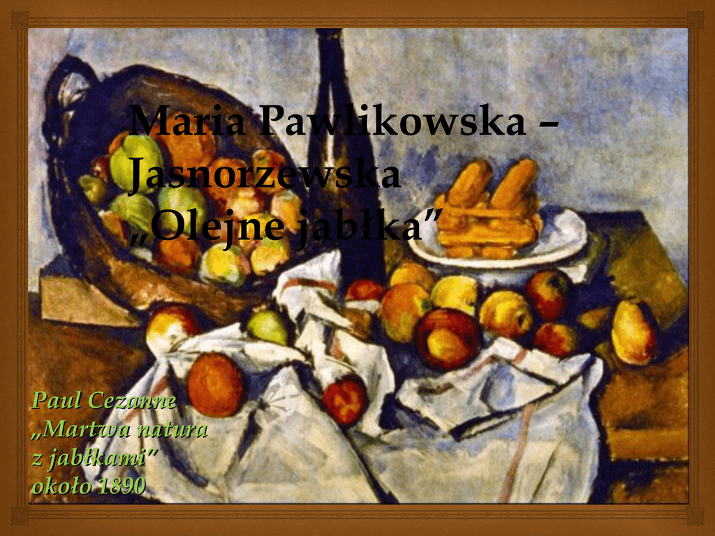 Maria Pawlikowska – Jasnorzewska „Olejne jabłka” Paul Cezanne „Martwa natura z jabłkami” około 1890 Maria Pawlikowska-Jasnorzewska: ►Urodziła się 24 listopada 1891 roku w Krakowie; ►Jej ojcem był Wojciech, a dziadkiem – Juliusz Kossak; ►Oboje rodzice autorki wywodzili się ze szlachty, ich dworek był miejscem częstych spotkań osób ze środowiska artystycznego; ►Maria pobierała edukację w domu, przez pewien czas była również wolną słuchaczką krakowskiej Akademii Sztuk Pięknych; ►Dużo podróżowała po świecie; ►Była trzykrotnie zamężna; . Maria Pawlikowska-Jasnorzewska: ►Nie należała bezpośrednio do żadnego ugrupowania poetów dwudziestolecia międzywojennego, ale przejęła od skamandrytów wiele cech ich poezji, np. żywiołowość, skupienie na powszechności i codzienności; nazywano ją: „Pierwszą damą Skamandra”; ►Jej utwory to m.in.: Niebieskie migdały (debiut, 1922), Pocałunki (1926), Baba-Dziwo (dramat, 1938); ►Zmarła na raka 9 lipca 1945 r. w Manchesterze Portret Marii PawlikowskiejJasnorzewskiej autorstwa Wojciecha Kossaka, 1934r. Olejne jabłka Jabłko z modrym konturem, kwadratowo krzywe, pociągnięte zielenią, którą kraplak plami, ma na policzku białe światełko, jak żywe, i jest jabłkiem przy jabłku, w jabłkach, pod jabłkami. Talerz czarno-niebieski, a nad tym przepychem draperia wisi w fałdach z ciepłego kamienia. Zaś na obrus, gdzie biele cynkowe śnią ciche, toczy się – jeszcze jabłko - z modrym krążkiem cienia ANALIZA I INTERPRETACJA UTWORU: Tytuł wiersza nawiązuje do popularnego w Młodej Polsce malarstwa olejnego; Widoczne są tu wpływy środowiska, w jakim wychowywała się poetka (dziadek i ojciec byli wybitnymi malarzami); Utwór składa się z dwóch czterowersowych strof o rymach krzyżowych (rymują się pierwszy wers z trzecim, drugi czwartym: ABAB); z Utwór jest EKFRAZĄ LITERACKĄ, czyli poetyckim opisem dzieła plastycznego, obfitującym w szczegóły; Podstawowe środki stylistyczne w utworze to: EPITETY: „biele cynkowe”, „modry krążek”; PORÓWNANIE: „Jabłko […], ma na policzku białe światełko, jak żywe”; METAFORY: „biele cynkowe śnią ciche”(animizacja); Podmiot liryczny nie jest wyeksponowany w wierszu, nie używa zaimków świadczących o byciu kobietą lub mężczyzną, nie zwraca się również do konkretnego adresata/adresatów; Podmiot liryczny mimo, iż nie ujawnia swojej płci można utożsamić z poetką, gdyż używa wielu zwrotów świadczących o znajomości warsztatu malarskiego, np. kraplak, czy biele cynkowe - substancja chemiczna, która służy artyście do uzyskania białego koloru farby; „Ja” liryczne skupia się na szczegółowym opisie obrazu, nie pomija żadnego elementu; Opis obfituje w wiele barw, które czynią z wiersza bardziej intensywnie działający na wyobraźnię utwór; Wiersz nie zawiera wyrazów nacechowanych emocjonalnie, jednak wyzwala w odbiorcy silne, pozytywne emocje. Paul Cézanne (ur. 19 stycznia 1839, zm. 22 października 1906) – francuski malarz postimpresjonistyczny, którego twórczość stanowi pomost pomiędzy impresjonizmem i kubizmem. MARTWA NATURA Z JABŁKAMI I POMARAŃCZAMI Paul Cezanne jest autorem obrazu „Martwa Natura z Jabłkami i Pomarańczami”. Powstał on w latach 1895-1900, a namalowany został metodą olejną na płótnie. Ulubioną tematyką autora były owoce, stoły i krzesła. Przedstawił je w specyficzny sposób – tak jakby traciły równowagę. Sam malarz uważał, że w przyrodzie istnieją tylko trzy kształty: kula, walec i stożek i nich składa się cały świat. W taki właśnie sposób ukazał ten obraz. Dzieło przedstawia bardzo efektywną kompozycję. W centrum obrazu znajduje się biała tkanina, na której ułożone są owoce. Część z nich leży w naczyniach takich jak biała misa, talerz i dzbanek z uchwytem ozdobiony pięknymi barwami – żółtą, różową, pomarańczową oraz fioletową. Pomarańcza autor ułożył w misie, natomiast większość jabłek porozrzucał na serwecie. Dają wrażenie jakby miały zaraz spaść na podłogę. Jabłka i pomarańcze są idealnie okrągłe, wydają się dojrzałe, soczyste, zachęcają do zjedzenia. Serwera i naczynia są śnieżnobiałe, czyste i lśniące. Owoce i naczynia znajdują się na wielobarwnym fotelu, na którym dominują odcienie czerwieni, fioletu, różu oraz brązu. Po prawej stronie autor rozłożył kolejną tkaninę – różnokolorową z wyraźnymi plamami żółtymi i fioletowymi. Na szczególną uwagę zasługują wielokątne, często kanciaste załamania obu tkanin. Autor używa bardzo wyraźnych i żywych kolorów oraz wzory na tkaninie i fotelu stanowią ostre figury geometryczne. Malarz z doskonałą skutecznością oddaje przestrzenność wszystkich elementów co daje wrażenie trójwymiarowości obrazu.