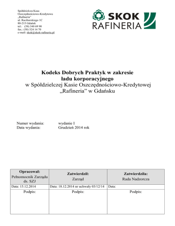 Spółdzielcza Kasa Oszczędnościowo-Kredytowa „Rafineria” ul. Raciborskiego 1C 80-215 Gdańsk tel.: (58) 340 69 90 fax.: (58) 524 14 70 e-mail: [email protected] Kodeks Dobrych Praktyk w zakresie ładu korporacyjnego w Spółdzielczej Kasie Oszczędnościowo-Kredytowej „Rafineria” w Gdańsku Numer wydania: Data wydania: Opracował: Pełnomocnik Zarządu ds. SZJ Data: 15.12.2014 Podpis: wydanie I Grudzień 2014 rok Zatwierdził: Zarząd Data: 18.12.2014 nr uchwały 03/12/14 Podpis: Zatwierdziła: Rada Nadzorcza Data: Podpis: SPÓŁDZIELCZA KASA OSZCZĘDNOŚCIOWO-KREDYTOWA ”RAFINERIA” 80-215 Gdańsk, ul. Raciborskiego 1C NIP 583 10 13 953 www.skok-rafineria.pl, Infolinia 0 801 50 80 85, fax. 58 524 14 70 Spis Treści: I. II. III. IV. V. VI. VII. Wprowadzenie. Organizacja i struktura organizacyjna. Organy Kasy. Relacje z Członkami Kasy. Kluczowe systemu i funkcji wewnętrzne. Podsumowanie. Stosowanie Kodeksu. Kodeks postępowania i zasad etycznych w Spółdzielczej Kasie Oszczędnościowo-Kredytowej "Rafineria" Wydanie I Strona 2 z 8 SKOK "RAFINERIA” POSIADA CERTYFIKAT JAKOŚCI ISO 9001:2008 SPÓŁDZIELCZA KASA OSZCZĘDNOŚCIOWO-KREDYTOWA ”RAFINERIA” 80-215 Gdańsk, ul. Raciborskiego 1C NIP 583 10 13 953 www.skok-rafineria.pl, Infolinia 0 801 50 80 85, fax. 58 524 14 70 I. Wprowadzenie. Spółdzielcza Kasa Oszczędnościowo-Kredytowa „Rafineria” stosuje zasady ładu korporacyjnego zawarte w niniejszym Kodeksie Dobrych Praktyk w zakresie ładu korporacyjnego. Kodeks dobrych praktyk artykułuje podstawowe wartości i normy etyczne przyświecające działalności SKOK "Rafineria", tworząc zbiór standardów stanowiących fundament filozofii zarządzania Kasą. SKOK "Rafineria" stanowi wspólne dobro wszystkich jego uczestników, czyli członków, jakimi są osoby fizyczne, prawne lub inne jednostki organizacyjne korzystające z usług finansowych, instytucje organizacyjne współpracujące ze SKOK "Rafineria" oraz pracownicy. Podstawą zrównoważonego rozwoju i bezpieczeństwa Kasy jest etyczny wymiar działań SKOK "Rafineria" Kodeks dobrych praktyk uwzględnia wytyczne dotyczące dobrych praktyk w zakresie ładu korporacyjnego spółdzielczych kas oszczędnościowo-kredytowych zawarte w projekcie Rekomendacji B-SKOK wydanym w listopadzie 2014 roku przez Komisję Nadzoru Finansowego oraz w Międzynarodowych Zasadach Działania Spółdzielni Kredytowych (International Credit Union Operating Principles) obejmujących m.in. demokratyczną strukturę, służenie członkom, budowanie stabilności finansowej i odpowiedzialność społeczną. II. Organizacja i struktura organizacyjna. 1. Jasność sformułowanych reguł. Kluczem do sprawnego działania Kasy jest jasno sformułowany i ustanowiony Statut SKOK „Rafineria” zawierający podstawę prawną działalności oraz określający obowiązki i cele Kasy. Statut Kasy zatwierdzany jest przez Walne Zgromadzenie i publikowany na stronie internetowej Kasy. 2. Zasoby i procedury. SKOK "Rafineria" dysponuje zasobami niezbędnymi do sprawnego funkcjonowania oraz posiada ustanowione procedury gwarantujące poprawność działań poszczególnych procesów i stanowiące narzędzie umożliwiające monitorowanie i koordynowanie bieżącej działalności. 3. Zarządzanie przez Jakość. SKOK „Rafineria” posiada certyfikat jakości ISO 9001:2008. System Zarządzania Jakością jest dostosowany do celów i wymogów instytucji finansowej działającej na zasadach spółdzielni oraz uwzględnia podejście projakościowe w zarządzaniu poprzez zaangażowanie wszystkich pracowników Kasy. Spółdzielcza Kasa Oszczędnościowo-Kredytowa „Rafineria” jest organizacją, która pragnie zaspakajać potrzeby i oczekiwania klientów – członków Kasy w zakresie świadczenia wysokiej jakości usług finansowych, łatwo dostępnych, w dogodnym dla klienta czasie i na korzystnych warunkach, dbając o stabilność zaufania swoich członków będącą podstawą długookresowego sukcesu Kasy na rynku finansowym. Kodeks postępowania i zasad etycznych w Spółdzielczej Kasie Oszczędnościowo-Kredytowej "Rafineria" Wydanie I Strona 3 z 8 SKOK "RAFINERIA” POSIADA CERTYFIKAT JAKOŚCI ISO 9001:2008 SPÓŁDZIELCZA KASA OSZCZĘDNOŚCIOWO-KREDYTOWA ”RAFINERIA” 80-215 Gdańsk, ul. Raciborskiego 1C NIP 583 10 13 953 www.skok-rafineria.pl, Infolinia 0 801 50 80 85, fax. 58 524 14 70 4. Księga Jakości. SKOK „Rafineria” posiada Księgę Jakości określającą m.in.: - politykę jakości, - odpowiedzialność Zarządu Kasy w zakresie zarządzania przez jakość, - procesy nadrzędne, główne i wspomagające oraz właścicieli i liderów procesów i podprocesów, - opis wzajemnego oddziaływania między procesami, - strukturę organizacyjną, - zakres systemu zarządzania jakością z uwzględnieniem wyłączeń, - strategię i zapewnienie integralności SZJ, - mierzalne cele systemu umożliwiające ciągłe monitorowanie i podnoszenie jakości. 5. Reguła ostrożnościowego działania. SKOK ,,Rafineria” kieruje się regułami ostrożnościowego działania, mając na uwadze bezpieczeństwo środków pieniężnych zgromadzonych na rachunkach Członków, gwarantując stabilność finansową zapewniającą bieżące regulowanie wszelkich zobowiązań wobec Członków oraz innych podmiotów związanych z Kasą. 6. Struktura Organizacyjna. Struktura organizacyjna SKOK „Rafineria” obejmuje wszystkie poziomy zarządzania pogrupowane w funkcjonalne piony z uwzględnieniem hierarchicznych zależności między poszczególnymi komórkami i stanowiskami organizacyjnymi. Struktura organizacyjna w Kasie stanowi ramy działań organizacyjnych dzieląc uprawnienia decyzyjne i odpowiedzialność. 7. Staranność i kompetencje. SKOK "Rafineria" postępuje zgodnie z przepisami prawa, rzetelnie, dokładając należytej staranności w podejmowanych działaniach, dbając o to, by osoby działające w jego imieniu miały odpowiednie kompetencje zawodowe i p