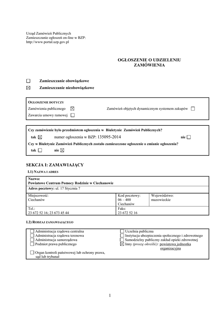 Urząd Zamówień Publicznych Zamieszczanie ogłoszeń on-line w BZP: http://www.portal.uzp.gov.pl OGŁOSZENIE O UDZIELENIU ZAMÓWIENIA Zamieszczanie obowiązkowe Zamieszczanie nieobowiązkowe OGŁOSZENIE DOTYCZY Zamówienia publicznego Zamówień objętych dynamicznym systemem zakupów Zawarcia umowy ramowej Czy zamówienie było przedmiotem ogłoszenia w Biuletynie Zamówień Publicznych? tak numer ogłoszenia w BZP: 135095-2014 nie Czy w Biuletynie Zamówień Publicznych zostało zamieszczone ogłoszenie o zmianie ogłoszenia? tak nie SEKCJA I: ZAMAWIAJĄCY I.1) NAZWA I ADRES Nazwa: Powiatowe Centrum Pomocy Rodzinie w Ciechanowie Adres pocztowy: ul. 17 Stycznia 7 Miejscowość: Ciechanów Kod pocztowy: 06 – 400 Ciechanów Faks: 23 672 52 16 Tel.: 23 672 52 16; 23 673 45 44 Województwo: mazowieckie I.2) RODZAJ ZAMAWIAJĄCEGO Administracja rządowa centralna Administracja rządowa terenowa Administracja samorządowa Podmiot prawa publicznego Uczelnia publiczna Instytucja ubezpieczenia społecznego i zdrowotnego Samodzielny publiczny zakład opieki zdrowotnej Inny (proszę określić): powiatowa jednostka organizacyjna Organ kontroli państwowej lub ochrony prawa, sąd lub trybunał 1 SEKCJA II: PRZEDMIOT ZAMÓWIENIA II.1) Nazwa nadana zamówieniu przez zamawiającego: Zorganizowanie i przeprowadzenie 5 dniowych wyjazdowych szkoleń: szkolenia integracyjno – kulturalno - rozwojowego, obejmującego warsztaty z psychologiem oraz szkolenia z zakresu podstaw technik fotografii dla dwóch grup - uczestników projektu „Aktywność szansą na zatrudnienie i usamodzielnienie” współfinansowanego ze środków Unii Europejskiej w ramach Europejskiego Funduszu Społecznego. II.2) Rodzaj zamówienia: Roboty budowlane Usługi Dostawy II.3) Określenie przedmiotu zamówienia: I. Zorganizowanie i przeprowadzenie 5 dniowego wyjazdowego szkolenia integracyjno – kulturalno - rozwojowego, obejmującego warsztaty z psychologiem oraz szkolenie z zakresu podstaw technik fotografii dla 11 osób, w tym 9 w wieku 15 – 25 lat z terenu powiatu ciechanowskiego, przebywających w rodzinach zastępczych i placówkach opiekuńczo-wychowawczych oraz 2 osób z ich otoczenia i 1 opiekuna (łącznie 12 osób) - uczestników projektu „Aktywność szansą na zatrudnienie i usamodzielnienie” współfinansowanego ze środków Unii Europejskiej w ramach Europejskiego Funduszu Społecznego. Celem szkolenia jest nabycie umiejętności kluczowych, w tym z zakresu poznawania technik fotografii: - wskazanie uczestnikom nowej dziedziny zainteresowania, jaką jest fotografowanie, - wytworzenie chęci do dalszego ich rozwijania się przez rozbudzenie twórczej postawy wobec świata i siebie, - rozwijanie praktycznych umiejętności fotograficznych, - rozwijanie poczucia piękna i wrażliwości estetycznych, oraz umiejętności komunikacyjnych, integracja społeczna i kulturalna oraz nauka alternatywnych form spędzania czasu wolnego. Wyjazdowe szkolenie ma się odbywać i uczestnicy mają być zakwaterowani na terenie tzw. Trójmiasta tj. w jednym z miast wchodzących w jego skład – Gdańsk, Gdynia, Sopot. W co najmniej 4-gwiazdkowym Hotelu o najwyższych standardach, zlokalizowanym nie dalej niż 200 m od morza, w terminie od 12 sierpnia do 16 sierpnia 2014 roku tj.: początek 12 sierpnia od obiadu, zakończenie 16 sierpnia obiadem. Wykonawca zamówienia zapewnia uczestnikom zimne napoje na podróż w obie strony na szkolenie i ze szkolenia, słodycze, owoce. Wykonawca zobowiązany jest: 1) opracować program szkolenia wraz z harmonogramem i przedłożyć go Zamawiającemu w dniu składania ofert jako załącznik do oferty. Program musi zawierać: 2 a) nazwę i zakres szkolenia, b) miejsce (adres hotelu), liczba gwiazdek posiadanych przez hotel c) czas trwania szkolenia (daty i godziny) wraz z planem nauczania określającym tematy zajęć oraz ich wymiar każdego dnia szkolenia oraz atrakcji określonych w pkt. 10) wraz czasem ich trwania (daty i godziny), rozpoczęcia i zakończenia zajęć każdego dnia, d) cel kursu (przewidywane efekty) 2) zapewnić zajęcia z 1 psychologiem i 1 osobą posiadającą kwalifikacje oraz doświadczenie w prowadzeniu zajęć z osobami od 15 do 25 roku życia w zakresie nauki fotografowania w czasie wyjazdowego szkolenia – w uzasadnionych przypadkach po podpisaniu umowy za pisemną zgodą Zamawiającego może nastąpić zmiana osób prowadzących zajęcia, 3) przeprowadzić zajęcia z psychologiem z zakresu autoprezentacji, komunikacji, samopoznania, otwarcia na środowisko, integrujące uczestników wyjazdu i wpływające na zwiększenie wiary we własne możliwości w wymiarze 8 godzin lekcyjnych, 4) przeprowadzić zajęcia teoretyczne i praktyczne z zakresu poznawania technik fotografii w wymiarze 17 godzin w tym 8 godzin praktycznych. 5) zapewnić uczestnikom szkolenia salę wyposażoną w sprzęt niezbędny do realizacji tematyki szkolenia i materiały dydaktyczne, które przejdą na własność uczestników szkolenia, 6) zakupić i przekazać uczestnikom 9 sztuk aparatów cyfrowych o parametrach: - obiektyw szerokokątny (ekwiwalent ogniskowej min. 25 mm, światło min. f/3,5), - matryca BSI CMOS +/- 12 Mpix, - mechaniczny zoom optyczny min. 20x zoom, - stabilizator obrazu, - zintegrowana lampa błyskowa z regulacją mocy błysku, - obsługa kart SD/SDHC/SDXC, - wbudowane proste narzędzia edycyjne, - nastawy ręczne typu PASM (modyfikowalna przysłona, migawka, ostrość oraz czas), - niskie szumy przy wysokich czułościach (od 80 do 6400 ISO), - możliwość wykonywania zdjęć seryjnych, - zasilanie akumulatorem litowo-jonowym z możliwością ładowania przez USB, - menu w języku polskim, 3 - waga do 300 gramów - akcesoria: karta pamięci 8 GB, futerał, ładowarka, kabel USB, 7) zapewnić transport dla 11 uczestników projektu i ich otoczenia oraz 1 opiekuna (łącznie 12 osób) z siedziby zamawiającego do Hotelu gdzie będzie odbywało się szkolenie i z powrotem
