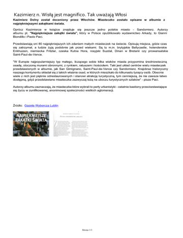 Kazimierz n. Wisłą jest magnifico. Tak uważają Włosi Kazimierz Dolny został doceniony przez Włochów. Miasteczko zostało opisane w albumie z najpiękniejszymi zakątkami świata. Oprócz Kazimierza w książce znajduje się jeszcze jedno polskie miasto - Sandomierz. Autorzy albumu pt. "Najpiękniejsze zakątki świata", który w Polsce opublikowało wydawnictwo Arkady, to Gianni Biondillo i Paolo Paci. Przedstawiają oni 80 najpiękniejszych ich zdaniem małych miasteczek na świecie. Opisują miejsca, gdzie czas się zatrzymał, a ludzie żyją podobnie jak przed wiekami. Są tu m.in. brytyjskie Ballycastle, holenderskie Enkhuizen, niemiecka Fritzlar, czeska Kutna Hora, rosyjski Suzdal, Dinan w Bretanii czy prowansalskie Saint-Paul-de-Vence. "W Europie najpopularniejszy typ małego, liczącego sobie kilka wieków miasta przypomina średniowieczną osadę, otoczoną murami obronnymi, z rynkiem, ratuszem i kościołem. Taki jest układ centrów wielu miasteczek przedstawionych w albumie, jak San Gimignano, Saint-Paul-de-Vence czy Sandomierz. Krajobraz historyczny naszego kontynentu składał się z takich właśnie osad, w których mieszkało do kilkunastu tysięcy osób. Obecnie wiele z nich jest pięknie odrestaurowanych i stanowi atrakcję turystyczną, tym cenniejszą, że nie zawsze łatwo dostępną, gdyż przedstawiane miasteczka zazwyczaj leżą na uboczu turystycznych szlaków" - pisze Paci. Autorzy albumu zaznaczają, że miasteczka które wybrali to perły urbanistyki - ostatnie bastiony przeciwstawiające się życiu w zunifikowanej, anonimowej społeczności wielkich aglomeracji. Źródło: Gazeta Wyborcza Lublin Strona 1/1 Powered by TCPDF (www.tcpdf.org)