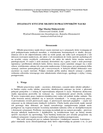 Referat przedstawiony w ramach konferencji Chrześcijańskiego Forum Pracowników Nauki “Nauka-Etyka-Wiara” w Rogowie, 18-21 X 2007r DYLEMATY ETYCZNE MŁODYCH PRACOWNIKÓW NAUKI Mgr Maciej Malaczewski Uniwersytet Łódzki, Łódź Wydział Ekonomiczno-Socjologiczny, Katedra Ekonometrii [email protected] Streszczenie Młodzi pracownicy nauki dosyć często stawiani są w sytuacjach, które wymagają od nich podejmowania trudnych moralnie, a wielokrotnie brzemiennych w skutki, decyzji. Zmusza ich to do odpowiedzenia sobie na wiele pytań, nie tylko tych związanych z ich dalszym rozwojem naukowym, ale także z ich stosunkiem do wielu zjawisk zachodzących na uczelni, często zwykłych, codziennych, ale także do takich, które można nazwać patologicznymi. O części z nich możemy dowiedzieć się z gazet, część z nich pozostaje tajemnicą i problemem młodych ludzi, którzy muszą często samotnie zmagać się z nimi wbrew wielokrotnie całemu ich otoczeniu naukowemu. Celem pracy jest prezentacja kilku sytuacji, zarówno potencjalnych, jak i rzeczywistych, w których młodzi doktoranci oraz asystenci są często stawiani. Podjęta zostanie próba analizy danych sytuacji z punktu widzenia człowieka wierzącego oraz odnalezienia właściwego, zgodnego z etyką i wiarą, postępowania. 1. Wstęp Młodzi pracownicy nauki – asystenci, doktoranci, czasami także młodzi adiunkci – to bardzo często osoby zdolne, pracowite, idealistycznie patrzące na świat, z głowami pełnymi pomysłów i z ochotą do wprowadzania ulepszeń w życie. Niedawno skończone studia najczęściej pozwoliły im wykazać się wymienionymi przed chwilą cechami. W nowo rozpoczętej pracy naukowo-dydaktycznej czeka ich jednak trudne zadanie. Nie tylko bowiem muszą odnaleźć się w nowych warunkach – w swojej pierwszej pracy, w prowadzeniu swoich pierwszych zajęć, w pierwszych starciach poglądów – często też zmuszeni są do dokonywania trudnych wyborów. Chyba każdy pracownik nauki musiał ich pewnego dnia dokonać; po latach zawodowego zaangażowania jednak może posługiwać się wypracowanymi wcześniej metodami radzenia sobie ze skomplikowanymi i złożonymi sytuacjami. Problemy zaczynają się jednak już na samym początku – pierwsze decyzje młodych naukowców i dydaktyków są świadectwem tego, po której stronie sporów etycznych się opowiedają. Tym bardziej konieczne jest uważne przyjrzenie się trudnym sytuacjom i wypracowanie sobie osobistego kodeksu postępowania. Dla osób wierzących jest to zadanie łatwiejsze i trudniejsze zarazem. Łatwiejsze – gdyż standardy życia chrześcijańskiego dość łatwo odpowiadają na pytanie o to, co jest 1 dobre a co złe, a działający w ludziach wierzących Duch Święty uzdatnia ich do podejmowania trudnych wyzwań. Trudniejsze – gdyż po pierwsze, wspomniane standardy są dość wysokie i często trudne w zastosowaniu, a po drugie, niejednokrotnie jest to wybór nieoczywisty, bez jasno zarysowanej „czerni” i „bieli”. Każda taka sytuacja jest dla młodego człowieka chwilą próby. Jeżeli młody wystawiony na próbę naukowiec nie wykaże siły charakteru, to może stracić szansę na osiągnięcie wyrazistości i zostać łatwo narażonym na ciężkie konsekwencje swych decyzji. Jeżeli jednak jest to osoba wierząca, oddana Bogu, to oczekiwania w stosunku do metod, jakimi przy tym może się posłużyć, są oczywiście dużo większe – nie wszystkie z możliwych wyborów oraz narzędzi służących do rozwiązywania problemów są do przyjęcia. Innym problemem jest fakt, że młodzież studiująca bardzo często potrzebuje pozytywnych przykładów zachowań, zwłaszcza u osób uznawanych przez nich za autorytet, a do młodych naukowców jest im o wiele bliżej niż do starszych. W świecie, w którym niedostatecznie silnie promowane są wartości takie jak pracowitość, uczciwość, sprawiedliwość, szczególnie ważne jest ich przekazywanie młodszemu pokoleniu. Tu należy także zwrócić uwagę na fakt, dość często lekceważony przez środowisko naukowe, że ustawa o szkolnictwie wyższym nakłada na pracowników wyższych uczelni nie tylko obowiązek przekazywania studentom wiedzy, ale także wychowywania ich.1 W środowisku akademickim młody naukowiec musi umiejętnie zachowywać się w relacjach z ludźmi, które podzielić można na kilka kategorii: relacje ze studentami, z administracją, z innymi młodymi naukowcami, ze starszymi kolegami, z profesorami, którzy nie są ich promotorami oraz z profesorem – promotorem. W każdym z tych przypadków pojawić mogą się sytuacje, które zmuszą młodego naukowca do podejmowania często trudnych decyzji, w tym także sytuacje wręcz patologiczne. W poniższej pracy skoncentrujemy się na relacjach z studentami oraz ze starszą kadrą naukową wraz z próbą analizy sytuacji z punktu widzenia człowieka wierzącego. 2. Relacje ze studentami W relacjach ze studentami młodzi pracownicy nauki są w niełatwej sytuacji. Niedawno wyszli ze środowiska studenckiego, kończąc studia, ale wciąż czują się w nim silnie osadzeni. Z lat studenckich pozostaje im mnogość różnych znajomości i powiązań o charakterze prywatnym. Muszą jednak prowadzić zajęcia oraz przeprowadzać zaliczenia, które wymagają od nich obiektywizmu. Jak trudno jest ów obiektywizm zachować przekonało się wielu młodych asystentów. Oto na przykład jeden z nich prowadził zajęcia, w których słuchaczkami były jego niegdysiejsze sąsiadki z domu studenckiego. Potencjalnie możliwa była wówczas sytuacja jeszcze trudniejsza – że oto ocenianym przez niego studentem będzie jego współlokator. Nie trzeba chyba nikogo przekonywać, że postawiony został tym samym przed niełatwymi decyzjami. Pół biedy, jeżeli takie osoby są pracowite i oddane swoim studiom – wtedy problem rozwiązuje się sam, a potencjalna ocena bardzo dobra nie jest tu dla nikogo zaskoczeniem. 