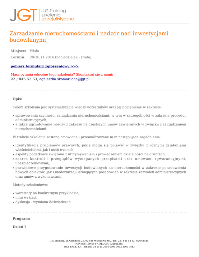 Zarządzanie nieruchomościami i nadzór nad inwestycjami budowlanymi Miejsce: Wisła Termin: 28-30.11.2016 (poniedziałek - środa) pobierz formularz zgłoszeniowy >>> Masz pytania odnośne tego szkolenia? Skontaktuj się z nami: 22 / 845 52 53, [email protected] Opis: Celem szkolenia jest systematyzacja wiedzy uczestników oraz jej pogłębienie w zakresie: ● ● sprawowania czynności zarządzania nieruchomościami, w tym w szczególności w zakresie procedur administracyjnych, a także ugruntowanie wiedzy z zakresu najczęstszych umów zawieranych w związku z zarządzaniem nieruchomościami. W trakcie szkolenia zostaną omówione i przeanalizowane m.in następujące zagadnienia: ● ● ● ● identyfikacja problemów prawnych, jakie mogą się pojawić w związku z różnymi działaniami właścicielskimi, jak i osób trzecich, aspekty podatkowe związane z utrzymywaniem i prowadzeniem działalności na gruntach, zakres kontroli i przeglądów wymaganych przepisami oraz umowami (gwarancyjnymi, ubezpieczeniowymi), prawidłowe przygotowanie inwestycji budowlanych na nieruchomości w zakresie posadowienia nowych obiektów, jak i modernizacji istniejących posadowień w zakresie zezwoleń administracyjnych oraz umów z wykonawcami. Metody szkoleniowe: ● ● ● warsztaty na konkretnym przykładzie, mini wykład, dyskusja - wymiana doświadczeń. Program: Dzień I J.G.Training, ul. Olesińska 21, 02-548 Warszawa, tel. / fax: 22 / 845 52 53, www.jgt.pl NIP: 898-150-56-07, REGON: 932958345, BRE BANK S.A - mBank: 38 1140 2004 0000 3002 3360 7883 Przed godz. 11.00 - przyjazd uczestników i zameldowanie w hotelu. Godz. 11.00 – 17.00 – szkolenie. W trakcie zajęć przerwa na obiad. PROGRAM SZKOLENIA DZIEŃ I I. Systematyzacja norm prawnych dotyczących zarządzania nieruchomościami. II. Regulacja stanu prawnego nieruchomości: 1. 2. 3. 4. 5. 6. Księga wieczysta – podstawowy rejestr danych o stanie prawnym nieruchomości. Formy władania nieruchomościami – zakres uprawnień. Służebności – ustanawianie i znoszenie. Hipoteki – podstawy wpisu i ich wykreślanie. Jakie inne dokumenty mogą opisywać stan prawny nieruchomości? Dysponowanie nieruchomością na cele budowlane. III. Katastr nieruchomości: 1. Zakres danych ujawnianych w ewidencji gruntów i budynków. 2. Charakter prawny danych z ewidencji. 3. Postępowania aktualizacyjne odnośnie danych ujawnianych w katastrze oraz ich konsekwencje. IV. Jak podzielić nieruchomość? 1. Geodezyjny podział i scalenie nieruchomości na działki ewidencyjne. 2. Zasady dotyczące podziału nieruchomości. V. Kwalifikacja gruntów na potrzeby podatków rolnych i lokalnych: 1. Czym się różni odrolnienie od wyłączenia gruntu z produkcji rolnej? VI. Planowanie przestrzenne – możliwości zagospodarowania działki: 1. Akty prawne reglamentujące możliwości inwestycyjne. 2. Miejscowe plany zagospodarowanie przestrzennego – struktura oraz zakres. 3. Decyzji indywidualne – ulcp i wz. Godz. 20.00 – kolacja. Godz. 21.00 – wieczorek integracyjny. Dzień II J.G.Training, ul. Olesińska 21, 02-548 Warszawa, tel. / fax: 22 / 845 52 53, www.jgt.pl NIP: 898-150-56-07, REGON: 932958345, BRE BANK S.A - mBank: 38 1140 2004 0000 3002 3360 7883 Godz. 07.00 - 09.00 – śniadanie. Godz. 09.00 – 15.30 – szkolenie. W trakcie zajęć przerwa na obiad. PROGRAM SZKOLENIA DZIEŃ II I. Analiza nieruchomości pod kątem inwestycyjnym: 1. Skąd czerpać informacje o nieruchomości? 2. Jak wygląda audyt prawny nieruchomości i jakie ryzyka można wykluczyć. II. Przekształcanie gruntów oraz obiektów: 1. 2. 3. 4. Typowe schematy postępowań administracyjnych. Zakres czasowy procedur administracyjnych. Najczęstsze błędy i ryzyka w postępowaniach dotyczących przekształcania. Przewidywalne koszty publiczne jakie należy uwzględnić w budżecie inwestycji. III. Dokumentacja istotna w obrocie nieruchomościami. IV. Kontrola stanu technicznego obiektów posadowionych na nieruchomości: 1. Obiekty budowlane objęte obowiązkiem okresowej kontroli. 2. Książka obiektu budowlanego i archiwizacja dokumentacji. 3. Uprawnienia organów nadzoru. V. Planowanie, przygotowanie i organizacja remontów, adaptacji, modernizacji, rozbiórek: 1. 2. 3. 4. 5. 6. 7. Pozwolenie na budowę - wniosek, niezbędne załączniki i wymogi formalne. Wymagane przepisami szczególnymi pozwolenia, uzgodnienia i opinie. Dostęp do drogi publicznej a lokalizacja zjazdu. Zakres sprawdzenia dokumentacji przez organ. Katalog obiektów na zgłoszenie. Procedura i wymogi formalne zgłoszeń. Formy rozstrzygnięcia i terminy ustawowe. Godz. 16.00 - 19.30 – wycieczka z przewodnikiem po okolicy. Godz. 20.00 – kolacja. Dzień III J.G.Training, ul. Olesińska 21, 02-548 Warszawa, tel. / fax: 22 / 845 52 53, www.jgt.pl NIP: 898-150-56-07, REGON: 932958345, BRE BANK S.A - mBank: 38 1140 2004 0000 3002 3360 7883 Godz. 07.00 - 09.00 – śniadanie. Godz. 09.00 – 14.00 – szkolenie. Około godz. 12.00 wymeldowanie. PROGRAM SZKOLENIA DZIEŃ III I. Zmiana sposobu użytkowania obiektu budowlanego: 1. Dokumentacja niezbędna do dokonania zmiany sposobu użytkowania. 2. Zmiana sposobu użytkowania połączona z pozwoleniem na budowę. 3. Skutki braku zgłoszenia dokonania zmiany sposobu użytkowania. II. Zarządzanie umowami usług i robót w zakresie inwestycji na nieruchomości: 1. 2. 3. 4. 5. 6. 7. Kto reprezentuje firmę? - weryfikacja przedsiębiorców w KRS i CEIDG. Umowa zlecenie czy umowa o dzieło – charakterystyka i różnice. Jakie oświadczenia powinniśmy zawrzeć w umowie i jakie są ich konsekwencje? Zabezpieczenie należytego wykonania. Możliwości nadzoru i dyscyplinowania wykonawcy. Możliwości i konsekwencje rozwiązania umowy. Rękojmia, gwarancja za wady przedmiotu umowy. III. Wybrane umowy w zakresie inwestycji budowlanych. Na jakie aspekty warto zwrócić uwagę? 1. Umowa najmu czy umowa dzierżawy – różnice ustawowe i praktyczne. 2. Umowa na wyko