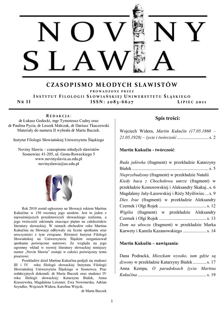 CZASOPISMO MŁODYCH SLAWISTÓW PROWADZONE PRZEZ NR INSTYTUT FILOLOGII SŁOWIAŃSKIEJ UNIWERSYTETU ŚLĄSKIEGO II ISSN: 2083-6627 LIPIEC 2011 REDAKCJA: dr Łukasz Godecki, mgr Tymoteusz Cudny oraz dr Paulina Pycia, dr Leszek Małczak, dr Dariusz Tkaczewski !Nieoczekiwany koniec formuły Materiały do numeru II wybrała dr Marta Buczek. Spis treści: Wojciech Widera, Martin Kukučín (17.05.1860 – 21.05.1928) – życie i twórczość ............................ s. 2 Instytut Filologii Słowiańskiej Uniwersytetu Śląskiego Noviny Slawia – czasopismo młodych slawistów Sosnowiec 41-205, ul. Grota-Roweckiego 5 www.novinyslavia.us.edu.pl [email protected] Martin Kukučín - twórczość: Ruda jałówka (fragment) w przekładzie Katarzyny Białek .................................................................... s. 5 Nieprzebudzony (fragment) w przekładzie Natalii Kiedy baca z Chochołowa umrze (fragment) w przekładzie Komorowskiej i Aleksandry Skakuj .. s. 6 Magdaleny Jańy-Łazowskiej i Róży Myśliwiec ... s. 9 Dies Irae (fragment) w przekładzie Aleksandry Czernek i Olgi Rojek .......................................... s. 12 Wigilia (fragment) w przekładzie Aleksandry Czernek i Olgi Rojek .......................................... s. 13 Dom na uboczu (fragment) w przekładzie Marka Karwety i Kamila Kazanowskiego ..................... s. 14 Rok 2010 został ogłoszony na Słowacji rokiem Martina Kukučina w 150 rocznicę jego urodzin. Jest to jeden z najważniejszych przedstawicieli słowackiego realizmu, a jego twórczość odcisnęła znaczące piętno na całokształcie literatury słowackiej. W ramach obchodów roku Martina Kukučína na Słowacji odbywały się liczne spotkania oraz uroczystości z tym związane. Również Instytut Filologii Słowiańskiej na Uniwersytecie Śląskim zorganizował spotkanie poświęcone autorowi. Ze względu na jego ogromny wkład w rozwój literatury słowackiej niniejszy numer „Novin Slawia” zostaje w całości poświęcony temu pisarzowi. Przekładów dzieł Martina Kukučína podjęli się studenci III i IV roku filologii słowackiej Instytutu Filologii Słowiańskiej Uniwersytetu Śląskiego w Sosnowcu. Prac redakcyjnych dokonali: dr Marta Buczek oraz studenci IV roku filologii słowackiej: Katarzyna Białek, Anna Kraszewska, Magdalena Leiszner, Ewa Nowotarska, Adrian Szyndler, Wojciech Widera, Karolina Wójcik. dr Marta Buczek Martin Kukučín – nawiązania: Dana Podracká, Mieszkam wysoko, tam gdzie są dzwony w przekładzie Katarzyny Białek ............ s. 17 Anna Kempa, O paradoksach życia Martina Kukučína ............................................................. s. 19 1 Kukučín został mianowany nauczycielem w szkole podstawowej w Jasenovej. W 1978 roku skończył kurs i objął stanowisko nauczyciela, na którym pozostawał przez następne 6 lat. W 1883 roku do swojego zeszytu pod tytułem Múzy Martina Kukučína wpisuje pierwsze opowiadanie – Čo komu sudenô, które jest opisem życia prostych ludzi na wsi. W tym samym roku napisał również koncept opowiadania Kus života, które zostało opublikowane pod tytułem Na hradskej ceste (Na gościncu) w czasopiśmie „Národné noviný" (6 i 8 lutego, 1883). Jest to pierwsze udokumentowane dzieło Martina Kukučína. Dotyczy ono problemu biedy na Słowacji oraz pokazuje życie jako udrękę w socjalistycznej rzeczywistości. W tym samym roku opublikowane zostają również inne opowiadania: Čas tratí – čas platí (Czas płaci, czas traci), Na Jarmok (Na jarmark), Dedinský jarmok (Wiejski jarmark), Na Ondreja (Na Ondreja), Máje (Maje), Pán majster Obšíval (Pan majster Obšíval). Ich tematyka ściśle wiąże się z obyczajami i folklorem słowackiej wsi. W pierwszym numerze czasopisma „Slovenské pohľady”, wydanym w 1884 roku, zostaje opublikowane jego opowiadanie Hody (Gody). W tym samym roku również w czasopiśmie „Slovenské pohľady” ukazują się opowiadania Hajtman (Hetman) oraz Obecné trampoty (Ogólne problemy). Czasopismo przyznaje mu także nagrodę 100 franków za opowiadanie Susedia (Sąsiedzi), które zwyciężyło konkurs organizowany przez Słowaków mieszkających w Bukareszcie. W roku 1885 ukazują się kolejne opowiadania autora: Z teplého hniezda (Z ciepłego gniazda), opublikowane w pierwszym numerze „Almanachu mládeņe slovenskej”; Rysavá jalovica (Ryża jałówka), opublikowane w „Slovenskom domovom kalendári II” Pánsky hájnik (Pański zagajnik), opublikowane w „Letopise Ņiveny II” i Na svitaní (O świcie), opublikowane w „Národných novinách”. Problematyka poruszana w tych opowiadaniach koncentruje się głównie wokół stosunków panujących w społeczeństwie słowackim końca XIX wieku. Autor pogłębia tu również portrety psychologiczne swoich bohaterów, co pozwoliło na zwiększenie napięcia i przyspieszenie akcji utworów. W czerwcu 1885 roku Kukučín zdaje maturę w gimnazjum w Ńoproni. Chciał zapisać się na studia teologiczne w Preńporku, jednak kiedy zdał sobie sprawę, że duchowieństwo jest nastawione antysłowacko, odstąpił od tego pomysłu i wyjechał do Pragi. Tam na Uniwersytecie Karola uczestniczył, początkowo jako wolny słuchacz, w zajęciach na wydziale lekarskim, a jesienią dołączył do grona studentów. Tego samego roku przyłączył się do akademickiego stowarzyszenia słowackich studentów „Detvan”1, działającego w Pradze w latach 1882-1948. Martin Kukučín (17.05.1860-21.05.1928) życie i twórczość Martin Kukučín urodził się 17 maja 1860 roku we wsi Jasenová na wschodzie Słowacji. Był jednym z najważniejszych i najwybitniejszych twórców słowackiego realizmu. Prozaik, dramaturg i publicysta, którego dzieła publikowano w licznych czasopismach oraz tłumaczono na wiele języków. Twórczość pisarza związana jest z folklorem i tradycją ludową. Jej źródła stanowią romantyczne i postromantyczne krótkie opowiadania oraz 