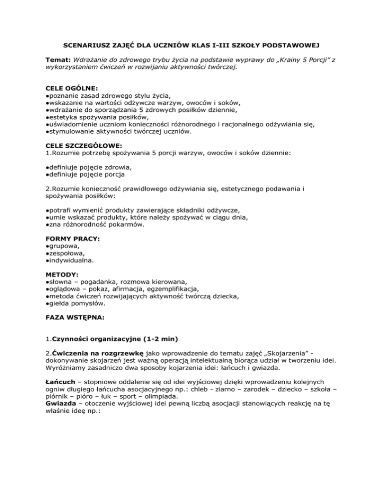 SCENARIUSZ ZAJĘĆ DLA UCZNIÓW KLAS I-III SZKOŁY PODSTAWOWEJ Temat: Wdrażanie do zdrowego trybu życia na podstawie wyprawy do „Krainy 5 Porcji” z wykorzystaniem ćwiczeń w rozwijaniu aktywności twórczej. CELE OGÓLNE: ●poznanie zasad zdrowego stylu życia, ●wskazanie na wartości odżywcze warzyw, owoców i soków, ●wdrażanie do sporządzania 5 zdrowych posiłków dziennie, ●estetyka spożywania posiłków, ●uświadomienie uczniom konieczności różnorodnego i racjonalnego odżywiania się, ●stymulowanie aktywności twórczej uczniów. CELE SZCZEGÓŁOWE: 1.Rozumie potrzebę spożywania 5 porcji warzyw, owoców i soków dziennie: ●definiuje pojęcie zdrowia, ●definiuje pojęcie porcja 2.Rozumie konieczność prawidłowego odżywiania się, estetycznego podawania i spożywania posiłków: ●potrafi wymienić produkty zawierające składniki odżywcze, ●umie wskazać produkty, które należy spożywać w ciągu dnia, ●zna różnorodność pokarmów. FORMY PRACY: ●grupowa, ●zespołowa, ●indywidualna. METODY: ●słowna – pogadanka, rozmowa kierowana, ●oglądowa – pokaz, afirmacja, egzemplifikacja, ●metoda ćwiczeń rozwijających aktywność twórczą dziecka, ●giełda pomysłów. FAZA WSTĘPNA: 1.Czynności organizacyjne (1-2 min) 2.Ćwiczenia na rozgrzewkę jako wprowadzenie do tematu zajęć „Skojarzenia” dokonywanie skojarzeń jest ważną operacją intelektualną biorąca udział w tworzeniu idei. Wyróżniamy zasadniczo dwa sposoby kojarzenia idei: łańcuch i gwiazda. Łańcuch – stopniowe oddalenie się od idei wyjściowej dzięki wprowadzeniu kolejnych ogniw długiego łańcucha asocjacyjnego np.: chleb - ziarno – zarodek – dziecko – szkoła – piórnik – pióro – łuk – sport – olimpiada. Gwiazda – otoczenie wyjściowej idei pewną liczbą asocjacji stanowiących reakcję na tę właśnie ideę np.: Uczniowie pracują w dwóch grupach – dziewczynki i chłopcy. Dziewczynki otrzymują na kartce słowo porcja z poleceniem utworzenia łańcucha skojarzeń. Chłopcy otrzymują na kartce słowo zdrowie z poleceniem utworzenia skojarzeń w formie gwiazdy. Wyniki pracy przedstawiają liderzy grup. Krótkie podsumowanie przez nauczyciela w formie wprowadzenia do tematu zajęć. FAZA WŁAŚCIWA: 1.Zespół klasowy zostaje podzielony na 5 grup. Każda grupa zostaje zaproszona do Krainy 5 Porcji, w której znajduje się 5 wysp. Każda z nich nosi inną nazwę: Wyspa Śniadaniowa, Wyspa Szkolna, Wyspa Obiadowa, Wyspa Popołudniowa, Wyspa Wieczorna. Każda grupa losuje zaproszenie na wyspę. Na wyspach umieszczone są Skrzynie Skarbów w których znajdują się owoce, warzywa i soki odpowiednio przydzielone do ćwiczeń dla uczniów. Afirmacja wykonywanych ćwiczeń przez uczniów przebiega według określonego porządku zgodnie z nazwami wysp. Nauczyciel pilnuje czasu pracy w grupach praz prezentacji wyników przez liderów. ●WYSPA ŚNIADANIOWA Uczniowie w Skrzyni Skarbów znajdują pisaki, kartki papieru, oraz kartę z krótką bajką. „Pewnego dnia król Łakomczuch Wielki odpoczywał po Śniadaniowym Obżarstwie, leżąc na wielkim łożu. Łoże uginało się pod jego ciężarem i ogromnie skrzypiało. Sapał i stękał. Obracając się z trudem na swym łożu zauważył, że z wiatrem wpadła do komnaty przez otwarte okno Owocowa Wróżka. Wtedy przypomniał mu się dawno zapomniany aromat ogrodów i pól. Łakomczuch Wielki nie chodził po swoich ziemiach, gdyż był na to zbyt poważny i za gruby. Chodzenie sprawiało mu ogromny trud. Owocowa Wróżka odwiedzając kolejne komnaty pozostawiała w nich cudowny zapach owoców i warzyw. Gdy Łakomczuch Wielki znowu poczuł głód, kucharz zaczął przygotowywać tłuste potrawy, gdy nagle poczuł zapomniany nawet przez niego zapach. Wysłał więc swoich pomocników na owocowo – warzywne poszukiwanie wydając im „Kucharską Księgę Zdrowego Życia”. Po ich powrocie przygotowano nowe potrawy śniadaniowe dla Króla Łakomczucha Wielkiego. Był zachwycony nowymi potrawami i ogłosił w swoim królestwie – Owocowo – Warzywne Święto każdego dnia według zasad Zdrowej Diety. Pomagał mu w tym zadaniu lekarz i kucharz nadworny. Król chcąc promować swoje królestwo zaprosił na Śniadanie władców sąsiednich państw”. Teraz kolej na Wasze zadanie. Pomóżcie nadwornemu kucharzowi ułożyć menu na śniadanie. Dokończcie tez bajkę. (Pomysł może zostać wykorzystany z uczniami w formie klasowego przedstawienia np. dla rodziców.) ●WYSPA SZKOLNA Uczniowie otrzymują polecenie wykonania zaproszenia na śniadanie szkolne, dla swoich kolegów (technika dowolna). W zaproszeniu musi być określona godzina spotkania zgodnie z rzeczywistym czasem zajęć, aby uczniowie z pozostałych Wysp mogli uczestniczyć we wspólnym śniadaniu. Każdy uczeń przychodzi ze swoim śniadaniem na Wyspę Szkolną. Wyspiarze Szkolni natomiast przygotowują dodatek do śniadania dla każdego gościa wykorzystując zawartość Skrzyni Skarbów. W skrzyni znajdują się sok marchwiowy, sok bananowy, sok malinowy, serwetki, kubki jednorazowe, oraz duży arkusz papieru na wykonanie owocowego obrusu na gościnny stół. Uczniowie ozdabiają obrus wyklejając go schematami znanych owoców z których wykonuje się soki. ●WYSPA OBIADOWA Uczniowie otrzymują następujące instrukcje: Jesteście rozbitkami na bezludnej Obiadowej Wyspie. Wasz okręt zatonął, uratowała się wasza grupa. Pewnego dnia fala wyrzuciła na plażę dużą skrzynię – prawdopodobnie część ładunku okrętu. Biegniecie do skrzyni w nadziei, że znajdziecie tam coś pożytecznego. Stwierdzacie, że w środku jest pełno guzików, marchwi, pomidorów, cebuli, groszku zielonego, porów, kukurydzy, nożyczek, papieru kolorowego, patyczków i bloków rysunkowych. W środku znajduje się też kartka z poleceniem: W jaki sposób możecie z tego zrobić zegar wskazujący spożycie 5 porcji owoców, warzyw 