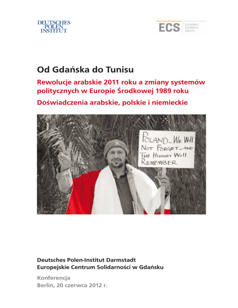 DEUTSCHES POLEN INSTITUT Od Gdańska do Tunisu Rewolucje arabskie 2011 roku a zmiany systemów politycznych w Europie Środkowej 1989 roku Doświadczenia arabskie, polskie i niemieckie Deutsches Polen-Institut Darmstadt Europejskie Centrum Solidarności w Gdańsku Konferencja Berlin, 20 czerwca 2012 r. DEUTSCHES POLEN INSTITUT Od Gdańska do Tunisu Rewolucje arabskie 2011 roku a zmiany systemów politycznych w Europie Środkowej 1989 roku Doświadczenia arabskie, polskie i niemieckie Deutsches Polen-Institut Darmstadt Europejskie Centrum Solidarności w Gdańsku Konferencja Berlin, 20 czerwca 2012 r. Spis treści Konferencja: »Od Gdańska do Tunisu. Rewolucje arabskie 2011 roku a zmiany systemów politycznych w Europie Środkowej 1989 roku. Doświadczenia arabskie, polskie i niemieckie« Wydawcy: Europejskie Centrum Solidarności w Gdańsku i Deutsches Polen-Institut Darmstadt Redakcja: Dieter Bingen Tłumaczenie tekstów: Agnieszka Grzybkowska, Ulrich Heiße Zdjęcia: Andrzej Meller (strona tytułowa), Reiner Zensen Opracowanie graficzne: Regina Schüle Produkcja: Ph. Reinheimer GmbH Darmstadt Darmstadt 2012 ISBN 978-83-62853-12-0 ISSN 2196-0526 2 3 4 Wprowadzenie 5 Program 6 Powitanie Prof. dr Dieter Bingen Basil Kerski 10 Tezy wprowadzające Zbigniew Bujak 15 Panel I Rewolucje – motywy, wartości, metody Prof. dr Volker Perthes dr Bartłomiej A. Nowotarski dr Ahmad Al-Sadi Prof. dr Bronisław Misztal Basil Kerski 39 Panel II Transformacje – Instrumenty i czynnik »solidarność międzynarodowa« Adam Balcer Prof. dr Ali-Ridha Chennoufi Markus Meckel dr Krzysztof Olendzki Prof. dr Dieter Bingen 60 Biogramy Wprowadzenie Program Deutsches Polen-Institut Darmstadt i Europejskie Centrum Solidarności w Gdańsku zorganizowali w dniu 20 czerwca 2012 roku w Przedstawicielstwie landu NadreniaPalatynat w Berlinie konferencję noszącą tytuł: 14:00 Powitanie Od Gdańska do Tunisu. Rewolucje arabskie 2011 roku a zmiany systemów politycznych w Europie Środkowej 1989 roku. Doświadczenia arabskie, polskie i niemieckie. Trwająca pół dnia konferencja miała na celu porównać ruch demokratyczny w Europie Środkowo-Wschodniej w latach 80. XX wieku ze szczególnym uwzględnieniem Polski, z ruchem rewolucyjnym na obszarze arabskim, zapoczątkowanym w Tunezji pod koniec 2010 roku. Dyskusja dotyczyła porównywalności i zróżnicowania sytuacji wyjściowych, motywów i przebiegu tych ruchów wolnościowych. Wielką rolę zarówno przed 30 laty w Europie jak i dzisiaj w świecie arabskim odgry wały działania polityczne i reakcja »wspólnoty międzynarodowej« na te wydarzenia. Jak zachowuje się środowisko międzynarodowe wobec początkowo zaskakujących, a następnie wstrząsających obrazów z centrum przemian, które nie ograniczają się do jednego kraju lecz zdają się zarażać inne? Jakie wartości uniwersalne przyczyniły się do przemian w Europie i na obszarze arabskim, a co było specyficzne i nieporównywalne? Wtedy w Europie ważną rolę odgrywały media, rewolucja w świecie arabskim byłaby nie do pomyślenia bez forów społecznościowych. Czego mogą nauczyć nas postawy aktorów przemian w Europie Środkowo- Wschodniej i zapewnienia z zewnątrz o solidarności, względnie ich odmowa? Czy można porównać zaskoczenie i nieświadomość ruchów wewnętrznych »wtedy« i »dzisiaj«? Jaką rolę odgrywa(ła) obawa przed destabilizacją polityczną? 14:05 –14:30 Tezy wprowadzające 14:30 –16:00 Panel I Rewolucje – motywy, wartości, metody Prof. dr Volker Perthes, Fundacja Nauka i Polityka (Berlin) dr Bartłomiej Nowotarski, Uniwersytet Ekonomiczny we Wrocławiu dr Ahmad Al-Sadi (Berlin) Prof. dr Bronisław Misztal, Uniwersytet Warszawski Moderacja: Basil Kerski 16:00 –16:30 Przerwa na kawę 16:30 –18:00 Panel II Transformacje – Instrumenty i czynnik »solidarność międzynarodowa« Adam Balcer, demosEUROPA (Warszawa) Prof. dr Ali-Ridha Chennoufi, Instytut Filozofii Uniwersytetu w Tunisie Markus Meckel, były Minister Spraw Zagranicznych (Berlin) dr Krzysztof Olendzki, były Ambasador RP w Tunisie (Warszawa) Moderacja: Prof. dr Dieter Bingen Powstaje wiele pytań, istnieje niewiele pewników. Świat polityki i demokratyczna opinia publiczna wzywane są codziennie do zareagowania, dawania odpowiedzi i sygnałów na podstawie niesprawdzonych i niepewnych informacji i osądów. Powyższe zagadnienia rozważano podczas dwóch paneli dyskusyjnych, których przebieg dokumentujemy w niniejszej publikacji, wydanej dla zainteresowanych kręgów publiczności. Prof. dr Dieter Bingen Deutsches Polen-Institut 4 Zbigniew Bujak, współzałożyciel »Solidarności«, uczestnik obrad Okrągłego Stołu 1989, były poseł na Sejm (Warszawa) Basil Kerski Europejskie Centrum Solidarności 5 Powitanie Dieter Bingen: Witam Państwa serdecznie na konferencji »Od Gdańska do Tunisu. Rewolucje arabskie 2011 a zmiana systemu politycznego w Europie Środkowej 1989 roku. Doświadczenia arabskie, polskie i niemieckie«. Szanowni Państwo, cieszę się, że Deutsches Polen-Institut mógł zorganizować tę tak niezwykle aktualną konferencję wspólnie z Europejskim Centrum Solidarności, którego dyrektorem jest Basil Kerski. Podziękowania należą się również Przedstawicielstwu Nadrenii-Palatynatu, a szczególnie panu dr Schmuckowi, za zaproszenie nas do siedziby Przedstawicielstwa w samym centrum Berlina. Bardzo mi miło gościć wśród nas Jego Eksce lencję Elyesa Gharianiego, ambasadora Republiki Tunezji w Berlinie. Witamy Pana bardzo serdecznie! Zaskoczeni i oniemiali, zachwyceni, pełni entuzjazmu i zadziwienia byliśmy wszyscy, kiedy półtora roku temu w krajach świata arabskiego, poczynając od Tunezji, nastąpiło »arabskie przebudzenie«, powstanie, które nie było przewidziane w postrzeganiu świata przez Europejczyków. W chwilę później dowiedzieliśmy się, że nie dzieje się tak wyłą cznie w Tunezji, lecz – jak przy efekcie Dieter Bingen domina – zapow
