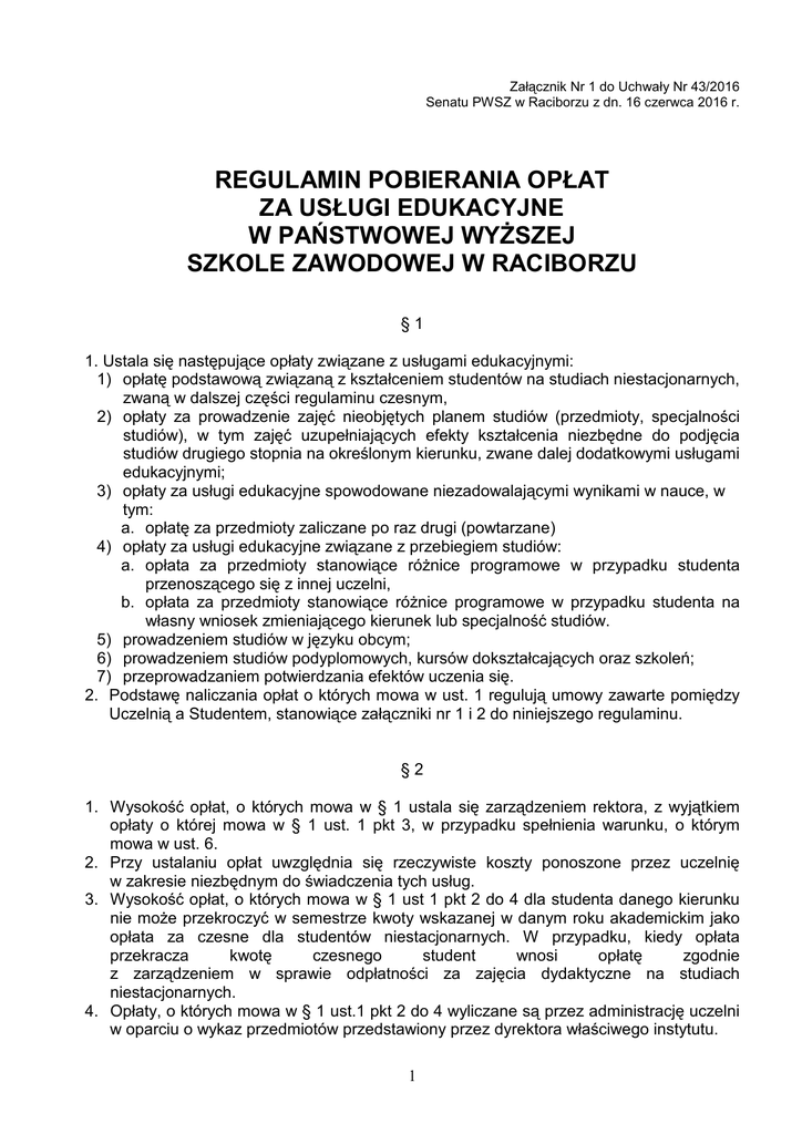 Załącznik Nr 1 do Uchwały Nr 43/2016 Senatu PWSZ w Raciborzu z dn. 16 czerwca 2016 r. REGULAMIN POBIERANIA OPŁAT ZA USŁUGI EDUKACYJNE W PAŃSTWOWEJ WYŻSZEJ SZKOLE ZAWODOWEJ W RACIBORZU §1 1. Ustala się następujące opłaty związane z usługami edukacyjnymi: 1) opłatę podstawową związaną z kształceniem studentów na studiach niestacjonarnych, zwaną w dalszej części regulaminu czesnym, 2) opłaty za prowadzenie zajęć nieobjętych planem studiów (przedmioty, specjalności studiów), w tym zajęć uzupełniających efekty kształcenia niezbędne do podjęcia studiów drugiego stopnia na określonym kierunku, zwane dalej dodatkowymi usługami edukacyjnymi; 3) opłaty za usługi edukacyjne spowodowane niezadowalającymi wynikami w nauce, w tym: a. opłatę za przedmioty zaliczane po raz drugi (powtarzane) 4) opłaty za usługi edukacyjne związane z przebiegiem studiów: a. opłata za przedmioty stanowiące różnice programowe w przypadku studenta przenoszącego się z innej uczelni, b. opłata za przedmioty stanowiące różnice programowe w przypadku studenta na własny wniosek zmieniającego kierunek lub specjalność studiów. 5) prowadzeniem studiów w języku obcym; 6) prowadzeniem studiów podyplomowych, kursów dokształcających oraz szkoleń; 7) przeprowadzaniem potwierdzania efektów uczenia się. 2. Podstawę naliczania opłat o których mowa w ust. 1 regulują umowy zawarte pomiędzy Uczelnią a Studentem, stanowiące załączniki nr 1 i 2 do niniejszego regulaminu. §2 1. Wysokość opłat, o których mowa w § 1 ustala się zarządzeniem rektora, z wyjątkiem opłaty o której mowa w § 1 ust. 1 pkt 3, w przypadku spełnienia warunku, o którym mowa w ust. 6. 2. Przy ustalaniu opłat uwzględnia się rzeczywiste koszty ponoszone przez uczelnię w zakresie niezbędnym do świadczenia tych usług. 3. Wysokość opłat, o których mowa w § 1 ust 1 pkt 2 do 4 dla studenta danego kierunku nie może przekroczyć w semestrze kwoty wskazanej w danym roku akademickim jako opłata za czesne dla studentów niestacjonarnych. W przypadku, kiedy opłata przekracza kwotę czesnego student wnosi opłatę zgodnie z zarządzeniem w sprawie odpłatności za zajęcia dydaktyczne na studiach niestacjonarnych. 4. Opłaty, o których mowa w § 1 ust.1 pkt 2 do 4 wyliczane są przez administrację uczelni w oparciu o wykaz przedmiotów przedstawiony przez dyrektora właściwego instytutu. 1 5. Wysokość opłat, o których mowa w § 1 ust. 1 pkt 2 do 4 wylicza się jako iloczyn liczby punktów ECTS i stawki za jeden punkt ECTS ustalanej corocznie w Zarządzeniu rektora PWSZ w Raciborzu. 6. Wysokość opłaty za powtarzanie semestru, w przypadku skierowania studenta na powtarzanie wyłącznie seminarium dyplomowego ostatniego semestru studiów wynosi 90 zł. Wysokość opłaty za seminarium liczona w kwocie 90 zł nie dotyczy studentów skierowanych na powtarzanie większej liczby przedmiotów. W takim przypadku opłata naliczana jest zgodnie z § 2 ust. 3. §3 1. Warunki pobierania opłat za czesne określone są w umowie zawieranej pomiędzy studentem studiów niestacjonarnych a uczelnią. 2. Przedłużenie sesji egzaminacyjnej, a także uzyskanie wpisu w trybie warunkowym na kolejny semestr nie zwalnia studenta z obowiązku opłacania czesnego za kolejny semestr. 3. W przypadku rezygnacji ze studiów lub skreślenia z listy studentów opłata za czesne podlega zwrotowi w wysokości obliczonej proporcjonalnie do daty skreślenia z listy studentów. §4 1. W przypadku powtarzania semestru: 1) student studiów stacjonarnych i niestacjonarnych ma obowiązek wnieść opłatę za powtarzane przedmioty wyliczone zgodnie z § 2 ust. 5 lub 6. 2) student studiów niestacjonarnych zwolniony jest z obowiązku wniesienia czesnego za ten semestr. Wpłacone za kolejny semestr czesne może być zaliczone na potrzeby opłat związanych z powtarzaniem semestru. 3) student studiów stacjonarnych skierowany na powtarzanie semestru, zmieniający formę studiów na niestacjonarne nie ponosi opłaty za powtarzany przedmiot, a wnosi opłatę za czesne. 4) jeżeli w powtarzanym semestrze plan studiów nie przewiduje przedmiotów, które decyzją dyrektora instytutu student miał obowiązek powtórzyć, student nie wnosi opłat za powtarzanie. 5) jeżeli w powtarzanym semestrze plan studiów zawiera nowe przedmioty, które student musi zrealizować, przedmioty te traktowane są jako bezpłatne różnice programowe. 6) student może zostać zwolniony z wniesienia opłat w przypadku skierowania na powtarzanie semestru na specjalności pokrewnej o podobnym planie studiów, jeżeli nauka na specjalności studiów, którą student realizował nie jest kontynuowana w Uczelni. 7) W przypadku skierowania na powtarzanie VI semestru wyłącznie z powodu niezaliczenia seminarium dyplomowego student wnosi opłatę zgodnie z § 2 ust. 6. 2. W przypadku studenta zmieniającego uczelnię opłatą objęte zostają przedmioty stanowiące różnice programowe z już zrealizowanych semestrów studiów. Różnice programowe ustala dyrektor instytutu na podstawie dokumentów uczelni, z której student się przenosi, w momencie wpisywania na listę studentów. 3. W przypadku studenta zmieniającego, na własny wniosek, kierunek lub specjalność studiów, opłatą objęte zostają przedmioty stanowiące różnice programowe z już zrealizowanych semestrów studiów. Różnice programowe ustala dyrektor instytutu na który student się przenosi, na podstawie dokumentów, dotyczących przebiegu studiów PWSZ w Raciborzu, w momencie wpisywania na listę studentów. 2 4. Za wznowienie studiów w następstwie skreślenia z listy studentów student studiów niestacjonarnych wnosi opłatę za czesne począwszy od semestru reaktywacji. 5. W przypadku wznowienia studiów w następstwie skreślenia z listy studentów, na innym kierunku (specjalności) studiów, student studiów stacjonarnych wnosi opłatę za różnice programowe ju