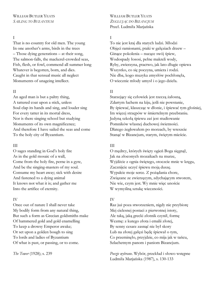 WILLIAM BUTLER YEATS SAILING TO BYZANTIUM WILLIAM BUTLER YEATS ŻEGLUJĄC DO BIZANCJUM Przeł. Ludmiła Marjańska I That is no country for old men. The young In one another’s arms, birds in the trees – Those dying generations – at their song, The salmon-falls, the mackerel-crowded seas, Fish, flesh, or fowl, commend all summer long Whatever is begotten, born, and dies. Caught in that sensual music all neglect Monuments of unageing intellect. I To nie jest kraj dla starych ludzi. Młodzi Objęci ramionami, ptaki w gałęziach drzew – Ginące pokolenia – nucące swój śpiew, Wodospady łososi, pełne makreli wody, Ryby, zwierzyna, ptactwo, jak lato długie opiewa Wszystko, co się poczyna, umiera i rodzi. Nie dba, kogo muzyka zmysłów pochłonęła, O wiecznie młody umysł i o jego dzieła. II An aged man is but a paltry thing, A tattered coat upon a stick, unless Soul clap its hands and sing, and louder sing For every tatter in its mortal dress, Nor is there singing school but studying Monuments of its own magnificence; And therefore I have sailed the seas and come To the holy city of Byzantium. II Starzejący się człowiek jest rzeczą żałosną, Zdartym łachem na kiju, jeśli nie powstanie, By śpiewać, klaszcząc w dłonie, i śpiewać tym głośniej, Im więcej strzępów w śmiertelnym przebraniu. Jedyną szkołą śpiewu zaś jest studiowanie Pomników własnej duchowej świetności. Dlatego żeglowałem po morzach, by wreszcie Stanąć w Bizancjum, starym, świętym mieście. III O sages standing in God’s holy fire As in the gold mosaic of a wall, Come from the holy fire, perne in a gyre, And be the singing-masters of my soul. Consume my heart away; sick with desire And fastened to a dying animal It knows not what it is; and gather me Into the artifice of eternity. III O mędrcy, których święty ogień Boga sięgnął, Jak na złoconych mozaikach na murze, Wyjdźcie z ognia świętego, otoczcie mnie w kręgu, Zacznijcie uczyć śpiewu moją duszę. Wypalcie moje serce. Z pożądania chore, Związane ze zwierzęcym, zdychającym stworem, Nie wie, czym jest. Wy mnie więc unoście W wymyślną sztukę wieczności. IV Once out of nature I shall never take My bodily form from any natural thing, But such a form as Grecian goldsmiths make Of hammered gold and gold enamelling To keep a drowsy Emperor awake; Or set upon a golden bough to sing To lords and ladies of Byzantium Of what is past, or passing, or to come. IV Raz już poza stworzeniem, nigdy nie przybiorę Mej cielesnej postaci z pierwotnej istoty, Ale taką, jaką grecki złotnik czynił, formę Wezmę: z kutego złota i emalii złotej, By senny cesarz zasnąć nie był skory Lub na złotej gałęzi będę śpiewał o tym, Co przeminęło, przyjdzie, co mija jak w tańcu, Szlachetnym panom i paniom Bizancjum. The Tower (1928); s. 239 Poezje wybrane. Wybór, przekład i słowo wstępne Ludmiła Marjańska (1987), s. 130-133 WILLIAM BUTLER YEATS ODJAZD DO BIZANCJUM Przeł. Czesław Miłosz WILLIAM BUTLER YEATS ODPŁYWAJĄC DO BIZANCJUM Przeł. Stanisław Barańczak I To nie jest kraj dla starych ludzi. Między drzewa Młodzi idą w uścisku, ptak leci w zieleni, Generacje śmiertelne, a każda z nich śpiewa, Skoki łososi, w morzach ławice makreli. Całe lato wysławiać będą chóry ziemi Wszystko, co jest poczęte, rodzi się, umiera. Nikt nie dba, tą zmysłową muzyką objęty, O intelekt i trwałe jego monumenty. I Ląd, który mam za sobą, to nie kraj dla starca. Splecione ciała młodych, drzewa pełne treli Ptaków, którym na jedną pieśń życia nie starcza, Wędrujące łososie, ławice makreli: Przez całe lato huczy wrzawa bałwochwalcza Poczęć, narodzin, zgonów. Wszyscy zapomnieli W tej hipnotycznej zmysłów muzyce, jak wiele Znaczy trwałość dzieł, które buduje intelekt. II Nędzną rzeczą jest człowiek na starość, nie więcej Niż łachmanem wiszącym na kiju, i chyba Że dusza pieśni składać umie, klaśnie w ręce, A od cielesnych zniszczeń pieśni jej przybywa. Tej wiedzy w żadnej szkole śpiewu nie nabędzie, W pomnikach własnej chwały tylko ją odkrywa. Dlatego ja morzami żeglując przybyłem Do świętego miasta Bizancjum. II Człowiek na starość staje się żałosnym śmieciem, Łachmanem zwisłym z żerdzi – chyba, że ma w duszy Śpiew, który tym radośniej i głośniej się niesie, Im bardziej glinę ciała przemijanie kruszy. Nie w szkole wokalistyki – w ciągłym procesie Kontemplacji pomników własnego geniuszu Dusza ustawia sobie głos. Dlatego z krańców Świata płynę do świętej stolicy – Bizancjum. III O mędrcy, gorejący w świętym boskim ogniu Jak na mozaice u ścian pełnych złota, Wyjdźcie z płomienia, co żarem was oblókł, Nauczcie, jak mam śpiewać, podyktujcie słowa. Przepalcie moje serce. Chore jest, pożąda, I kiedy zwierzę z nim spętane kona, Serce nic nie pojmuje. Zabierzcie mnie z wami W wieczność, którą kunsztownie zmyśliliście sami. III Mędrcy, którzyście dotąd w Bożym ogniu stali Niby w centrum złocistej mozaiki na ścianie, Wyjdźcie z świętych płomieni, spłyńcie po spirali Tutaj – nauczcie duszę, czym ma być śpiewanie. Niech żar wiedzy na popiół moje serce spali: Chore od żądz, zaszyte w zwierzęce zdychanie Ciała – nie zna tej sztuki; pozwólcie mi osiąść W sztucznym, kunsztownym świecie, nazwanym [wiecznością. IV A gdy rzucę naturę, moją formą jawną Nie będzie odtąd żaden kształt naturze znany: Powrócę jako drzewko, które sztuką sławną Greccy złotnicy kuli, aby brzęk blaszanych Listków chronił cesarza przed sennością; albo Ptak, na złotej gałązce zmyślnie mocowany, Aby śpiewał w Bizancjum wielmożom i damom O czasach, które przeszły, mijają, nastaną. IV A kiedy za natury krainą już będę, Nigdy formy z natury wziętej nie przybiorę. Jak u greckich złotników tak formę wyprzędę Wplatających w emalię liść i złotą korę, Ażeby senny