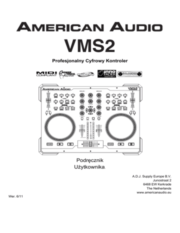 Profesjonalny Cyfrowy Kontroler Podręcznik Użytkownika. A.D.J. Supply Europe B.V. Junostraat 2 6468 EW Kerkrade The Netherlands www.americanaudio.eu Wer. 6/11 Spis treści WAŻNE INFORMACJE DOTYCZĄCE BEZPIECZEŃSTWA ............................................................................................................ 3 ŚRODKI OSTROŻNOŚCI ZWIĄZANE Z ELEKTRYCZNOŚCIĄ ........................................................................................................ 4 INSTRUKCJE DOTYCZĄCE BEZPIECZEŃSTWA .......................................................................................................................... 5 WYPAKOWANIE ...................................................................................................................................................................... 6 WSTĘP ..................................................................................................................................................................................... 6 ŚRODKI OSTROŻNOŚCI PRZY SETUPIE ..................................................................................................................................... 6 GŁÓWNE CECHY ...................................................................................................................................................................... 6 MINIMALNE WYMAGANIA SYSTEMOWE* .............................................................................................................................. 7 SETUP ...................................................................................................................................................................................... 7 INSTALACJA OPROGRAMOWANIA I STEROWNIKA ASIO ........................................................................................................ 8 GŁÓWNE FUNKCJE I ELEMENTY STERUJĄCE ........................................................................................................................... 9 PANEL PRZEDNI – GŁÓWNE FUNKCJE I ELEMENTY STERUJĄCE ............................................................................................ 12 PANEL TYLNY – GŁÓWNE FUNKCJE I ELEMENTY STERUJĄCE ................................................................................................ 13 TRYB INTERFEJSU AUDIO ...................................................................................................................................................... 14 TRYBY LATENCJI MIDI ............................................................................................................................................................ 15 TRYBY EQ ............................................................................................................................................................................... 15 AKTUALIZACJA OPROGRAMOWANIA ................................................................................................................................... 16 PODŁĄCZENIE DO KOMPUTERA ............................................................................................................................................ 18 SETUP .................................................................................................................................................................................... 19 CZYSZCZENIE ......................................................................................................................................................................... 19 WYMIANA CROSSFADERA ..................................................................................................................................................... 20 DANE TECHNICZNE ............................................................................................................................................................... 21 ROHS i WEEE ......................................................................................................................................................................... 23 Tabele MIDI VMS2 MIDI są do pobrania na stronach. www.americanaudio.us www.americanaudio.eu Uwaga: Specyfikacje, ulepszenia konstrukcji urządzenia i obsługi mogą ulec zmianie bez wcześniejszego powiadomienia. Części serwisowe http://parts.americandj.com A.D.J. Supply Europe B.V. – www.americanaudio.eu – VMS 2 Podręcznik Użytkownika Strona 2 WAŻNE INFORMACJE DOTYCZĄCE BEZPIECZEŃSTWA WAŻNE INFORMACJE DOT. BEZPIECZEŃSTWA DLA UŻYTKOWNIKÓW OSTRZEŻENIE: ABY ZAPOBIEGAĆ ZAGROŻENIU POŻAREM LUB , PORAŻENIEM PRĄDEM NALEŻY CHRONIĆ URZĄDZENIE PRZED WODĄ I WILGOCIĄ CAUTION: 1. Należy dbać o stan kabla zasilania. Nie dopuszczać do uszkodzeń i odkształceń; może to doprowadzić do porażenia prądem lub awarii.. Przy wyjmowaniu wtyczki z gniazda należy przytrzymać gniazdko. Nie wolno ciągnąć za kabel. 2. Aby uniknąć porażenia prądem nie wolno otwierać górnej pokrywy, kiedy urządzenie jest podłączone do kontaktu. W razie wystąpienia problemów należy skontaktować się ze sprzedawcą American Audio®. 3. Nie wolno umieszczać metalowych przedmiotów ani wylewać płynów we wnętrzu kontrolera. Grozi to porażeniem prądem lub awarią urządzenia. UWAGA Nie otwierać Ryzyko porażenia prądem UWAGA: ABY ZMNIEJSZYĆ RYZYKO PORAŻENIA PRĄDEM, NIE WOLNO ZDEJMOWAĆ POKRYWY. UŻYTKOWNIK NIE MOŻE WYMIENIAĆ ŻADNYCH CZĘŚCI WEWNĄTRZ URZĄDZENIA. NALEŻY ZWRÓCIĆ SIĘ DO AUTORYZOWANEGO SPRZEDAWCY American Audio Błyskawica umieszczona wewnątrz trójkąta oznacza ostrzeżenie przed występowaniem wewnątrz obudowy nie izolowanych części pod napięciem wystarczająco wysokim, że występuje niebezpieczeństwo porażenia elektrycznego. Wykrzyknik umieszczony wewnątrz trójkąta oznacza, że w dokumentacji załączonej do Kontrolera Mediów są ważne informacje dotyczące jego użytkowania 
