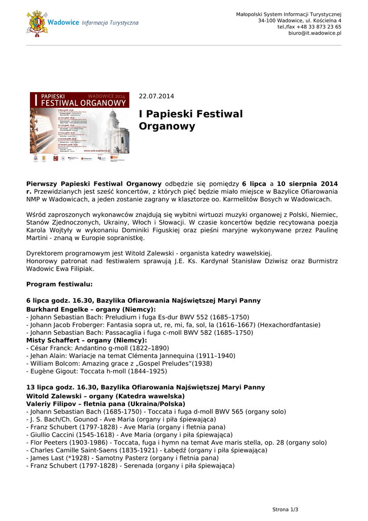 Małopolski System Informacji Turystycznej 34-100 Wadowice, ul. Kościelna 4 tel./fax +48 33 873 23 65 [email protected] 22.07.2014 I Papieski Festiwal Organowy Pierwszy Papieski Festiwal Organowy odbędzie się pomiędzy 6 lipca a 10 sierpnia 2014 r. Przewidzianych jest sześć koncertów, z których pięć będzie miało miejsce w Bazylice Ofiarowania NMP w Wadowicach, a jeden zostanie zagrany w klasztorze oo. Karmelitów Bosych w Wadowicach. Wśród zaproszonych wykonawców znajdują się wybitni wirtuozi muzyki organowej z Polski, Niemiec, Stanów Zjednoczonych, Ukrainy, Włoch i Słowacji. W czasie koncertów będzie recytowana poezja Karola Wojtyły w wykonaniu Dominiki Figuskiej oraz pieśni maryjne wykonywane przez Paulinę Martini - znaną w Europie sopranistkę. Dyrektorem programowym jest Witold Zalewski - organista katedry wawelskiej. Honorowy patronat nad festiwalem sprawują J.E. Ks. Kardynał Stanisław Dziwisz oraz Burmistrz Wadowic Ewa Filipiak. Program festiwalu: 6 lipca godz. 16.30, Bazylika Ofiarowania Najświętszej Maryi Panny Burkhard Engelke – organy (Niemcy): - Johann Sebastian Bach: Preludium i fuga Es-dur BWV 552 (1685–1750) - Johann Jacob Froberger: Fantasia sopra ut, re, mi, fa, sol, la (1616–1667) (Hexachordfantasie) - Johann Sebastian Bach: Passacaglia i fuga c-moll BWV 582 (1685–1750) Misty Schaffert – organy (Niemcy): - César Franck: Andantino g-moll (1822–1890) - Jehan Alain: Wariacje na temat Clémenta Jannequina (1911–1940) - William Bolcom: Amazing grace z „Gospel Preludes”(1938) - Eugène Gigout: Toccata h-moll (1844–1925) 13 lipca godz. 16.30, Bazylika Ofiarowania Najświętszej Maryi Panny Witold Zalewski – organy (Katedra wawelska) Valeriy Filipov – fletnia pana (Ukraina/Polska) - Johann Sebastian Bach (1685-1750) - Toccata i fuga d-moll BWV 565 (organy solo) - J. S. Bach/Ch. Gounod - Ave Maria (organy i piła śpiewająca) - Franz Schubert (1797-1828) - Ave Maria (organy i fletnia pana) - Giullio Caccini (1545-1618) - Ave Maria (organy i piła śpiewająca) - Flor Peeters (1903-1986) - Toccata, fuga i hymn na temat Ave maris stella, op. 28 (organy solo) - Charles Camille Saint-Saens (1835-1921) - Łabędź (organy i piła śpiewająca) - James Last (*1928) - Samotny Pasterz (organy i fletnia pana) - Franz Schubert (1797-1828) - Serenada (organy i piła śpiewająca) Strona 1/3 Małopolski System Informacji Turystycznej 34-100 Wadowice, ul. Kościelna 4 tel./fax +48 33 873 23 65 [email protected] - Henri Mulet (1878-1967) - Tu es Petra (organy solo) 20 lipca godz. 16.30, Bazylika Ofiarowania Najświętszej Maryi Panny s. Susi Ferfoglia – organy (Włochy/Polska) Dominika Figurska – recytacje - Marco Enrico Bossi (1627-1693) - Scherzo g-moll - Johann Sebastian Bach: Chorał „Wachet auf, ruft uns die Stimme”, BWV 645, Koncert a-moll BWV 593 (Allegro), Adagio, Allegro (transkrypcja koncertu a-moll op. 3 nr 8 A. Vivaldiego (RV 522) - Johann Kaspar Kerll (1627-1693) - Capriccio sopra il Cucu - Louis Vierne (1870-1937) - Carillon de Westminster op. 54 nr. 6 27 lipca, godz. 16.30, Klasztor OO Karmelitów Bosych Gail Archer – organy (USA) - Nicolaus Bruhns (1665-1695) - Preludium e-moll - Johann Sebastian Bach (1685-1750) „Allein Gott in der Hoh sei Ehr”, BWV 662, „Komm Heiliger Geist”, BWV 651 - Johanna Senfter (1879-1961) - Fantazja i fuga op. 30 „Wie schon leuchtet der Morgenstern” - Alla Borzova (*1961) - And the greatest of these is love (Inspired by the Chagall and Matisse windows at Union Church, Pocantico, NY) - Nadia Boulanger (1887-1979) Prelude, Petit Canon, Improvisation - Jeanne Demessieux (1921-1968) - Te Deum 3 sierpnia godz.16.30, Bazylika Ofiarowania Najświętszej Maryi Panny Stanislav Surin – organy (Słowacja) - Johann Sebastian Bach (1685-1750) - Passacaglia c-moll, BWV 582 - Mikuláš Schneider-Trnavský (1881-1958) Preludium G-Dur, nr 27, Praeludium c-moll, nr 37, Praeludium f-moll, nr 40 - Franz Schmidt (1874-1939) - „O Ewigkeit, du Donnerwort“(z „Vier kleine Choralvorspiele für Orgel“) - Ľudovít Rajter (1906-2000) - Preludium per organo „Hommage a Franz Schmidt“ - Petr Eben (1929-2007) Die süßen Ketten der Liebe (z „Labyrinth der Welt und Paradies des Herzens) - Jiří Strejc (1932-2012) - Sonata I Preludium – Aria – Toccata 10 sierpnia, godz. 16.30, Bazylika Ofiarowania Najświętszej Maryi Panny Koncert Maryjny - Karol Hila – organy Paulina Martini – sopran - Samuel S. Wesley (1810-1876) - Choral song - Johann Sebastian Bach (1685-1750) - aria Quia respexitz „Magnifikatu” - Johann Ludwig Krebs (1713-1780) - Fuga sopra il Magnificat II toni (organy solo) - Ch.-C. Saint-Saëns (1835-1921) - Ave Maria - Sigfrid Karg-Elert (1877-1933) - „Nach einer Pruefung kurzer Tage” (organy solo) - Jules Émile Frédéric Massenet (1842-1912) - Ave Maria z opery „Thais” - Jan Janca (*1933) - Elegia (organy solo) - Giuseppe Verdi (1813-1901) - Ave Maria z opery „Otello” - Sigfrid Karg-Elert „Dir, dir Jehova wlii ich singen” (organy solo) - Franz Schubert (1797-1828) - Ave Maria op. 52 - Sigfrid Karg-Elert - „Nun danket alle Gott” (organy solo) - Michał Lorenz (*1955) - Ave Maria Więcej szczegółów na temat festiwalu można znaleźć tutaj Strona 2/3 Małopolski System Informacji Turystycznej 34-100 Wadowice, ul. Kościelna 4 tel./fax +48 33 873 23 65 [email protected] Strona 3/3 Powered by TCPDF (www.tcpdf.org)