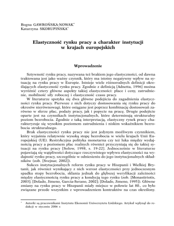 Bogna GAWRO¡SKA-NOWAK* Katarzyna SKORUPI¡SKA* ElastycznoÊç rynku pracy a charakter instytucji w krajach europejskich Wprowadzenie SztywnoÊç rynku pracy, nazywana te˝ brakiem jego elastycznoÊci, od dawna traktowana jest jako wa˝ny czynnik, który ma istotny negatywny wp∏yw na sytuacj´ na rynku pracy w Europie. Istnieje wiele ró˝norodnych definicji okreÊlajàcych elastycznoÊç rynku pracy. Zgodnie z definicjà [Adnetta, 1996] mo˝na wyró˝niç cztery g∏ówne aspekty takiej elastycznoÊci: p∏ace i ceny, zatrudnienie, mobilnoÊç si∏y roboczej i elastycznoÊç czasu pracy. W literaturze spotyka si´ dwa g∏ówne podejÊcia do zagadnienia elastycznoÊci rynku pracy. Pierwsze z nich dotyczy dostosowania si´ rynku pracy do okresów nierównowagi, które osiàgane jest poprzez kombinacj´ dostosowaƒ zarówno w sferze p∏ac, poda˝y pracy, jak i popycie na prac´. Drugie podejÊcie oparte jest na czynnikach instytucjonalnych, które determinujà strukturalny poziom bezrobocia. Zgodnie z takà interpretacjà, elastyczny rynek pracy charakteryzuje si´ wysokim poziomem zatrudnienia i niskim wskaênikiem bezrobocia strukturalnego. Brak elastycznoÊci rynku pracy nie jest jedynym mo˝liwym czynnikiem, który wyjaÊnia relatywnie wysokà stop´ bezrobocia w wielu krajach Unii Europejskiej (UE). Restrykcyjna polityka monetarna czy te˝ luka mi´dzy wydajnoÊcià pracy a poziomem p∏ac realnych równie˝ przyczyniajà si´ do takiej sytuacji na rynku pracy [Solow, 1998, s. 19-22]. JednoczeÊnie w literaturze pojawiajà si´ wàtpliwoÊci dotyczàce rzeczywistego wp∏ywu elastycznoÊci na wydajnoÊç rynku pracy, szczególnie w odniesieniu do jego instytucjonalnych sk∏adników (zob. [Svejnar, 2002]). Sukces instytucjonalnych reform rynku pracy w Hiszpanii i Wielkiej Brytanii, jak równie˝ wynikajàcy z nich wzrost elastycznoÊci przy jednoczesnym spadku stopy bezrobocia, sk∏ania jednak do g∏´bszej weryfikacji zale˝noÊci mi´dzy elastycznoÊcià rynku pracy a kondycjà tego rynku (zob. [Monastiriotis, 2003]; [Dolado, Jimeno, Garcia-Serano, 2002]; [Dolado, Jimeno, 1995]). G∏ówne zmiany na rynku pracy w Hiszpanii mia∏y miejsce w po∏owie lat 80., co by∏o zwiàzane przede wszystkim z wprowadzeniem kontraktów na czas okreÊlony. * Autorki sà pracownikami Instytutu Ekonomii Uniwersytetu ¸ódzkiego. Artyku∏ wp∏ynà∏ do redakcji w styczniu 2006 r. 24 GOSPODARKA NARODOWA Nr 3/2006 Kolejne trzy istotne etapy reform w tym kraju przeprowadzono w latach 1994, 1997 i 2001 [Jimeno, 2002]. Z drugiej strony mamy w∏oski i niemiecki rynek pracy cechujàcy si´ du˝à sztywnoÊcià i wysokà stopà bezrobocia, gdzie nie dokonano znaczàcych zmian instytucjonalnych. Bezrobocie we W∏oszech skupia w sobie prawie wszystkie negatywne cechy bezrobocia europejskiego: regionalnà dywersyfikacj´, wysokà stop´ bezrobocia wÊród m∏odych i wysokie bezrobocie d∏ugookresowe. Nie dokonano tam tak˝e pe∏nej liberalizacji prawa dotyczàcego zatrudniania na czas okreÊlony i pracy w niepe∏nym wymiarze czasu. Wysokie koszty zatrudniania i zwalniania pracowników zwiàzane sà z wysokimi odprawami i doÊç swobodnym prawem do pozywania do sàdu pracodawców z powodu tzw. niesprawiedliwego traktowania (unjust treatment rule) [Demekas, 1995]. Wraz z ostatnim rozszerzeniem Unii Europejskiej powraca pytanie o instytucjonalny model europejskiego rynku pracy, w szczególnoÊci w kontekÊcie kreowania polityki dla nowych paƒstw cz∏onkowskich. Ró˝norakie doÊwiadczenia na tym polu krajów by∏ej „pi´tnastki” okazaç si´ wi´c mogà niezwykle przydatne dla nowych paƒstw UE. Celem niniejszego opracowania jest przedstawienie zmiennych wp∏ywajàcych na zró˝nicowanie elastycznoÊci rynku pracy w krajach OECD, ze zwróceniem szczególnej uwagi na paƒstwa „starej” UE. Analiza obejmuje zarówno tradycyjne podejÊcie do elastycznoÊci oparte na zale˝noÊci mi´dzy p∏acami realnymi a wydajnoÊcià pracy, jak równie˝ podejÊcie obejmujàce instytucjonalny aspekt elastycznoÊci rynku pracy. Opracowanie sk∏ada si´ z pi´ciu cz´Êci. Na poczàtku przedstawione zosta∏y wyniki równania regresji weryfikujàcego wp∏yw p∏ac realnych na wydajnoÊç pracy w 22 krajach OECD. Trzecia czeÊç tekstu zawiera metodologi´ u˝ytej taksonomii, definicje czynników instytucjonalnych i ich znaczenie w kontekÊcie elastycznoÊci rynku pracy. W czwartej cz´Êci zaprezentowano wyniki taksonomii i podj´to prób´ ich wyjaÊnienia, w szczególnoÊci w odniesieniu do krajów, które zaj´∏y skrajne pozycje w rankingu. Uwagi koƒcowe zawarte sà w ostatniej cz´Êci opracowania. Rezultaty regresji Stwierdzenie mówiàce o zró˝nicowaniu elastycznoÊci rynku pracy w poszczególnych krajach Europy wydaje si´ byç ca∏kiem oczywiste. W celu zweryfikowania powy˝szej hipotezy pos∏u˝ymy si´ danymi przekrojowo-czasowymi OECD. Badaç b´dziemy elastycznoÊç p∏ac realnych w odniesieniu do wydajnoÊci pracy w 22 krajach OECD: Austria, Belgia, Kanada, Dania, Finlandia, Francja, Niemcy, Grecja, Irlandia, W∏ochy, Japonia, Holandia, Norwegia, Portugalia, Hiszpania, Szwecja, Szwajcaria, Wielka Brytania i USA w latach 1970-2003 i w oddzielnym okresie 1993-2003 Czechy, W´gry i Polska (zob. równie˝ [Gajewski, Gawroƒska-Nowak, 2003]). Zale˝noÊç przedstawiona zostanie za pomocà nast´pujàcego równania regresji: Bogna Gawroƒska-Nowak, Katarzyna Skorupiƒska, ElastycznoÊç rynku pracy... Y T ln _wit i = a0 + a1T ln e Lit o + it / ci di T ln e YLit o + pit i=2 25 (1) it gdzie: Δ ln (wit) – roczna stopa wzrostu p∏ac realnych w kraju i, w roku t; Y T ln e Lit o – stopa wzrostu realnej wydajnoÊci pracy w kraju i, w roku t; it a0 – sta∏a odzwierciedlajàca stop´ wzrostu p∏acy realnej przy stopie wzrostu realnej wydajnoÊci pracy równej zero; a1 – elastycznoÊç wit wzgl´dem e Yit o w kraju bazowym; Lit a1 + gi – elastycznoÊç wit wzgl´dem e Yit o w niebaz