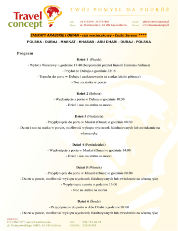 EMIRATY ARABSKIE I OMAN - rejs wycieczkowy - Costa Serena **** POLSKA - DUBAJ - MASKAT - KHASAB - ABU DHABI - DUBAJ - POLSKA Program Dzień 1 (Piątek) - Wylot z Warszawy o godzinie 13:40 (bezpośredni przelot liniami Emirates Airlines) - Przylot do Dubaju o godzinie 22:15 - Transfer do portu w Dubaju i zaokrętowanie na statku (około północy) - Noc na statku w porcie Dzień 2 (Sobota) - Wypłynięcie z portu w Dubaju o godzinie 10:30 - Dzień i noc na statku na morzu Dzień 3 (Niedziela) - Przypłynięcie do portu w Maskat (Oman) o godzinie 08:30 - Dzień i noc na statku w porcie, możliwość wykupu wycieczek fakultatywnych lub zwiedzanie na własną rękę Dzień 4 (Poniedziałek) - Wypłynięcie z portu w Maskat (Oman) o godzinie 14:00 - Dzień i noc na statku na morzu Dzień 5 (Wtorek) - Przypłynięcie do portu w Khasab (Oman) o godzinie 08:00 - Dzień w porcie, możliwość wykupu wycieczek fakultatywnych lub zwiedzanie na własną rękę - Wypłynięcie z portu o godzinie 16:00 - Noc na statku na morzu Dzień 6 (Środa) - Przypłynięcie do portu w Abu Dhabi o godzinie 09:00 - Dzień w porcie, możliwość wykupu wycieczek fakultatywnych lub zwiedzanie na własną rękę - Wypłynięcie z portu o godzinie 18:00 - Noc na statku morzu Dzień 7 (Czwartek) - Przypłynięcie do portu w Dubaju o godzinie 08:00 - Dzień w porcie, możliwość wykupu wycieczek fakultatywnych lub zwiedzanie na własną rękę - Noc na statku w porcie Dzień 8 (Piątek) – Przypłynięcie do portu w Dubaju o godzinie 08:00- Dzień w porcie, możliwość wykupu wycieczek fakultatywnych lub zwiedzanie na własną rękę - Wyokrętowanie ze statku (wczesne godziny poranne) i transfer na lotnisko w Dubaju - Wylot z Dubaju o godzinie 07:30 - Przylot do Warszawy o godzinie 10:45 – Istnieje możliwość przedłużenia rejsu o wypoczynek w dowolnym hotelu w Emiratach Arabskich. Linia żeglugowa Rejs w prawdziwie włoskim stylu, La Dolce Vita, to esencja Costa Cruises. Linia idealna na rodzinne wakacje, oferuje fantastyczne atrakcje i wspaniałą rozrywkę zarówno dla dzieci, rodziców jak i dziadków. Dzieci pokochają Costa Kids Program, gdzie będą mogły wziąć udział w Pizza parties, poszukiwaniu skarbów i wielu innych specjalnie dla nich przygotowanych zajęciach. Dorośli mogą zakosztować prawdziwego relaksu w Samsara Spa. Posiłki na pokładach statków Costa Cruises to prawdziwa rozkosz. Armator oferuje w tym zakresie wiele możliwości włączając w to tradycyjne potrawy, menu a la carte w klubowej restauracji, pizza, grill na górnym pokładzie, pijalnie czekolady i kawy, angielskie podwieczorki. Dostępnie jest także menu dla dzieci. Ci, którzy lubią gotować mogą uczestniczyć w pokazach kucharskich. Tutaj co wieczór każdy znajdzie coś dla siebie. Goście mogą wybrać się na spektakl do teatru, przetańczyć całą noc w dyskotece, wybrać się na koncert jazzowy na żywo, zrelaksować w Cigar Barze lub Piano Barze, każdy może także spróbować swojego szczęścia w kasynie. Goście nastawieni na zwiedzanie odnajdą na statku bardzo bogatą ofertę unikalnych wycieczek fakultatywnych przygotowanych specjalnie dla każdego portu podróży. Po dniu pełnym atrakcji goście mogą wypocząć w swoich przestronnych kabinach. Każda z nich jest oazą spokoju z pełnym wyposażeniem, licznymi udogodnieniami, telewizją satelitarną, klimatyzacją i sejfem. Wszystkie kabiny urządzone są w nowoczesnym, włoskim stylu, a do dyspozycji każdego gościa pozostaje dedykowana osoba z obsługi. Statek Costa Serena to prawdziwa pływająca "świątynia" rozrywki. Inspiracją dla twórców statku była mitologia oraz starożytny Rzym. Rok budowy - 2007 Pasażerowie - 3780 Załoga - 1100 (włoska, międzynarodowa) Wyporność - 114500 ton Prędkość - 21,5 węzłów Długość - 290 m Szerokość - 35 m Liczba pokładów - 17 Kabiny wewnętrzne - 586 Kabiny zewnętrzne - 343 Kabiny z balkonami - 501 Apartamenty - 70 Kabiny dla os. niepełnosprawnych - 28 Napięcie elektryczne - 110 V Baseny (odkryte) - 1 Baseny (kryte) - 2 Jacuzzi - 5 Restauracje - 5 Bary i kawiarnie - 6 Pozostałe (bezpłatne) - Teatr, biblioteka, fitness, siłownia, miejsce zabaw dla dzieci, dyskoteka, kaplica. Pozostałe (dodatkowo płatne) - Sala gier, sala gier wideo, symulator Formuły 1, kino 4D, kasyno, sala taneczna, sklepy, centrum SPA, salon piękności, fryzjer, pralnia, punkt medyczny. Kabiny Kabiny wewnętrzne Interior Classic (IC Classic) o powierzchni ok. 14 m² wyposażone są w podwójne lub pojedyncze łóżka (na życzenie). Łazienka z prysznicem (suszarka, szlafroki, podstawowe kosmetyki), TV sat, Wi-Fi (za dodatkową opłatą ok. 20 USD / 15 minut), telefon, sejf, minibar, klimatyzacja. Możliwość zakwaterowania do 4 osób dorosłych. Dostawki typu pullman bed (opuszczane z sufitu lub ściany) lub wysuwane z głównych łóżek. Wyżywienie FB - Śniadania, obiady i kolacje w formie bufetów (w cenie woda, herbata i kawa podczas posiłków), przekąski w ciągu dnia. Możliwość korzystania z restauracji a'la Carte każdego dnia (wówczas woda, herbata i kawa dodatkowo płatne). Dodatkowo płatne są ponadto napoje, soki i alkohole. All Inclusive - Śniadania, obiady i kolacje w formie bufetów (w cenie woda, herbata i kawa podczas posiłków), przekąski w ciągu dnia. Możliwość korzystania z restauracji a'la Carte każdego dnia (wówczas woda, herbata i kawa dodatkowo płatne). Pakiet All Inclusive obejmuje dodatkowo większość napoi, soków i alkoholi (dokładny opis w menu każdego z barów). Uwagi Na godzinę przed wypłynięciem statku zamykane są bramki "check-in" w porcie. Przed wejściem na statek obsługa zabiera bagaż i dostarcza go do kabiny Klientów, a w dniu wyokrętowania obsługa odbiera bagaż. Prosimy pamiętać o czytelnym wypełnieniu naklejki bagażowej. Serwis bagażowy wliczony jest już w cenę. Na wszystkich rejsach obowiązuje bezgotówkowy system opłat. Każdy pas
