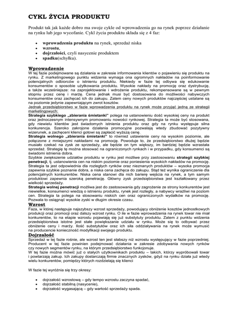 CYKL ŻYCIA PRODUKTU Produkt tak jak każde dobro ma swoje cykle od wprowadzenia go na rynek poprzez działanie na rynku lub jego wycofanie. Cykl życia produktu składa się z 4 faz: wprowadzenia produktu na rynek, sprzedaż niska wzrostu, dojrzałości, czyli nasycenie produktem spadku(schyłku). Wprowadzenie W tej fazie podejmowane są działania w zakresie informowania klientów o pojawieniu się produktu na rynku. Z marketingowego punktu widzenia wymaga ona ogromnych nakładów na poinformowanie potencjalnych odbiorców o istnieniu produktu. Niekiedy w fazie tej odbywa się edukowanie konsumentów o sposobie użytkowania produktu. Wysokie nakłady na promocję oraz dystrybucję, a także wcześniejsze: na zaprojektowanie i wdrożenie produktu, rekompensowane są w pewnym stopniu przez cenę i marżę. Cena jednak musi być dostosowana do możliwości nabywczych konsumentów oraz zachęcać ich do zakupu. Zatem ceny nowych produktów najczęściej ustalane są na poziomie jedynie zapewniającym zwrot kosztów. Jednak przedsiębiorstwo w fazie wprowadzenia produktu na rynek może przyjąć jedną ze strategii marketingowych: Strategia szybkiego „zbierania śmietanki” polega na ustanowieniu dość wysokiej ceny na produkt oraz jednoczesnym intensywnym promowaniu nowości rynkowej. Strategia ta może być stosowana, gdy niewielu klientów jest świadomych istnienia produktu oraz gdy na rynku występuje silna konkurencja. Szeroko zakrojone działania promocyjne pozwalają wtedy zbudować pozytywny wizerunek, a zachęceni klienci gotowi są zapłacić wyższą cenę. Strategia wolnego „zbierania śmietanki” to również ustawienie ceny na wysokim poziomie, ale połączone z mniejszymi nakładami na promocję. Powoduje to, że przedsiębiorstwo dłużej będzie musiało czekać na zysk ze sprzedaży, ale będzie on tym większy, im bardziej będzie wzrastała sprzedaż. Strategię tę można stosować na ograniczonych rynkach i w przypadku, gdy konsumenci są świadomi istnienia dobra. Szybkie zwiększenie udziałów produktu w rynku jest możliwe przy zastosowaniu strategii szybkiej penetracji, tj. ustanowienia cen na niskim poziomie oraz poniesienia wysokich nakładów na promocję. Strategia ta jest odpowiednia dla rozległych rynków oraz nieznanych produktów – wysoka promocja zapewnia szybkie poznanie dobra, a niska cena zachęca do zakupu. Stąd też wynika ograniczenie dla potencjalnych konkurentów. Niska cena stanowi dla nich barierę wejścia na rynek, a tym samym produktowi zapewnia szeroką penetrację. Główny zysk przedsiębiorstwa jest kształtowany przez wielkość sprzedaży. Strategia wolnej penetracji możliwa jest do zastosowania gdy zagrożenie ze strony konkurentów jest niewielkie, konsumenci wiedzą o istnieniu produktu, rynek jest rozległy, a nabywcy wrażliwi na poziom cen. Strategia ta polega na stosowaniu niskich cen oraz ograniczonych wydatków na promocję. Pozwala to osiągnąć wysokie zyski w długim okresie czasu. Wzrost Faza, w której następuje najszybszy wzrost sprzedaży, powodujący obniżenie kosztów jednostkowych produkcji oraz promocji oraz dalszy wzrost rynku. O ile w fazie wprowadzenia na rynek towar nie miał konkurentów, to na etapie wzrostu pojawiają się już substytuty produktu. Zatem z punktu widzenia przedsiębiorstwa istotne jest stałe powiększanie udziału w rynku. Może się to odbywać przez obniżenie ceny i marży. Ilość substytutów oraz ich siła oddziaływania na rynek może wymusić na producencie konieczność modyfikacji swojego produktu. Dojrzałość Sprzedaż w tej fazie rośnie, ale wzrost ten jest słabszy niż wzrostu występujący w fazie poprzedniej. Producent w tej fazie powinien podejmować działania w zakresie zdobywania nowych rynków czy nowych segmentów rynku, na którym przedsiębiorstwo funkcjonuje. W tej fazie można mówić już o stałych użytkownikach produktu – takich, którzy wypróbowali towar i powtarzają zakup. Ich zakupy dostarczają firmie znacznych zysków, gdyż na rynku działa już wtedy wielu konkurentów, pomiędzy których rozdzielają się klienci W fazie tej wyróżnia się trzy okresy: dojrzałość wzrostową – gdy tempo wzrostu zaczyna spadać, dojrzałość stabilną (nasycenie), dojrzałość wygasającą – gdy wartość sprzedaży spada. Faza dojrzałości charakteryzuje się tym, że klienci są w mniejszym stopniu podatni na reklamę, a decydujące znaczenie zaczyna mieć cena. To właśnie na tym etapie pojawiają się obniżki, promocje i opusty mające zachęcić konsumentów do kolejnych zakupów. Wprawdzie zyski jednostkowe maleją, zwłaszcza za sprawą zintensyfikowanej dystrybucji, ale produkt nadal ma nabywców i zapewnia firmie przychód. Długość tego stanu rzeczy zależy od kilku czynników. Przede wszystkim od rodzaju branży (im stabilniejsza, tym faza dojrzałości dłuższa), gustów odbiorców, od tego, czy przedsiębiorstwo jest liderem na rynku, i od stopnia innowacyjności towaru (im bardziej przełomowy wynalazek, tym większą ma szansę dłużej istnieć na rynku). Producent może próbować przedłużyć tę fazę poprzez modyfikację jakości, cech użytkowych lub zewnętrznego wyglądu, co ma swoje uzasadnienie w zachowaniu poszczególnych segmentów rynku. Klienci znają już produkt dobrze i rozpoczynają poszukiwania jego odmian najbardziej zaspokajających ich potrzeby oraz dogodnych punktów sprzedaży. Spadek W fazie tej następuje spadek produkcji i sprzedaży. Przestaje działać reklama i inne instrumenty promocji. Skutecznym instrumentem promocji może być obniżanie ceny, znalezienie nowych kanałów dystrybucji, zastosowań, klientów lub modyfikacja. Ważne jest, aby w czasie, kiedy sprzedaż zaczyna spadać, przedsiębiorstwo zidentyfikowało słabe punkty firmy oraz zebrało dokładne informacje o dotychczasowej sprzedaży (udział w rynku, koszty, ceny). Dopiero na tej podstawie można podjąć decyzję o: poz