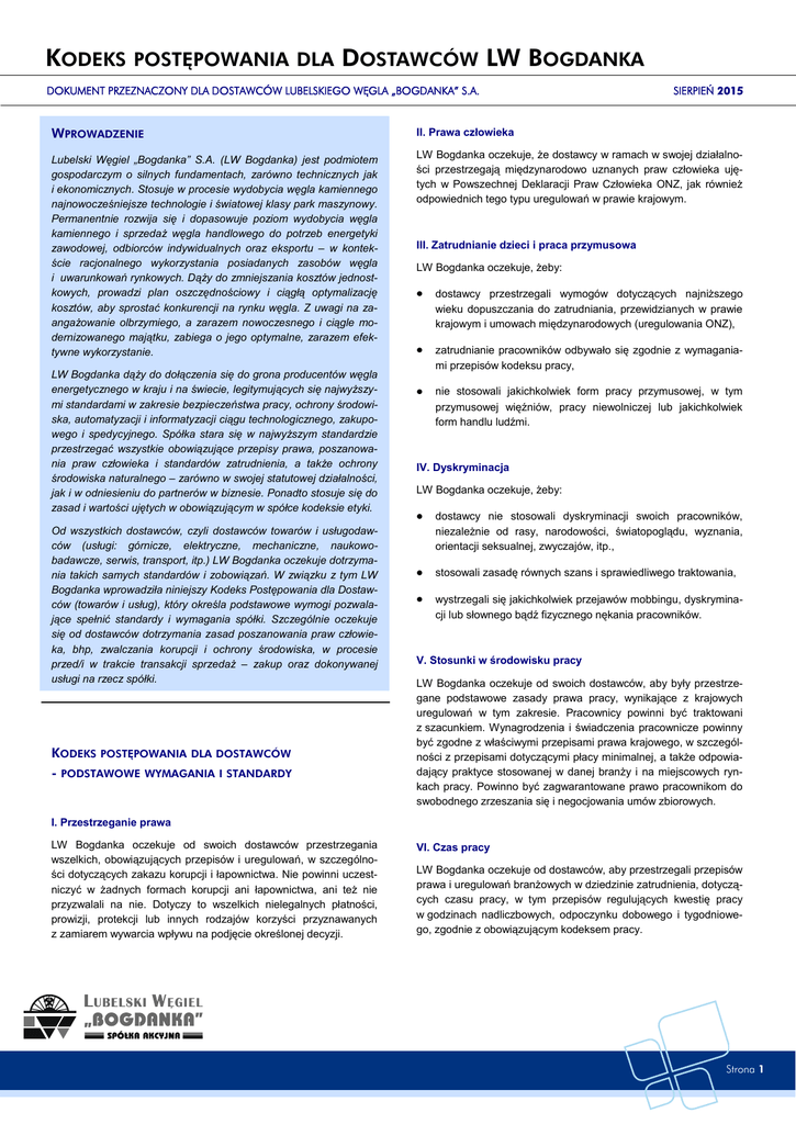 KODEKS POSTĘPOWANIA DLA DOSTAWCÓW LW BOGDANKA DOKUMENT PRZEZNACZONY DLA DOSTAWCÓW LUBELSKIEGO WĘGLA „BOGDANKA” S.A. SIERPIEŃ 2015 WPROWADZENIE II. Prawa człowieka Lubelski Węgiel „Bogdanka” S.A. (LW Bogdanka) jest podmiotem gospodarczym o silnych fundamentach, zarówno technicznych jak i ekonomicznych. Stosuje w procesie wydobycia węgla kamiennego najnowocześniejsze technologie i światowej klasy park maszynowy. Permanentnie rozwija się i dopasowuje poziom wydobycia węgla kamiennego i sprzedaż węgla handlowego do potrzeb energetyki zawodowej, odbiorców indywidualnych oraz eksportu – w kontekście racjonalnego wykorzystania posiadanych zasobów węgla i uwarunkowań rynkowych. Dąży do zmniejszania kosztów jednostkowych, prowadzi plan oszczędnościowy i ciągłą optymalizację kosztów, aby sprostać konkurencji na rynku węgla. Z uwagi na zaangażowanie olbrzymiego, a zarazem nowoczesnego i ciągle modernizowanego majątku, zabiega o jego optymalne, zarazem efektywne wykorzystanie. LW Bogdanka oczekuje, że dostawcy w ramach w swojej działalności przestrzegają międzynarodowo uznanych praw człowieka ujętych w Powszechnej Deklaracji Praw Człowieka ONZ, jak również odpowiednich tego typu uregulowań w prawie krajowym. LW Bogdanka dąży do dołączenia się do grona producentów węgla energetycznego w kraju i na świecie, legitymujących się najwyższymi standardami w zakresie bezpieczeństwa pracy, ochrony środowiska, automatyzacji i informatyzacji ciągu technologicznego, zakupowego i spedycyjnego. Spółka stara się w najwyższym standardzie przestrzegać wszystkie obowiązujące przepisy prawa, poszanowania praw człowieka i standardów zatrudnienia, a także ochrony środowiska naturalnego – zarówno w swojej statutowej działalności, jak i w odniesieniu do partnerów w biznesie. Ponadto stosuje się do zasad i wartości ujętych w obowiązującym w spółce kodeksie etyki. Od wszystkich dostawców, czyli dostawców towarów i usługodawców (usługi: górnicze, elektryczne, mechaniczne, naukowobadawcze, serwis, transport, itp.) LW Bogdanka oczekuje dotrzymania takich samych standardów i zobowiązań. W związku z tym LW Bogdanka wprowadziła niniejszy Kodeks Postępowania dla Dostawców (towarów i usług), który określa podstawowe wymogi pozwalające spełnić standardy i wymagania spółki. Szczególnie oczekuje się od dostawców dotrzymania zasad poszanowania praw człowieka, bhp, zwalczania korupcji i ochrony środowiska, w procesie przed/i w trakcie transakcji sprzedaż – zakup oraz dokonywanej usługi na rzecz spółki. KODEKS POSTĘPOWANIA DLA DOSTAWCÓW - PODSTAWOWE WYMAGANIA I STANDARDY III. Zatrudnianie dzieci i praca przymusowa LW Bogdanka oczekuje, żeby: dostawcy przestrzegali wymogów dotyczących najniższego wieku dopuszczania do zatrudniania, przewidzianych w prawie krajowym i umowach międzynarodowych (uregulowania ONZ), zatrudnianie pracowników odbywało się zgodnie z wymaganiami przepisów kodeksu pracy, nie stosowali jakichkolwiek form pracy przymusowej, w tym przymusowej więźniów, pracy niewolniczej lub jakichkolwiek form handlu ludźmi. IV. Dyskryminacja LW Bogdanka oczekuje, żeby: dostawcy nie stosowali dyskryminacji swoich pracowników, niezależnie od rasy, narodowości, światopoglądu, wyznania, orientacji seksualnej, zwyczajów, itp., stosowali zasadę równych szans i sprawiedliwego traktowania, wystrzegali się jakichkolwiek przejawów mobbingu, dyskryminacji lub słownego bądź fizycznego nękania pracowników. V. Stosunki w środowisku pracy LW Bogdanka oczekuje od swoich dostawców, aby były przestrzegane podstawowe zasady prawa pracy, wynikające z krajowych uregulowań w tym zakresie. Pracownicy powinni być traktowani z szacunkiem. Wynagrodzenia i świadczenia pracownicze powinny być zgodne z właściwymi przepisami prawa krajowego, w szczególności z przepisami dotyczącymi płacy minimalnej, a także odpowiadający praktyce stosowanej w danej branży i na miejscowych rynkach pracy. Powinno być zagwarantowane prawo pracownikom do swobodnego zrzeszania się i negocjowania umów zbiorowych. I. Przestrzeganie prawa LW Bogdanka oczekuje od swoich dostawców przestrzegania wszelkich, obowiązujących przepisów i uregulowań, w szczególności dotyczących zakazu korupcji i łapownictwa. Nie powinni uczestniczyć w żadnych formach korupcji ani łapownictwa, ani też nie przyzwalali na nie. Dotyczy to wszelkich nielegalnych płatności, prowizji, protekcji lub innych rodzajów korzyści przyznawanych z zamiarem wywarcia wpływu na podjęcie określonej decyzji. VI. Czas pracy LW Bogdanka oczekuje od dostawców, aby przestrzegali przepisów prawa i uregulowań branżowych w dziedzinie zatrudnienia, dotyczących czasu pracy, w tym przepisów regulujących kwestię pracy w godzinach nadliczbowych, odpoczynku dobowego i tygodniowego, zgodnie z obowiązującym kodeksem pracy. Strona 1 KODEKS POSTĘPOWANIA DLA DOSTAWCÓW LW BOGDANKA DOKUMENT PRZEZNACZONY DLA DOSTAWCÓW LUBELSKIEGO WĘGLA „BOGDANKA” S.A. SIERPIEŃ 2015 VII. Bezpieczeństwo i higiena pracy XII. Zaproszenia i prezenty LW Bogdanka oczekuje, aby dostawcy przestrzegali wszystkich obowiązujących przepisów prawa i uregulowań w dziedzinie bhp. Podejmowali zobowiązania do stałego podnoszenia poziomu bhp, celem ochrony pracowników przed zagrożeniami i eliminowania wypadków przy pracy i chorób zawodowych. Wyposażali swoich pracowników w sprzęt ochronny i odzież roboczą zgodnie z wymogami odpowiednich przepisów. LW Bogdanka oczekuje od dostawców, aby nie nadużywali zaproszeń na poczęstunek biznesowy, spotkania kulturalne i sportowe, podróże, seminaria oraz konferencje i przekazywania prezentów pracownikom spółki. Zaproszenia i prezenty dla pracowników LW Bogdanka lub powiązanych z nimi bliskich osób mogą być tylko udzielone, jeśli dotyczy to małowartościowych przedmiotów, które zwyczajowo występują w pra