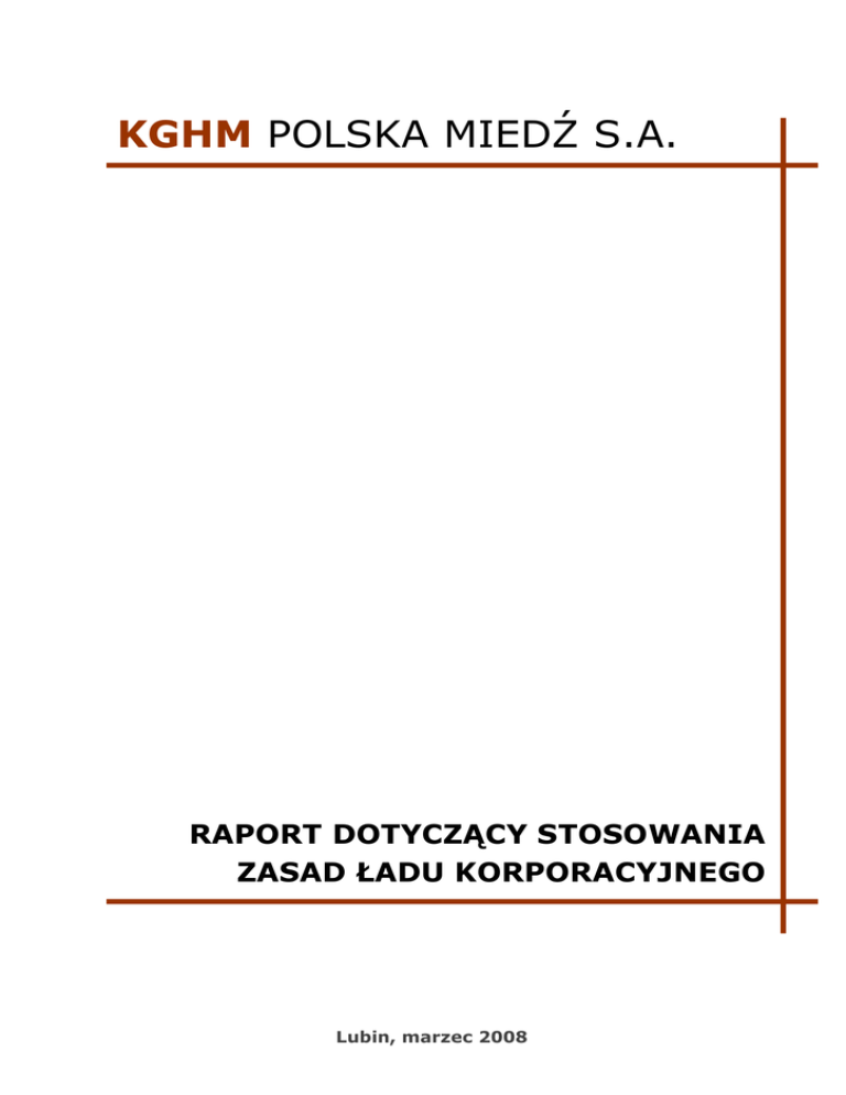 KGHM POLSKA MIEDŹ S.A. RAPORT DOTYCZĄCY STOSOWANIA ZASAD ŁADU KORPORACYJNEGO Lubin, marzec 2008 KGHM Polska Miedź S.A. Raport dotyczący stosowania zasad ładu korporacyjnego w 2007 roku Zarząd KGHM Polska Miedź S.A. przekazuje raport dotyczący stosowania korporacyjnego w 2007 roku, o którym mowa w §29 ust. 5 Regulaminu Giełdy. zasad ładu A) WSKAZANIE ZASAD ŁADU KORPORACYJNEGO, KTÓRE NIE BYŁY PRZEZ SPÓŁKĘ STOSOWANE, WRAZ ZE WSKAZANIEM JAKIE BYŁY OKOLICZNOŚCI I PRZYCZYNY NIE ZASTOSOWANIA DANEJ ZASADY ORAZ W JAKI SPOSÓB SPÓŁKA ZAMIERZA USUNĄĆ EWENTUALNE SKUTKI NIE ZASTOSOWANIA DANEJ ZASADY LUB JAKIE KROKI ZAMIERZA PODJĄĆ, BY ZMNIEJSZYĆ RYZYKO NIE ZASTOSOWANIA DANEJ ZASADY W PRZYSZŁOŚCI Na początku roku 2007 Spółka ponownie przyjęła do stosowania wszystkie zasady ładu korporacyjnego ujęte w „Dobrych praktykach w spółkach publicznych 2005” (z zastrzeżeniem dotyczącym zasady 20 o niezależności członków rad nadzorczych). „Oświadczenie KGHM Polska Miedź S.A. w sprawie stosowania w Spółce zasad ładu korporacyjnego” zostało podpisane przez Zarząd Spółki w dniu 15 lutego 2007 roku, kontrasygnowane przez Radę Nadzorczą w dniu 23 lutego 2007 roku, opublikowane wraz z raportem rocznym za 2006 rok w dniu 12 marca 2007 roku i zaakceptowane przez Walne Zgromadzenie w dniu 30 maja 2007 roku. Zastrzeżenie przy zasadzie 20 zostało wyjaśnione w następującym komentarzu do tej zasady: Ze względu na specyfikę i charakter Spółki, do której nadal stosuje się przepisy ustawy z dnia 30 sierpnia 1996 r. o komercjalizacji i prywatyzacji przedsiębiorstw państwowych, w zakresie dotyczącym składu Rady Nadzorczej (1/3 członków rady Nadzorczej jest wybierana przez pracowników Spółki), jak też biorąc pod uwagę, że Skarb Państwa jako specyficzny akcjonariusz posiadając ponad 44% akcji Spółki, nadal jest akcjonariuszem dominującym, a także ze względu na charakterystykę rozkładu głosów na walnych zgromadzeniach i radzie nadzorczej, Zarząd i Rada Nadzorcza Spółki, zarekomendowały Walnemu Zgromadzeniu zmianę statutu, w myśl której Spółka wypełniać będzie kryteria niezależności członków Rady Nadzorczej w sposób analogiczny jak opisany pod lit.d) Zasady Nr 20, gdy jeden akcjonariusz posiada pakiet akcji dający ponad 50% ogólnej liczby głosów. Walne Zgromadzenie tę rekomendację przyjęło i uchwalona oraz zarejestrowana przez sąd rejestrowy treść statutu w tym zakresie (§16ust.5-8) przedstawia się następująco: „5. Co najmniej dwóch członków Rady Nadzorczej powinno być członkami niezależnymi, spełniając następujące kryteria: 1) nie pozostaje ze Spółką, jej oddziałem, ani z podmiotem powiązanym ze Spółką w stosunku pracy lub jakimkolwiek innym stosunku prawnym o podobnym charakterze, 2) nie jest członkiem Rady Nadzorczej lub Zarządu podmiotu powiązanego ze Spółką, 3) nie jest wspólnikiem lub akcjonariuszem dysponującym 5% lub większą liczbą głosów na Walnym Zgromadzeniu Spółki lub Zgromadzeniu Wspólników albo Walnym Zgromadzeniu podmiotu powiązanego, 4) nie jest członkiem Rady Nadzorczej lub Zarządu lub pracownikiem podmiotu dysponującego 5% lub większą liczbą głosów na Walnym Zgromadzeniu Spółki lub Zgromadzeniu Wspólników albo Walnym Zgromadzeniu podmiotu powiązanego, 5) nie jest wstępnym, zstępnym, małżonkiem, bratem lub siostrą, rodzicem małżonka albo osobą pozostającą w stosunku przysposobienia wobec którejkolwiek z osób wymienionych powyżej w punktach 1-4. 6. Niezależny członek Rady Nadzorczej powinien spełniać kryteria niezależności określone w ust.5, przez cały okres trwania jego mandatu. W przypadku, gdy Rada Nadzorcza lub Zarząd Spółki poweźmie wiadomość, że niezależny członek Rady Nadzorczej Spółki, przestał w trakcie trwania mandatu spełniać kryteria niezależności i gdy uniemożliwia to spełnienie przez Spółkę kryterium posiadania co najmniej dwóch członków niezależnych, należy podjąć czynności, mające na celu wcześniejsze złożenie mandatu przez takiego członka Rady Nadzorczej lub jego odwołanie. 7. Przed powołaniem do składu Rady Nadzorczej Spółki, osoba kandydująca na niezależnego członka Rady, zobowiązana jest złożyć oświadczenie na piśmie, iż spełnia kryteria niezależności, określone w ust. 5. 8. Przez podmiot powiązany, o którym mowa w ust.5, rozumie się podmiot dominujący wobec Spółki, podmiot zależny wobec Spółki lub podmiot zależny wobec podmiotu dominującego wobec Spółki. Dominację lub zależność wobec Spółki, określa się 1 KGHM Polska Miedź S.A. Raport dotyczący stosowania zasad ładu korporacyjnego w 2007 roku odpowiednio w oparciu o właściwe przepisy Kodeksu spółek handlowych lub ustawy o rachunkowości”. Zgodnie z zasadą 19 kandydatury członków Rady Nadzorczej powinny być zgłaszane i szczegółowo uzasadniane w sposób umożliwiający dokonanie świadomego wyboru. W dotychczasowej praktyce Spółki, kandydatów do Rady Nadzorczej przedstawiano w trakcie obrad Walnego Zgromadzenia. Spółka dokłada starań, aby nazwiska kandydatów były wcześniej podawane do publicznej wiadomości. Najistotniejsze zapisy zasad ładu korporacyjnego znalazły swoje odzwierciedlenie (zostały wzmocnione) w podstawowych dokumentach regulujących działanie Spółki: 1. Statut KGHM Polska Miedź S.A. 2. Regulamin obrad Walnego Zgromadzenia KGHM Polska Miedź S.A. 3. Regulamin Rady Nadzorczej KGHM Polska Miedź S.A. 4. Regulamin Zarządu KGHM Polska Miedź S.A. Powyższe dokumenty oraz „Oświadczenie KGHM Polska Miedź S.A. z siedzibą w Lubinie w sprawie stosowania w Spółce zasad ładu korporacyjnego” zamieszczone są na stronie internetowej Spółki www.kghm.pl. B) OPIS SPOSOBU DZIAŁANIA WALNEGO ZGROMADZENIA I JEGO ZASADNICZYCH UPRAWNIEŃ ORAZ PRAW AKCJONARIUSZY I SPOSOBU ICH WYKONYWANIA Sposób działania Walnego Zgromadzenia KGHM Polska 