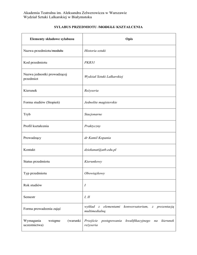 Akademia Teatralna im. Aleksandra Zelwerowicza w Warszawie Wydział Sztuki Lalkarskiej w Białymstoku SYLABUS PRZEDMIOTU /MODUŁU KSZTAŁCENIA Elementy składowe sylabusu Opis Nazwa przedmiotu/modułu Historia sztuki Kod przedmiotu PKR31 Nazwa jednostki prowadzącej przedmiot Wydział Sztuki Lalkarskiej Kierunek Reżyseria Forma studiów (Stopień) Jednolite magisterskie Tryb Stacjonarne Profil kształcenia Praktyczny Prowadzący dr Kamil Kopania Kontakt [email protected] Status przedmiotu Kierunkowy Typ przedmiotu Obowiązkowy Rok studiów I Semestr I, II Forma prowadzenia zajęć wykład z elementami konwersatorium, z multimedialną Wymagania uczestnictwa) wstępne (warunki Przejście reżyseria postępowania kwalifikacyjnego prezentacją na kierunek Akademia Teatralna im. Aleksandra Zelwerowicza w Warszawie Wydział Sztuki Lalkarskiej w Białymstoku Cele przedmiotu/modułu Zajęcia z historii sztuki zostały pomyślane jako zwięzły, możliwie szeroki przegląd najważniejszych zjawisk artystycznych od czasów Faraonów po połowę XX wieku. Z racji na ograniczenia czasowe przedmiotem wykładu będzie sztuka kręgu kultury europejskiej. Chronologicznie zostaną omówione zabytki architektury, malarstwa i rzeźby kolejnych okresów historycznych. Celem wykładu będzie podanie i usystematyzowanie podstawowej wiedzy z zakresu historii sztuki, odnoszącej się do kwestii związanych ze stylem, ikonografią oraz funkcją dzieł tworzonych w poszczególnych epokach. Wykład będzie prowadzony w oparciu o bogaty materiał ilustracyjny w formie prezentacji powerpoint. Treści kształcenia Semestr I, II Sztuka kręgu kultury europejskiej: 1000 p.n.e. – poł. XX w. – malarstwo, rzeźba, architektura, inne media artystyczne W zakresie wiedzy (W) student: jest wyposażony w rzetelne podstawy ogólnej wiedzy z zakresu historii sztuki i doktryn artystycznych, ze szczególnym uwzględnieniem wiedzy w zakresie związków sztuk plastycznych z kulturą (R_W2), zna i rozumie podstawowe linie rozwojowe sztuk plastycznych i doktryn artystycznych oraz ma orientację w piśmiennictwie związanym z tym zagadnieniem (R_W4), wykazuje głębokie zrozumienie wzajemnych relacji między postawami estetycznymi a treściami utworów literackich, w szczególności scenicznych, a także wykorzystuje tę wiedzę do dalszego rozwoju artystycznego (R_W7), Efekty kształcenia W zakresie umiejętności (U) student: rozumie istotę konstrukcji dzieła sztuki, samodzielnie ocenia dzieło sztuki w aspekcie wydobycia jego treści estetycznych (R_U2), posiada umiejętność świadomego posługiwania się słownictwem estetycznym w odniesieniu do realizacji własnych projektów artystycznych (R_U3), umie swobodnie wypowiadać się na temat form plastycznych obecnych w twórczości teatralnej (R_U14). W zakresie kompetencji społecznych (K) student: 1. umie dostrzec jednostkowe i społeczne konsekwencje oddziaływania sztuk plastycznych (R_K1), 2. jest zdolny efektywnie łączyć wyobraźnię oraz intuicję z racjonalnym dyskursem na tematy związane ze sztukami plastycznymi w płaszczyźnie kontaktów społecznych Akademia Teatralna im. Aleksandra Zelwerowicza w Warszawie Wydział Sztuki Lalkarskiej w Białymstoku (R_K2), 3. jest zdolny do konstruktywnej krytyki w stosunku do działań artystycznych innych osób (R_K4), 4. jest zdolny do podjęcia refleksji na temat etycznych aspektów związanych z własną ekspresją artystyczną (R_K5) Forma zaliczenia przedmiotu I sem. - Zaliczenie II sem. - Zaliczenie z oceną Sposoby weryfikacji Obecność na zajęciach i ocena aktywności w ich trakcie (uczestnictwo w dyskusji) Liczba godzin zajęć dydaktycznych 60 godz. Liczba punktów ECTS 2 pkt. Język wykładowy polski Wykaz literatury podstawowej 1. Ernst Gombrich, O sztuce, Warszawa 1997 [i inne, późniejsze wydania] 2. Hugh Honour, John Fleming, Historia sztuki świata, Warszawa 2002 Wykaz literatury uzupełniającej 1. Sztuka świata, T. 1-13, Warszawa 1989-2000 Uwagi - Akademia Teatralna im. Aleksandra Zelwerowicza w Warszawie Wydział Sztuki Lalkarskiej w Białymstoku SYLABUS PRZEDMIOTU /MODUŁU KSZTAŁCENIA Elementy składowe sylabusu Opis Nazwa przedmiotu/modułu Historia sztuki Kod przedmiotu PKR31 Nazwa jednostki prowadzącej przedmiot Wydział Sztuki Lalkarskiej Kierunek Reżyseria Forma studiów (Stopień) Jednolite magisterskie Tryb Stacjonarne Profil kształcenia Praktyczny Prowadzący dr Kamil Kopania Kontakt [email protected] Status przedmiotu Kierunkowy Typ przedmiotu Obowiązkowy Rok studiów III Semestr V, VI Forma prowadzenia zajęć konwersatorium Wymagania uczestnictwa) wstępne (warunki Zaliczone poprzednie semestry studiów Akademia Teatralna im. Aleksandra Zelwerowicza w Warszawie Wydział Sztuki Lalkarskiej w Białymstoku Cele przedmiotu/modułu Treści kształcenia Celem zajęć będzie omówienie wybranych zagadnień związanych z tematyką funkcjonowania sztuk plastycznych w szerszym kontekście kulturowym. Konkretne przykłady z zakresu sztuk plastycznych rozważane będą wraz z dziełami teatralnymi, literackimi i filmowymi. Zajęcia, bazujące na materiale wizualnym atrakcyjnym dla reżyserów i w znacznej mierze często przez nich wykorzystywanym, uświadomić mają złożoność zagadnień genezy, funkcji, treści oraz odbioru dzieł sztuki. W ramach zajęć przewidziane jest również zwiedzanie wybranych wystaw sztuki dawnej i współczesnej, które będą mieć miejsce w bieżącym roku akademickim w Białymstoku (przede wszystkim w Galerii Arsenał, a także np. w Muzeum Podlaskim) oraz Warszawie (Muzeum Narodowe i ewentualnie inne instytucje wystawiennicze – w zależności od programów wystaw i woli studentów). 1. Niewiedza, nienawiść, wrogość do obcych oraz przesądy jako czynnik warunkujący kulturę wysoką. Na przykładzie późnośredniowiecznych misteriów, malarstwa religijnego Europy Zachodniej oraz literatury pasyjnej. 2. Jak czytać obrazy dawnych mistrzów? O symbolice