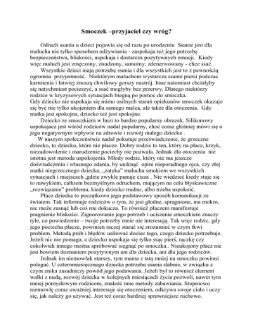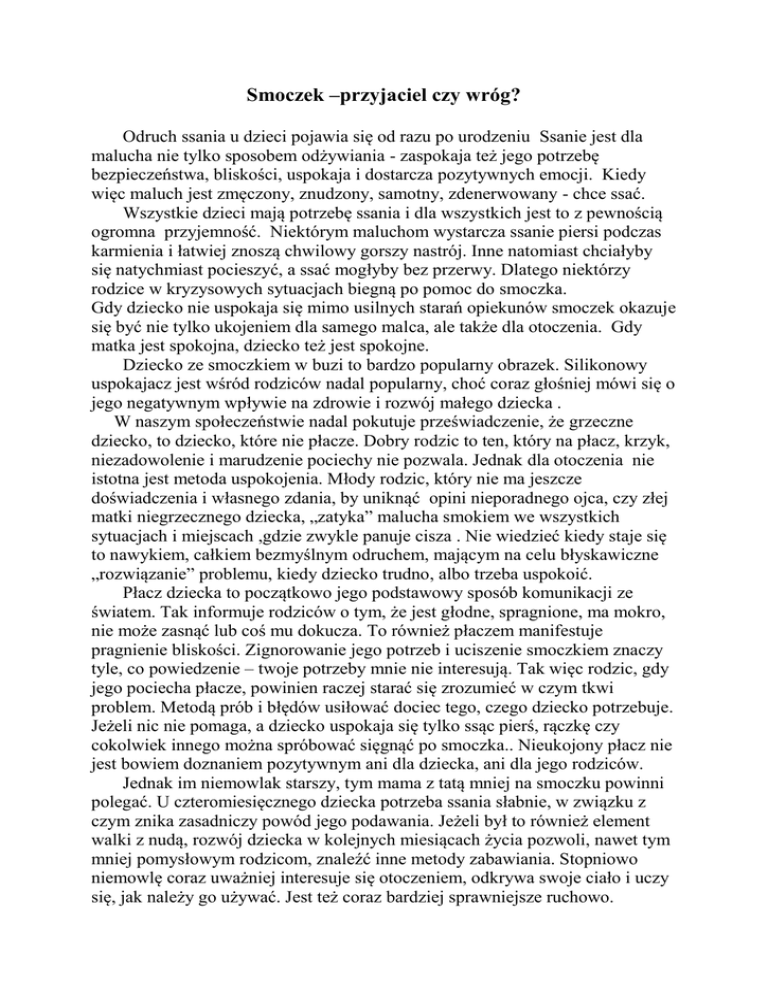 Smoczek –przyjaciel czy wróg? Odruch ssania u dzieci pojawia się od razu po urodzeniu Ssanie jest dla malucha nie tylko sposobem odżywiania - zaspokaja też jego potrzebę bezpieczeństwa, bliskości, uspokaja i dostarcza pozytywnych emocji. Kiedy więc maluch jest zmęczony, znudzony, samotny, zdenerwowany - chce ssać. Wszystkie dzieci mają potrzebę ssania i dla wszystkich jest to z pewnością ogromna przyjemność. Niektórym maluchom wystarcza ssanie piersi podczas karmienia i łatwiej znoszą chwilowy gorszy nastrój. Inne natomiast chciałyby się natychmiast pocieszyć, a ssać mogłyby bez przerwy. Dlatego niektórzy rodzice w kryzysowych sytuacjach biegną po pomoc do smoczka. Gdy dziecko nie uspokaja się mimo usilnych starań opiekunów smoczek okazuje się być nie tylko ukojeniem dla samego malca, ale także dla otoczenia. Gdy matka jest spokojna, dziecko też jest spokojne. Dziecko ze smoczkiem w buzi to bardzo popularny obrazek. Silikonowy uspokajacz jest wśród rodziców nadal popularny, choć coraz głośniej mówi się o jego negatywnym wpływie na zdrowie i rozwój małego dziecka . W naszym społeczeństwie nadal pokutuje przeświadczenie, że grzeczne dziecko, to dziecko, które nie płacze. Dobry rodzic to ten, który na płacz, krzyk, niezadowolenie i marudzenie pociechy nie pozwala. Jednak dla otoczenia nie istotna jest metoda uspokojenia. Młody rodzic, który nie ma jeszcze doświadczenia i własnego zdania, by uniknąć opini nieporadnego ojca, czy złej matki niegrzecznego dziecka, „zatyka” malucha smokiem we wszystkich sytuacjach i miejscach ,gdzie zwykle panuje cisza . Nie wiedzieć kiedy staje się to nawykiem, całkiem bezmyślnym odruchem, mającym na celu błyskawiczne „rozwiązanie” problemu, kiedy dziecko trudno, albo trzeba uspokoić. Płacz dziecka to początkowo jego podstawowy sposób komunikacji ze światem. Tak informuje rodziców o tym, że jest głodne, spragnione, ma mokro, nie może zasnąć lub coś mu dokucza. To również płaczem manifestuje pragnienie bliskości. Zignorowanie jego potrzeb i uciszenie smoczkiem znaczy tyle, co powiedzenie – twoje potrzeby mnie nie interesują. Tak więc rodzic, gdy jego pociecha płacze, powinien raczej starać się zrozumieć w czym tkwi problem. Metodą prób i błędów usiłować dociec tego, czego dziecko potrzebuje. Jeżeli nic nie pomaga, a dziecko uspokaja się tylko ssąc pierś, rączkę czy cokolwiek innego można spróbować sięgnąć po smoczka.. Nieukojony płacz nie jest bowiem doznaniem pozytywnym ani dla dziecka, ani dla jego rodziców. Jednak im niemowlak starszy, tym mama z tatą mniej na smoczku powinni polegać. U czteromiesięcznego dziecka potrzeba ssania słabnie, w związku z czym znika zasadniczy powód jego podawania. Jeżeli był to również element walki z nudą, rozwój dziecka w kolejnych miesiącach życia pozwoli, nawet tym mniej pomysłowym rodzicom, znaleźć inne metody zabawiania. Stopniowo niemowlę coraz uważniej interesuje się otoczeniem, odkrywa swoje ciało i uczy się, jak należy go używać. Jest też coraz bardziej sprawniejsze ruchowo. Potrzebę bliskości zaspokaja nie tylko poprzez kontakt z piersią mamy, ale i poprzez samą obecność rodzica, możliwość obserwowania go i słuchanie jego głosu. W tym momencie wciskanie dziecku smoka przy każdej oznace niezadowolenia jest jedynie nieuzasadnionym nawykiem lub przejawem lenistwa rodzica. Takie postępowanie jest niewskazane. Smoczek przestaje być nieszkodliwy, jeżeli podawany jest non stop, bezmyślnie i w porę nie zostaje „odstawiony”. Niewskazane jest podawanie smoczka noworodkom i niemowlętom karmionym w naturalny sposób, gdyż może to skutkować zanikiem umiejętności ssania piersi. Zjawisko to ma związek z faktem, iż mechanizm ssania piersi zupełnie odbiega od mechanizmu ssania smoczka. Z drugiej strony po przejściu od kamienia piersią do karmienia sztucznego, dziecko bardzo chętnie przyjmuje smoczek, który skutecznie zaspokaja jego potrzebę ssania. Okres karmienia butelką nie jest długi, co niekoniecznie zaspokaja malca, który po prostu chciałby jeszcze przez chwilę coś possać. Kobiety karmiące piersią mogą często zauważyć, że dziecko już nie je mleka, ale ssie pierś – to je uspokaja. Istnieje prawdopodobieństwo, że gdy maluch nie znajdzie piersi ani smoczka, zacznie ssać kciuk. Kontrowersji na temat czy i jak długo podawać dziecku smoczek jest na tyle dużo, że wielu rodziców ma spore obawy przed wprowadzeniem w życie swojego maleństwa gumowego przyjaciela. Eksperci są zgodni – smoczki są odpowiednie do uspokajania dzieci. . Jednak smoczek to nie zatyczka – złoty środek na wszelkie problemy. Smoczek bardzo często podawany jest dziecku przed snem, bo pozwala mu się wyciszyć. Pamiętajmy jednak, by nie pozwalać dziecku ssać go przez cały czas spania. Gdy tylko dziecko uśnie, wyjmijmy go z buzi. Z obserwacji pediatrycznych wynika , że niemowlęta chowane na smoku podlegają o wiele mniejszemu ryzyku zespołu nagłej śmierci – smoczek zniechęca dzieci do przewracania się twarzą w dół i trzyma język z dala od dróg oddechowych. Z drugiej strony, ssanie smoczka wiązane jest z trzykrotnie większym ryzykiem zachorowań na infekcję ucha i pediatrzy coraz częściej zalecają matkom dzieci cierpiących na uporczywe zapalenie narządów słuchu, odstawienie smoczka. Zgodni są również ortodonci – z perspektywy rozwoju uzębienia, najlepiej jest ograniczać ssanie smoka od drugiego roku życia i całkowicie wyeliminować go do czwartego roku życia, aby zapobiec problemom ze zgryzem i przeżuwaniem. Swoje uwagi podnoszą też psychologowie dziecięcy zaznaczając negatywny wpływ nadużywania smoczka w charakterze „zatyczki” na płaczące dziecko na rozwój więzi emocjonalnej dziecka z matką. Pediatrzy zgodnie twierdzą, że smoczek jest potencjalnym źródłem zakażeń i infekcji. Niestety nie wszyscy 