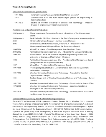 Wojciech Andrzej Myślecki Education and professional qualifications: 1991-1993 American Studies “Management in Free Market Economy” 1978 awarded title of dr inż. nauk technicznych (doctor of engineering in technical studies) 1965-1970 studies at Wrocław University of Science and Technology – Master’s Degree in Engineering (Telecommunications) Positions held and professional highlights: 2002-present Global Investment Corporation Sp. z o.o. – President of the Management Board; 2009-present Bank Zachodni WBK S.A. – Advisor in the field of energy and business projects; 2009 Ministry of the State Treasury – Advisor to the Minister; 2006 Wałbrzyskie Zakłady Koksownicze „Victoria” S.A. – President of the Management Board (delegated from the Supervisory Board); 2004-2006 Winuel S.A. – Head of the Management Board Advisors Team; 2000-2002 Polskie Sieci Elektroenergetyczne S.A. – Advisor to the Management Board; 1999-2003 Polish-French Centre for Industrial Sysytems Engineering at Wrocław University of Science and Technology – Director; 1998 Polskie Sieci Elektroenergetyczne S.A. – President of the Management Board (delegated from the Supervisory Board); 1997 Winuel S.A. - President of the Management Board; 1991-1999 French post-graduate Studies „Ecole Francaise de Genie des Systemem Industrieles” – Manager; 1991-1993 Wrocław University of Science and Technology – Proxy to the Dean for Organisational Changes; 1991 Studies-Design Unit of Wrocław University of Science and Technology – Survey Director; 1981-1982 Wrocław University of Science and Technology – Director of the Dean’s Office; 1978-2008 Wrocław University of Science and Technology – appointed academic employee in the Electronics Department; 1971-1978 Wrocław University of Science and Technology – assistant/senior assistant in the Electronics Department. Member of the Supervisory Boards of the following companies: Generali PTE w Warszawie (2014 – present); Procom System S.A. in Wrocław (2011- present); Tauron Polska Energia SA (December 2015–November 2016); Energa Wytwarzanie S.A. in Gdańsk (Secretary to the Supervisory Board - 2013-2015); Brzeskie Przedsiębiorstwo Energetyki Cieplnej Sp. z o.o. (Chairman of the Supervisory Board – 2011-2015); Polskie Sieci Elektroenergetyczne – Operator SA (2009-2010); Park Przemysłowy w Piekarach Śląskich (Industrial Park in Piekary Śląskie) Sp. z o.o. (2007-2012); WZK „Victoria” SA (Chairman of the Supervisory Board – 20062008); Zakład Usług Wielobranżowych Sp. z o.o. in Lubin (2000-2002); Wrocławski Park Technologiczny S.A. (1999-2003); Polskie Sieci Elektroenergetyczne S.A. (1998-2000); Telefonia Lokalna DIALOG S.A. (1997-2000); WINUEL S.A. (Chairman - 1996-1999); Centrum OPHTA LAB Sp. z o.o. (Secretary to the Supervisory Board – 1994-1998). 1 In addition he served in the following advisory functions: a Member of the Program Council of the Syndicate SmartPowerGrid Polska (2010–present); an Advisor to the Management Board of KGHM Polska Miedź S.A. for energy policy (2012); a Member of the Budget and Finance Committee of the Town Council of Wrocław (1999-2001); a Member of the Scientific Council of Wrocław Center for Technology Transfer (1997-2003); a Member of the Council of the Development Foundation of Wrocław University of Science and Technology (1996-2003); an Advisor to the director of the enterprise DOLPASZ in Wrocław (1992-1993); a Head of the Advisory Team of the Voivode of Wrocław (1992); an Associate in the international consulting firm AT Kearney (1991-1997); an Advisor to the Management Board of KGHM Polska Miedź S.A. (19911993); an Advisor for economic policy of the Prime Minister of the Polish Government (19911992); a Member of the Advisory Team of the Minister of Communications (1976-1990). Marek Pietrzak Education and professional qualifications: 2015-2016 Apsley Business School of London and Warsaw Management University – executive master of business administration; 2009-2013 legal counsel training Warsaw Bar Association – legal counsel; 2001-2006 studies at the Higher School of Commerce and Law in Warsaw in the Faculty of Law – Master’s Degree in Law; 2000-2004 studies at the Private Higher School of Business and Administration in Warsaw in the Faculty of Economics – Master’s Degree in Economics. Positions held and professional highlights: 2014 – present Owner of a Law Office - Marek Pietrzak; 2016 – present Polskie Radio Regionalna Rozgłośnia w Warszawie Radio dla Ciebie S.A. – Chairman of the Supervisory Board; 2015 – 2016 Bialskie Wodociągi i Kanalizacja „Wod-Kan” Sp. z o.o. – Member of the Supervisory Board; 2011 – 2014 Wodociąg Marecki Sp. z o.o. – Legal advisor to the project team; 2010 Office of the President of the Republic of Poland – Specialist in the Legal and Legislative Office; 2007 – 2008 Mazowiecki Urząd Wojewódzki – Legal officer in the Law Department. In his professional practice he concentrates on providing legal services to corporate entities. His chief specialisations are civil and economic law, in particular corporate and labour law. He also specialises in pursuing compensation and reparations in the case of medical malpractice as well as vehicular and workplace accidents. 2 Agnieszka Winnik-Kalemba Education and professional qualifications: 1999-2003 Legal apprenticeship at the District Lawyers Council in Wrocław; Legal Bar exam in 2003 1995-1997 Scholarship from the American Government at Georgetown University in Washington D.C. and The James W. Martin School of Policy and Administration at the University of Kentucky, major: Business Law and Public Administration 1990-1995 Studies at the University of Wrocław, Faculty of Law and Administration – Master’s Degree in Law Positions held and professional highlights: 2003 - present Owner of a Law Office - Agnieszka Winnik-Kalemba; 2016 (March- PKO BP S.A. – Deputy Chairwoman o