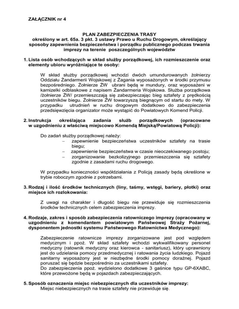 ZAŁĄCZNIK nr 4 PLAN ZABEZPIECZENIA TRASY określony w art. 65a. 3 pkt. 3 ustawy Prawo u Ruchu Drogowym, określający sposoby zapewnienia bezpieczeństwa i porządku publicznego podczas trwania imprezy na terenie poszczególnych województw 1. Lista osób wchodzących w skład służby porządkowej, ich rozmieszczenie oraz elementy ubioru wyróżniające te osoby: W skład służby porządkowej wchodzi dwóch umundurowanych żołnierzy Oddziału Żandarmerii Wojskowej z Żagania wyposażonych w środki przymusu bezpośredniego. Żołnierze ŻW ubrani będą w mundury, oraz wyposażeni w kamizelki odblaskowe z napisem Żandarmeria Wojskowa. Służba porządkowa /żołnierze ŻW/ przemieszczają się zabezpieczając bieg sztafety z prędkością uczestników biegu. Żołnierze ŻW towarzyszą biegnącym od startu do mety. W przypadku utrudnień w ruchu drogowym dodatkowo do zabezpieczenia przedsięwzięcia organizator może wystąpić do Powiatowych Komend Policji. 2. Instrukcja określająca zadania służb porządkowych (opracowane w uzgodnieniu z właściwą miejscowo Komendą Miejską/Powiatową Policji): Do zadań służby porządkowej należy: zapewnienie bezpieczeństwa uczestników sztafety na trasie biegu; zapewnienie bezpieczeństwa w czasie nieoczekiwanego postoju; zorganizowanie bezkolizyjnego przemieszczenia się sztafety zgodnie z zasadami ruchu drogowego. W przypadku konieczności współdziałania z Policją zasady będą określone w trybie roboczym zgodnie z potrzebami. 3. Rodzaj i ilość środków technicznych (liny, taśmy, wstęgi, bariery, płotki) oraz miejsce ich rozlokowania: Z uwagi na charakter i długość biegu nie przewiduje się rozmieszczenia środków technicznych celem zabezpieczenia imprezy. 4. Rodzaje, zakres i sposób zabezpieczenia ratowniczego imprezy (opracowany w uzgodnieniu z komendantem powiatowym Państwowej Straży Pożarnej, dysponentem jednostki systemu Państwowego Ratownictwa Medycznego): Zabezpieczenie ratownicze imprezy zorganizowane jest pod względem medycznym i ppoż. W skład sztafety wchodzi wykwalifikowany personel medyczny (ratownik medyczny oraz kierowca - sanitariusz), który uprawniony jest do udzielania pomocy przedmedycznej i ratowania życia ludzkiego. Pojazd sanitarny wyposażony jest w niezbędne środki pomocy doraźnej. Pojazd poruszać się będzie bezpośrednio za uczestnikami sztafety. Do zabezpieczenia ppoż. wydzielono dodatkowe 3 gaśnice typu GP-6XABC, które przewożone będą w pojazdach zabezpieczających. 5. Sposób oznaczenia miejsc niebezpiecznych dla uczestników imprezy: Miejsc niebezpiecznych na trasie sztafety nie przewiduje się. 6. Oznakowanie pojazdów uczestniczących w imprezie i towarzyszących: Do zabezpieczenia uczestników sztafety wydzielono oznakowany pojazd Żandarmerii Wojskowej. 7. Rodzaje zezwoleń umożliwiających poruszanie sie osób lub pojazdów w miejscach wyłączonych z ruchu publicznego: Nie przewiduje się poruszania osób oraz pojazdów w miejscach wyłączonych z ruchu publicznego. 8. Organizacja łączności bezprzewodowej a Policją podczas imprezy: miedzy organizatorem imprezy Pojazdy wojskowe wyposażone są środki łączności, które współdziałać będą na określonej częstotliwości. Dodatkowo dowódca patrolu ŻW, ratownik medyczny i kapitan sztafety wyposażeni będą w służbowe telefony łączności bezprzewodowej. Telefony bezprzewodowe służyć będą do łączności z Policją podczas imprezy. 9. Sposób informowania o ograniczeniach w ruchu drogowym wynikający z przebiegu imprezy - przed imprezą, w trakcie i po imprezie): Z uwagi na przebieg sztafety po drogach mało uczęszczanych, na trasie sztafety w miejscowościach gdzie odbywa się start i meta wywieszone będą plakaty informujące o czasie biegu sztafety. Ponadto, organizator zwróci się do mediów z prośbą o podanie informacji o możliwych utrudnieniach w ruchu drogowym w dniu biegu. CZERWIEŃSK, dnia 21.08.2013r.