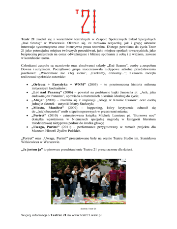 Teatr 21 zrodził się z warsztatów teatralnych w Zespole Społecznych Szkół Specjalnych „Dać Szansę” w Warszawie. Okazało się, że zarówno reżyserkę, jak i grupę aktorów interesuje systematyczna oraz intensywna praca teatralna. Dlatego powołano do życia Teatr 21 jako potencjalne miejsce twórczych poszukiwań, jako miejsce spotkań towarzyskich, jako bezpieczną przestrzeń na coraz odważniejsze i bliższe spotkania z sobą i z widzem, zawsze w kontekście teatru. Członkami zespołu są uczniowie oraz absolwenci szkoły „Dać Szansę”, osoby z zespołem Downa i autyzmem. Początkowo grupa inscenizowała nietypowe szkolne przedstawienia jasełkowe: „Wiadomość nie z tej ziemi”, „Czekamy, czekamy...”; z czasem zaczęła realizować spektakle autorskie: „Orfeusz + Eurydyka = WNM” (2005) – to przetworzona historia miłosna mitycznych kochanków; „Lot nad Panamą” (2006) – powstał na podstawie bajki Janoscha pt. „Ach, jaka cudowna jest Panama”, opowiada o marzeniach o krainie idealnej do życia; „Alicja” (2008) – zrodziła się z inspiracji „Alicją w Krainie Czarów” oraz osobą jednej z aktorek – autystki Marty Stańczyk; „Miasto, Manifest” (2009) – happening, który krytycznie odnosił się do „(nie)obecności” osób niepełnosprawnych w przestrzeni miasta; „Portret” (2010) - zainspirowana książką Michele Lemieux pt. "Burzowa noc" (książka wyróżniona w Niemczech specjalną nagrodą w kategorii literatura młodzieżowa) nietypowa podróż do środka głowy; „Uwaga, Purim!” (2011) – performance przygotowany w ramach projektu dla Muzeum Historii Żydów Polskich. „Portret” oraz „Uwaga, Purim!” prezentowane były na scenie Teatru Studio im. Stanisława Witkiewicza w Warszawie. „Ja jestem ja” to pierwsze przedstawienie Teatru 21 przeznaczone dla dzieci. aktorzy Teatr 21 Więcej informacji o Teatrze 21 na www.teatr21.waw.pl