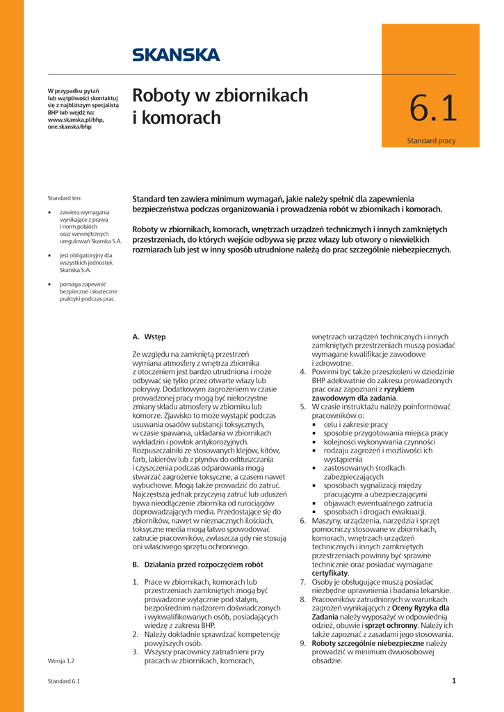 W przypadku pytań lub wątpliwości skontaktuj się z najbliższym specjalistą BHP lub wejdź na: www.skanska.pl/bhp, one.skanska/bhp Roboty w zbiornikach i komorach 6.1 Standard pracy Standard ten: • zawiera wymagania wynikające z prawa i norm polskich oraz wewnętrznych uregulowań Skanska S.A. • jest obligatoryjny dla wszystkich jednostek Skanska S.A. • pomaga zapewnić bezpieczne i skuteczne praktyki podczas prac. Standard ten zawiera minimum wymagań, jakie należy spełnić dla zapewnienia bezpieczeństwa podczas organizowania i prowadzenia robót w zbiornikach i komorach. Roboty w zbiornikach, komorach, wnętrzach urządzeń technicznych i innych zamkniętych przestrzeniach, do których wejście odbywa się przez włazy lub otwory o niewielkich rozmiarach lub jest w inny sposób utrudnione należą do prac szczególnie niebezpiecznych. A. Wstęp Ze względu na zamkniętą przestrzeń wymiana atmosfery z wnętrza zbiornika z otoczeniem jest bardzo utrudniona i może odbywać się tylko przez otwarte włazy lub pokrywy. Dodatkowym zagrożeniem w czasie prowadzonej pracy mogą być niekorzystne zmiany składu atmosfery w zbiorniku lub komorze. Zjawisko to może wystąpić podczas usuwania osadów substancji toksycznych, w czasie spawania, układania w zbiornikach wykładzin i powłok antykorozyjnych. Rozpuszczalniki ze stosowanych klejów, kitów, farb, lakierów lub z płynów do odtłuszczania i czyszczenia podczas odparowania mogą stwarzać zagrożenie toksyczne, a czasem nawet wybuchowe. Mogą także prowadzić do zatruć. Najczęstszą jednak przyczyną zatruć lub uduszeń bywa nieodłączenie zbiornika od rurociągów doprowadzających media. Przedostające się do zbiorników, nawet w nieznacznych ilościach, toksyczne media mogą łatwo spowodować zatrucie pracowników, zwłaszcza gdy nie stosują oni właściwego sprzętu ochronnego. 4. 5. 6. B. Działania przed rozpoczęciem robót Wersja 1.2 Standard 6.1 1. Prace w zbiornikach, komorach lub przestrzeniach zamkniętych mogą być prowadzone wyłącznie pod stałym, bezpośrednim nadzorem doświadczonych i wykwalifikowanych osób, posiadających wiedzę z zakresu BHP. 2. Należy dokładnie sprawdzać kompetencję powyższych osób. 3. Wszyscy pracownicy zatrudnieni przy pracach w zbiornikach, komorach, 7. 8. 9. wnętrzach urządzeń technicznych i innych zamkniętych przestrzeniach muszą posiadać wymagane kwalifikacje zawodowe i zdrowotne. Powinni być także przeszkoleni w dziedzinie BHP adekwatnie do zakresu prowadzonych prac oraz zapoznani z ryzykiem zawodowym dla zadania. W czasie instruktażu należy poinformować pracowników o: • celu i zakresie pracy • sposobie przygotowania miejsca pracy • kolejności wykonywania czynności • rodzaju zagrożeń i możliwości ich wystąpienia • zastosowanych środkach zabezpieczających • sposobach sygnalizacji między pracującymi a ubezpieczającymi • objawach ewentualnego zatrucia • sposobach i drogach ewakuacji. Maszyny, urządzenia, narzędzia i sprzęt pomocniczy stosowane w zbiornikach, komorach, wnętrzach urządzeń technicznych i innych zamkniętych przestrzeniach powinny być sprawne technicznie oraz posiadać wymagane certyfikaty. Osoby je obsługujące muszą posiadać niezbędne uprawnienia i badania lekarskie. Pracowników zatrudnionych w warunkach zagrożeń wynikających z Oceny Ryzyka dla Zadania należy wyposażyć w odpowiednią odzież, obuwie i sprzęt ochronny. Należy ich także zapoznać z zasadami jego stosowania. Roboty szczególnie niebezpieczne należy prowadzić w minimum dwuosobowej obsadzie. 1 10. Należy przewidzieć i zadbać o środki techniczno-organizacyjne zapewniające bezpieczeństwo na stanowiskach pracy oraz skuteczną asekurację i ewakuację w przypadku wystąpienia takiej potrzeby. 11. Podstawowym dokumentem w zakresie BHP, niezbędnym do rozpoczęcie i prowadzenia robot w zbiornikach, komorach, wnętrzach urządzeń technicznych i innych zamkniętych przestrzeniach jest Instrukcja Bezpiecznego Wykonywania Robót (IBWR) dla konkretnego zadania. 12. IBWR należy opracować korzystając z Planu Bezpieczeństwa, Ochrony Zdrowia i Środowiska (BOZiŚ), Oceny Ryzyka dla Zadania oraz projektu wykonawczego dla konkretnego rodzaju robót. 13. Do przeprowadzenia Oceny Ryzyka dla Zadania konieczne jest ustalenie wszystkich zagrożeń mogących wystąpić w procesie prowadzenia robót w zbiornikach, komorach, wnętrzach urządzeń technicznych i innych zamkniętych przestrzeniach. C. Działania podczas prowadzenia robót 1. Podjęcie i prowadzenie prac w zbiornikach, komorach lub przestrzeniach zamkniętych może nastąpić jedynie na podstawie pisemnego pozwolenia, wydanego przez pracodawcę w trybie standardu szczegółowego „4.2 Polecenia na prace, kwalifikacje, uprawnienia”. 2. Osoba wydająca polecenie wykonania takiej pracy powinna sprawdzić, czy przygotowania organizacyjne i techniczne zapewniają bezpieczeństwo pracownikom wykonującym dane prace. 3. Należy wyznaczyć imiennie osobę sprawującą nadzór nad pracą. 4. Pracownikom znajdującym się w zbiorniku należy zapewnić natychmiastową pierwszą pomoc w razie nagłej potrzeby lub wypadku. 5. Zbiornik należy opróżnić i wstępnie oczyścić przez przemycie, przedmuchanie parą lub gazem obojętnym oraz powietrzem: • zbiornik po gazach palnych należy przedmuchać gazem obojętnym, najlepiej azotem • zbiornik po produktach kwaśnych lub zasadowych trzeba najpierw zneutralizować, a później płukać wodą • zbiorniki po produktach palnych pochodzących z przeróbki ropy naftowej trzeba przedmuchiwać parą i płukać wodą, aż do przelania zbiornika. 6. Każdy zbiornik musi być w końcowej fazie czyszczenia przewietrzany powietrzem tak długo, aż analiza potwierdzi wystarczającą zawartość tlenu oraz brak zagrożenia toksycznego i wybuchowego. 7. W zbiornikach wolno używać narzędzi i lamp zasilanych prądem o napięciu 24 V oraz w