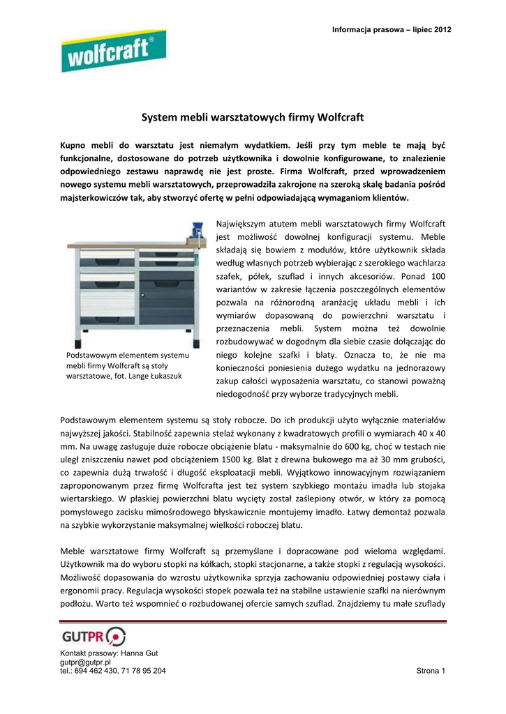 Informacja prasowa – lipiec 2012 System mebli warsztatowych firmy Wolfcraft Kupno mebli do warsztatu jest niemałym wydatkiem. Jeśli przy tym meble te mają być funkcjonalne, dostosowane do potrzeb użytkownika i dowolnie konfigurowane, to znalezienie odpowiedniego zestawu naprawdę nie jest proste. Firma Wolfcraft, przed wprowadzeniem nowego systemu mebli warsztatowych, przeprowadziła zakrojone na szeroką skalę badania pośród majsterkowiczów tak, aby stworzyć ofertę w pełni odpowiadającą wymaganiom klientów. Podstawowym elementem systemu mebli firmy Wolfcraft są stoły warsztatowe, fot. Lange Łukaszuk Największym atutem mebli warsztatowych firmy Wolfcraft jest możliwość dowolnej konfiguracji systemu. Meble składają się bowiem z modułów, które użytkownik składa według własnych potrzeb wybierając z szerokiego wachlarza szafek, półek, szuflad i innych akcesoriów. Ponad 100 wariantów w zakresie łączenia poszczególnych elementów pozwala na różnorodną aranżację układu mebli i ich wymiarów dopasowaną do powierzchni warsztatu i przeznaczenia mebli. System można też dowolnie rozbudowywać w dogodnym dla siebie czasie dołączając do niego kolejne szafki i blaty. Oznacza to, że nie ma konieczności poniesienia dużego wydatku na jednorazowy zakup całości wyposażenia warsztatu, co stanowi poważną niedogodność przy wyborze tradycyjnych mebli. Podstawowym elementem systemu są stoły robocze. Do ich produkcji użyto wyłącznie materiałów najwyższej jakości. Stabilność zapewnia stelaż wykonany z kwadratowych profili o wymiarach 40 x 40 mm. Na uwagę zasługuje duże robocze obciążenie blatu - maksymalnie do 600 kg, choć w testach nie uległ zniszczeniu nawet pod obciążeniem 1500 kg. Blat z drewna bukowego ma aż 30 mm grubości, co zapewnia dużą trwałość i długość eksploatacji mebli. Wyjątkowo innowacyjnym rozwiązaniem zaproponowanym przez firmę Wolfcrafta jest też system szybkiego montażu imadła lub stojaka wiertarskiego. W płaskiej powierzchni blatu wycięty został zaślepiony otwór, w który za pomocą pomysłowego zacisku mimośrodowego błyskawicznie montujemy imadło. Łatwy demontaż pozwala na szybkie wykorzystanie maksymalnej wielkości roboczej blatu. Meble warsztatowe firmy Wolfcraft są przemyślane i dopracowane pod wieloma względami. Użytkownik ma do wyboru stopki na kółkach, stopki stacjonarne, a także stopki z regulacją wysokości. Możliwość dopasowania do wzrostu użytkownika sprzyja zachowaniu odpowiedniej postawy ciała i ergonomii pracy. Regulacja wysokości stopek pozwala też na stabilne ustawienie szafki na nierównym podłożu. Warto też wspomnieć o rozbudowanej ofercie samych szuflad. Znajdziemy tu małe szuflady Kontakt prasowy: Hanna Gut [email protected] tel.: 694 462 430, 71 78 95 204 Strona 1 Informacja prasowa – lipiec 2012 na narzędzia ręczne, uniwersalne średnie szuflady oraz duże szuflady ułatwiające przechowywanie elektronarzędzi np. pilarek. Klient może też dokupić przegródki dopasowując szuflady do posiadanych narzędzi. Szuflady wykonane są z odpornego na uderzenia tworzywa sztucznego. Ich zaletą jest system szybkiego wyjmowania. Po demontażu szuflad można układać je jedna na drugiej tworząc rodzaj przenośnej szafki. Profesjonalne prowadnice szuflad sprawią, iż nawet przy maksymalnym obciążeniu do 25 kg nie ma problemu z ich lekkim wysuwaniem i wsuwaniem. Fronty wykonane zostały z wysokiej jakości aluminium, które stanowi trwałe i estetyczne uzupełnienie całości. Meble warsztatowe Wolfcraft opierają się na 3 podstawowych modułach różniących się szerokością: 65 cm, 113 cm, 161 cm. W każdym module istnieje wiele opcji konfiguracji szuflad, półek i szafek. Dla wygody klienta każdy Duże szuflady ułatwiają przechowywanie wariant posiada dokładnie opisaną listę zakupową, według elektronarzędzi, fot. Lange Łukaszuk której może on zamówić wybrany asortyment. Inżynierowie marki Wolfcraft przewidzieli też możliwość zamocowania mebli warsztatowych do ścian za pomocą zestawu klamer. Wysoką jakość wykonania mebli potwierdza aż 5 lat gwarancji. Warto podkreślić, że system mebli warsztatowych firmy Wolfcraft gwarantuje wysoki komfort użytkowania na długie lata i idealne dopasowanie do potrzeb użytkownika oraz rozbudowę w dowolnym momencie. Beata Haligowska, menedżer z firmy Lange Łukaszuk s.j. Producent: Wolfcraft Dystrybutor: Lange Łukaszuk www.langelukaszuk.pl Kontakt prasowy: Hanna Gut [email protected] tel.: 694 462 430, 71 78 95 204 Strona 2