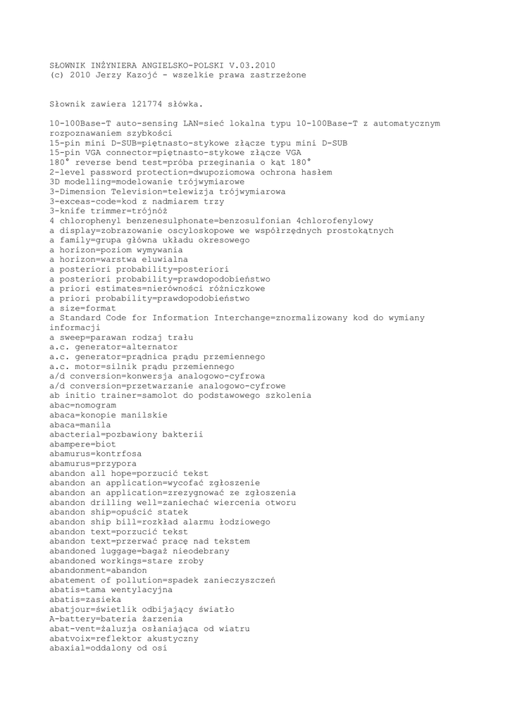 SŁOWNIK INŻYNIERA ANGIELSKO-POLSKI V.03.2010 (c) 2010 Jerzy Kazojć - wszelkie prawa zastrzeżone Słownik zawiera 121774 słówka. 10-100Base-T auto-sensing LAN=sieć lokalna typu 10-100Base-T z automatycznym rozpoznawaniem szybkości 15-pin mini D-SUB=piętnasto-stykowe złącze typu mini D-SUB 15-pin VGA connector=piętnasto-stykowe złącze VGA 180° reverse bend test=próba przeginania o kąt 180° 2-level password protection=dwupoziomowa ochrona hasłem 3D modelling=modelowanie trójwymiarowe 3-Dimension Television=telewizja trójwymiarowa 3-exceas-code=kod z nadmiarem trzy 3-knife trimmer=trójnóż 4 chlorophenyl benzenesulphonate=benzosulfonian 4chlorofenylowy a display=zobrazowanie oscyloskopowe we współrzędnych prostokątnych a family=grupa główna układu okresowego a horizon=poziom wymywania a horizon=warstwa eluwialna a posteriori probability=posteriori a posteriori probability=prawdopodobieństwo a priori estimates=nierówności różniczkowe a priori probability=prawdopodobieństwo a size=format a Standard Code for Information Interchange=znormalizowany kod do wymiany informacji a sweep=parawan rodzaj trału a.c. generator=alternator a.c. generator=prądnica prądu przemiennego a.c. motor=silnik prądu przemiennego a/d conversion=konwersja analogowo-cyfrowa a/d conversion=przetwarzanie analogowo-cyfrowe ab initio trainer=samolot do podstawowego szkolenia abac=nomogram abaca=konopie manilskie abaca=manila abacterial=pozbawiony bakterii abampere=biot abamurus=kontrfosa abamurus=przypora abandon all hope=porzucić tekst abandon an application=wycofać zgłoszenie abandon an application=zrezygnować ze zgłoszenia abandon drilling well=zaniechać wiercenia otworu abandon ship=opuścić statek abandon ship bill=rozkład alarmu łodziowego abandon text=porzucić tekst abandon text=przerwać pracę nad tekstem abandoned luggage=bagaż nieodebrany abandoned workings=stare zroby abandonment=abandon abatement of pollution=spadek zanieczyszczeń abatis=tama wentylacyjna abatis=zasieka abatjour=świetlik odbijający światło A-battery=bateria żarzenia abat-vent=żaluzja osłaniająca od wiatru abatvoix=reflektor akustyczny abaxial=oddalony od osi abaxial=pozaosiowy abb=skrajna część runa owcy Abbe number=liczba Abbego Abbe number=współczynnik dyspersji Abbe refractometer=refraktometr Abbego Abbe vertical metroscope=długościomierz pionowy Abbego Abbe's sine condition=warunek Abbego abbrev=skrót abbreviated address calling=odwołanie do skróconego adresu abbreviated addressing=adresowanie skrócone abbreviation file=plik skrótów abbreviation file=zbiór skrótów abeam=na trawersie Abegg's rule of eight=reguła gazu szlachetnego Abegg's rule of eight=reguła oktetu Abel flash-point apparatus=aparat Abel-Penskyego do oznaczania temperatury zapłonu abele=białodrzew abelian category=kategoria abelowa abelian extension=rozszerzenie abelowe abelian group=grupa abelowa abelian group=grupa przemienna abelian variety=rozmaitość abelowa Abel's integral equation=równanie całkowe Abela abend abnormal end=niewłaściwe przerwanie abend abnormal end=niewłaściwe zakończenie aberrated=aberracyjny aberrated=obarczony aberracjami aberration-free=bezaberracyjny aberration-free=wolny od aberracji abhesive=substancja zapobiegająca przywieraniu abichite=abichit abietate=abietynian abietic acid=kwas abietynowy abiogenesis=abiogeneza abiotic=abiotyczny abiotic=nieożywiony abiotic=pozbawiony życia ablation=ablacja ablation=chłodzenie ablacyjne ablation material=materiał na osłony ablacyjne ablation moraine=morena ablacyjna ablative=ablacyjny ablative heat-shield=osłona cieplna ablacyjna ablator=materiał na osłony ablacyjne able pattern=wzorzec zmienny able to sea=zdatny na morze o statku able-bodied=sprawny fizycznie able-bodied=zdolny do służby abluvium=abluwium abnormal behavior signature=świadectwo dziwnego zachowania abnormal behavior signature=sygnatura nienormalnego zachowania abnormal behavior signature=symptom nienormalnego zachowania abnormal end=zakończenie awaryjne abnormal end=zakończenie przedwczesne abnormal end of task=niewłaściwe zakończenie zadania abnormal glow discharge=wyładowanie jarzeniowe nienormalne abnormal termination=niewłaściwe przerwanie abnormal termination=niewłaściwe zakończenie abnormal termination=zakończenie anormalne abnormality=anormalność abnormality=odchylenie od normy aboard=na pokładzie aboard=na statku A-bomb=bomba atomowa abonent=abonent aborigines=autochtoni aborigines=flora i fauna miejscowa aborigines=tubylcy abort=przerwanie wykonywania zadania abort from orbit=zejść z wyznaczonej orbity abort timer=regulator czasowy przerwania aborted casting=odlew wadliwy aborted casting=odlew wybrakowany abortive=zniekształcony abortive attempt=nieudana próba abortive failure=uszkodzenie powodujące przerwę w działaniu danego systemu abounds=mnożyć dziesiętnie about-sledge=miot kowalski dwuręczny above board=zgodny programowo above crossing=skrzyżowanie wielopoziomowe above mentioned=wyżej wymieniony w dokumencie above named=wyżej wymieniony above or below 1 mW=decybel ponad above reference noise=decybel ponad poziom odniesienia szumów above sea level=nad poziomem morza above-ground=nadziemny above-mentioned=wyżej wymieniony above-resonance balancing machine=wyważarka nadkrytyczna above-water body=część nadwodna kadłuba above-water body=nadwodzie above-water lateral plane=powierzchnia nawiewu abradant=materiał ścierny abradant=ścierniwo abrasion hardness=odporność na ścieranie abrasion mark=rysa abrasion mark=starte miejsce na powierzchni przedmiotu abrasion platform=platforma abrazyjna abrasion resistance=odporność na ścieranie abrasion tester=ścieralnościomierz abrasive action=działanie ścierne abrasive action=ścieranie abrasive base paper=podłoże na papier ścierny abrasive belt grinding=szlifowanie taśmą ścierną na szlifierce taśmowej abrasive belt machine=szlifierka taśmowa ab