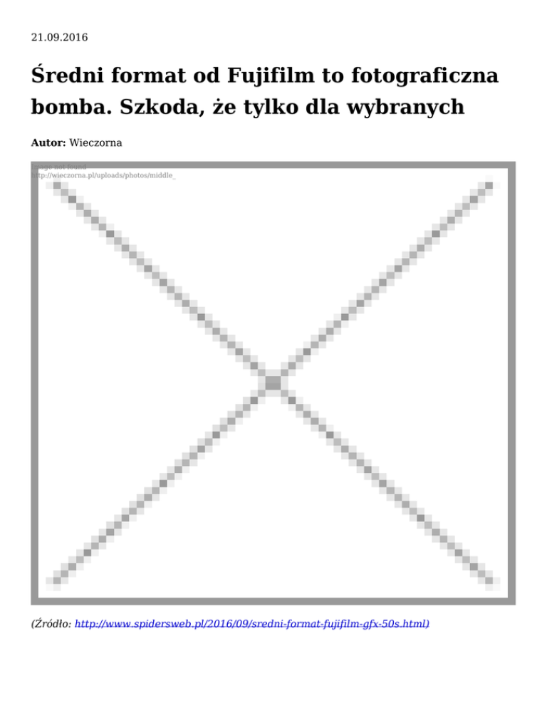 21.09.2016 Średni format od Fujifilm to fotograficzna bomba. Szkoda, że tylko dla wybranych Autor: Wieczorna Image not found http://wieczorna.pl/uploads/photos/middle_ (Źródło: http://www.spidersweb.pl/2016/09/sredni-format-fujifilm-gfx-50s.html) Fujifilm zaczęło targi Photokina z wysokiego C. Producent konsekwentnie ignoruje aparaty pełnoklatkowe, ale tym razem postanowił wskoczyć na półkę zdecydowanie wyższą. W cyfrowej fotografii wręcz najwyższą. Powstaje średnioformatowy bezlusterkowiec w cenie ok. 10 tys. dol. Średni format od Fujifilm to fotograficzna bomba. Szkoda, że tylko dla wybranych