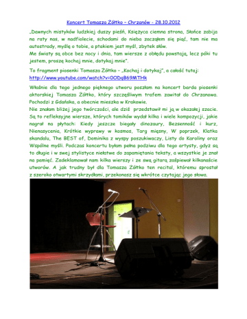 Koncert Tomasza Żółtko – Chrzanów - 28.10.2012 „Dawnych mistyków ludzkiej duszy pieśń, Księżyca ciemna strona, Słońce zabija na raty nas, w nadfiolecie, schodami do nieba zacząłem się piąć, tam nie ma autostrady, myślę o tobie, a ptakiem jest myśl, zbytek słów. Me światy są obce bez nocy i dnia, tam wiersze z obłędu powstają, lecz póki tu jestem, proszę kochaj mnie, dotykaj mnie”. To fragment piosenki Tomasza Żółtko – „Kochaj i dotykaj”, a całość tutaj: http://www.youtube.com/watch?v=0ODqB69MTHk Właśnie dla tego jednego pięknego utworu poszłam na koncert barda piosenki aktorskiej Tomasza Żółtko, który szczęśliwym trafem zawitał do Chrzanowa. Pochodzi z Gdańska, a obecnie mieszka w Krakowie. Nie znałam bliżej jego twórczości, ale dziś przedstawił mi ją w okazałej szacie. Są to refleksyjne wiersze, których tomików wydał kilka i wiele kompozycji, jakie nagrał na płytach: Kiedy jeszcze biegały dinozaury, Bezsenność i kurz, Nienasycenia, Krótkie wyprawy w kosmos, Targ mięsny, W poprzek, Klatka skandalu, The BEST of, Dominika z wyspy poszukiwaczy, Listy do Karoliny oraz Wspólne myśli. Podczas koncertu byłam pełna podziwu dla tego artysty, gdyż są to długie i w swej stylistyce niełatwe do zapamiętania teksty, a wszystkie je znał na pamięć. Zadeklamował nam kilka wierszy i ze swą gitarą zaśpiewał kilkanaście utworów. A jak trudny był dla Tomasza Żółtko ten recital, któremu sprostał z szeroko otwartymi skrzydłami, przekonasz się wkrótce czytając jego słowa. Jest publicystą, poetą, artystą i muzykiem niezwykle kreatywnym, który zdecydowanym głosem broni własnych poglądów. W swych artykułach i utworach porusza najważniejsze aspekty ludzkiego życia i dogłębnie analizuje cenne wartości chrześcijańskie. Recital rozpoczął jedną ze swych muzycznych modlitw. Tu znajdziesz ich więcej: http://www.pp.org.pl/wojtek/forum/poezja/tomek/modlitwy.htm#38 Wyśpiewał także piękno Raju: „Jest taki pejzaż, gdzie uśmiech można rwać rękami, biegnę tam po łące pięknej jak aksamit, jest taki pejzaż przez Boga dla mnie obiecany”. Porażający był jego wiersz, który wygłosił żarliwym tonem: Dziękuję, że nie byłem w t e d y przechodniem w małym Betlejemie, Bo choć schlebianie teologii wymuszało wiedzę, iż Mesjasz właśnie t u t a j, to jednak w życiu nie zajrzałbym do s t o d o ł y, raczej hotel – cztery gwiazdki, późna kolacja z dobrym winem. Dziękuję, że nie pomieszkiwałem w t e d y w zaściankowo-nędznym Nazarecie, Bo choć słuszne wychowanie pewnie by zmogło szydercze myśli o prowincji, To jednak ciesielstwem bez matury jawnie p o g a r d z a ł b y m Raczej Ci dobrze wykształceni, o bycie wysokie rozważania. Dziękuję, że się nie tłoczyłem w t e d y w podnieconym tłumie gapiów, Bo choć w świetle dnia czynione … z n a k i … c u d y… widziałbym jako ewidentne, to jednak sens ukryty w przypowieściach J e g o u m k n ą ł b y mi, raczej zbyt plebejski - ot takie urąganie filozofii. Dziękuję, że się nie gorszyłem w t e d y oburzającym brakiem patriotycznych haseł, bo choć tak wiele opowiadał o swoim Ojcu gdzieś tam w Niebie, cóż za bezczelność swoją drogą…! To jednak „Bóg, Honor i Ojczyzna” z siebie nie wykrztusił nigdy, Raczej dla kolaborantów mając zrozumienie? Zupełnie niepojęte! Dziękuję, że nie widziałem w t e d y jak Go dotykała p r o s t y t u t k a Bo choć może była to kobieta biedna - kto wie – głęboko nieszczęśliwa nawet, To jednak – jak świat światem zawsze zawód jej urągał przyzwoitym… świętym. Raczej więc wzruszyłbym ramionami, twarz i czystość zachowawszy, f a r y z e j s k i e. Dziękuję, że nie krzyczałem w t e d y „Hosanna”, gdy On wjeżdżał na osiołku Bo choć przez chwilę krótką - mimo zastrzeżeń – w stolicy zaczynał jawić mi się K r ó l e m, to jednak ledwie tydzień później w amoku darłbym się: Na krzyż z Nim!!! Raczej „Hosannę” przeklinając, dziwiąc się tamtej egzaltacji. Dziękuję, że nie patrzyłem w t e d y na tę publiczną egzekucję, Bo choć na widok krwi …wbijanych gwoździ… zasłabłbym pewnie nieprzywykły, To jednak wstrząs i niesmak duszą widza by targały krótko, Raczej po wieczornym, mocnym trunku zasnąłbym słodko - niemowlę ciche. Dziękuję, że nie spotkałem w t e d y kobiet bredzących coś o p u s t y m grobie, bo bym wyśmiał ! W tej i podobnej retoryce słuchaliśmy utworów artysty, dlatego uważam, że dla niego emocjonalnie i retorycznie jest trudny do przedstawienia recital. Również dla nas, gdy musimy pochylić się nad jego słowami, a co się z nimi wiąże, istotnymi dla człowieka sprawami, wobec których nie można przejść obojętnie. Przed każdym utworem wprowadzał w nas w coraz to inny temat, który chciał polecić ku rozwadze. Zadawał pytania i próbował szukać na nie naszych odpowiedzi, bo milczeliśmy jak grób. To było dla nas niełatwe zadanie tak z marszu wypowiedzieć opinię na temat, który poruszył. Ale on nie chciał nas pogrążyć, jedynie uzmysłowić, jak wiele spraw dzieje się blisko nas, a my w pośpiechu dnia nie mamy czasu zatrzymać się na chwilę refleksji. A potem wyśpiewał: „Dość, naprawdę dość, głupich słów, dętych mów, pustych głów, Już dość, jest mi tak wstyd, prostaków krzyk zniewala myśl, Już dość, tu jest mi źle, gdy rozum śpi, demony budzą się, Już dość, idźmy do szkół, kombajnem kraju zbawić nie da się, Boże, błagam, naucz nas pokory, naucz, błagam, szacunku do Ciebie, Tępych krzykaczy zegnij do ziemi, niech imię Twoje wśród nas się uświęci”. Usłyszeliśmy także „Małego chłopca”: „W śliskich kształtach mchów i mgieł ożywia się mój lęk…”. http://czarnakonewka.wrzuta.pl/audio/5oHbtW0X8tX/tomasz_zoltko__maly_chlopiec I tak wędrowaliśmy z pieśniami artysty po mea