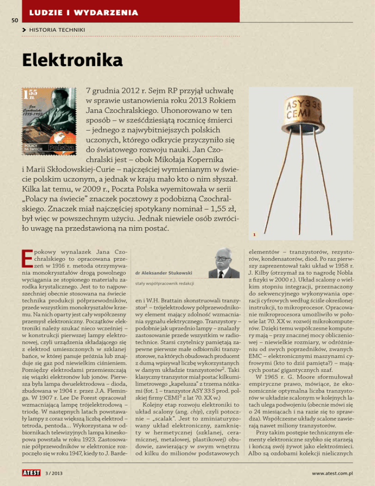 50 ludzie i wydarzenia > historia techniki Elektronika 7 grudnia 2012 r. Sejm RP przyjął uchwałę w sprawie ustanowienia roku 2013 Rokiem Jana Czochralskiego. Uhonorowano w ten sposób – w sześćdziesiątą rocznicę śmierci – jednego z najwybitniejszych polskich uczonych, którego odkrycie przyczyniło się do światowego rozwoju nauki. Jan Czo‑ chralski jest – obok Mikołaja Kopernika i Marii Skłodowskiej‑Curie – najczęściej wymienianym w świe‑ cie polskim uczonym, a jednak w kraju mało kto o nim słyszał. Kilka lat temu, w 2009 r., Poczta Polska wyemitowała w serii „Polacy na świecie” znaczek pocztowy z podobizną Czochral‑ skiego. Znaczek miał najczęściej spotykany nominał – 1,55 zł, był więc w powszechnym użyciu. Jednak niewiele osób zwróci‑ ło uwagę na przedstawioną na nim postać. E pokowy wynalazek Jana Czo‑ chralskiego to opracowana prze‑ zeń w 1916 r. metoda otrzymywa‑ nia monokryształów drogą powolnego wyciągania ze stopionego materiału za‑ rodka krystalicznego. Jest to to najpow‑ szechniej obecnie stosowana na świecie technika produkcji półprzewodników, przede wszystkim monokryształów krze‑ mu. Na nich oparty jest cały współczesny przemysł elektroniczny. Początków elek‑ troniki należy szukać nieco wcześniej – w konstrukcji pierwszej lampy elektro‑ nowej, czyli urządzenia składającego się z elektrod umieszczonych w szklanej bańce, w której panuje próżnia lub znaj‑ duje się gaz pod niewielkim ciśnieniem. Pomiędzy elektrodami przemieszczają się wiązki elektronów lub jonów. Pierw‑ sza była lampa dwuelektrodowa – dioda, zbudowana w 1904 r. przez J.A. Flemin‑ ga. W 1907 r. Lee De Forest opracował wzmacniającą lampę trójelektrodową – triodę. W następnych latach powstawa‑ ły lampy z coraz większą liczbą elektrod – tetroda, pentoda… Wykorzystana w od‑ biornikach telewizyjnych lampa kinesko‑ powa powstała w roku 1923. Zastosowa‑ nie półprzewodników w elektronice roz‑ poczęło się w roku 1947, kiedy to J. Barde‑ 3 / 2013 dr Aleksander Stukowski stały współpracownik redakcji en i W.H. Brattain skonstruowali tranzy‑ stor1 – trójelektrodowy półprzewodniko‑ wy element mający zdolność wzmacnia‑ nia sygnału elektrycznego. Tranzystory – podobnie jak uprzednio lampy – znalazły zastosowanie przede wszystkim w radio‑ technice. Starsi czytelnicy pamiętają za‑ pewne pierwsze małe odbiorniki tranzy‑ storowe, na których obudowach producent z dumą wpisywał liczbę wykorzystanych w danym układzie tranzystorów2. Taki klasyczny tranzystor miał postać kilkumi‑ limetrowego „kapelusza” z trzema nóżka‑ mi (fot. 1 – tranzystor ASY 33 S prod. pol‑ skiej firmy CEMI3 z lat 70. XX w.) Kolejny etap rozwoju elektroniki to układ scalony (ang. chip), czyli potocz‑ nie – „scalak”. Jest to zminiaturyzo‑ wany układ elektroniczny, zamknię‑ ty w hermetycznej (szklanej, cera‑ micznej, metalowej, plastikowej) obu‑ dowie, zawierający w swym wnętrzu od kilku do milionów podstawowych 1 elementów – tranzystorów, rezysto‑ rów, kondensatorów, diod. Po raz pierw‑ szy zaprezentował taki układ w 1958 r. J. Kilby (otrzymał za to nagrodę Nobla z fizyki w 2000 r.). Układ scalony o wiel‑ kim stopniu integracji, przeznaczony do sekwencyjnego wykonywania ope‑ racji cyfrowych według ściśle określonej instrukcji, to mikroprocesor. Opracowa‑ nie mikroprocesora umożliwiło w poło‑ wie lat 70. XX w. rozwój mikrokompute‑ rów. Dzięki temu współczesne kompute‑ ry mają – przy znacznej mocy obliczenio‑ wej – niewielkie rozmiary, w odróżnie‑ niu od swych poprzedników, zwanych EMC – elektronicznymi maszynami cy‑ frowymi (kto to dziś pamięta?) – mają‑ cych postać gigantycznych szaf. W 1965 r. G. Moore sformułował empiryczne prawo, mówiące, że eko‑ nomicznie optymalna liczba tranzysto‑ rów w układzie scalonym w kolejnych la‑ tach ulega podwojeniu (obecnie mówi się o 24 miesiącach i na razie się to spraw‑ dza). Współczesne układy scalone zawie‑ rają nawet miliony tranzystorów. Przy takim postępie technicznym ele‑ menty elektroniczne szybko się starzeją i kończą swój żywot jako elektrośmieci. Albo są ozdobami kolekcji nielicznych www.atest.com.pl 51 3 6 7 5 2 Fot. 1, 2 ,4 ,8 – A. Stukowski; fot. 3, 5, 6, 7, 9 – D. Bieczyński 4 hobbystów. Jednym z nich jest pan Dominik Bieczyński (fot. 2 – trzyma w rękach tetrodę – lampę elektronową ГКЗ‑100 z 1954 r., z radzieckiej radiosta‑ cji) – student V roku elektrotechniki Po‑ litechniki Poznańskiej, jednocześnie zaj‑ mujący się zawodowo montażem ukła‑ dów elektronicznych, a w ramach hobby – projektujący układy pomiarowe, czujni‑ ki ruchu itp. Poza tym kolekcjonuje sta‑ rą „elektronikę” (kilkuletni scalak to już zabytek). Część tych okazów fotografuje. Przeciętny scalak nie wygląda imponu‑ jąco – kilkucentymetrowa podłużna lub kwadratowa „kość” z wystającymi liczny‑ mi nóżkami. Ale jeśli zdemontuje się obu‑ dowę i sfotografuje wnętrze (p. Dominik używa w tym celu mikroskopu o powięk‑ szeniu 20×), otrzymuje się bardzo intere‑ sujący obraz. Oto kilka przykładów: Fot. 3 przedstawia dwa identycz‑ ne układy scalone Mostek MK 6010 z 1972 r. stosowane jako procesory w kal‑ kulatorach. Było to wówczas pierwsze ta‑ kie rozwiązanie na świecie. Do jednego takiego – o długości około 5 cm – proce‑ sora wystarczyło podłączyć wyświetlacz, klawiaturę i źródło energii, zamknąć to w obudowie – i to już był 12‑cyfrowy czterodziałaniowy kalkulator. Atest – Ochrona Pracy 8 Scalak na fot. 4 to licznik impulsów 100 MHz z 1976 r., a zdjęcie mikrosko‑ powe wnętrza takiego licznika wygląda tak – fot. 5. Na fot. 6 widzimy mikroskopowy obraz 16‑bitowego procesora Intel 286 z 1982 r. St
