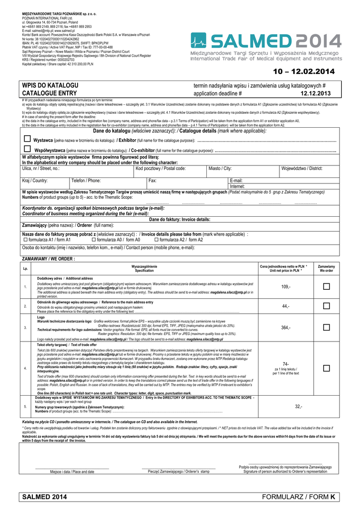 MIĘDZYNARODOWE TARGI POZNAŃSKIE sp. z o. o. POZNAŃ INTERNATIONAL FAIR Ltd. ul. Głogowska 14, 60-734 Poznań, Poland tel +48/61 869 2149, 869 2116; fax +48/61 869 2953 E-mail: [email protected]; www.salmed.pl Konto/ Bank account: Powszechna Kasa Oszczędności Bank Polski S.A. w Warszawie o/Poznań Nr konta: 38 102040270000110204242962 IBAN: PL 46 102040270000140210929075, SWIFT: BPKOPLPW Płatnik VAT czynny / Active VAT Payer, NIP / Tax ID: 777-00-00-488 Sąd Rejonowy Poznań – Nowe Miasto i Wilda w Poznaniu / Poznan District Court VIII Wydział Gospodarczy Krajowego Rejestru Sądowego / 8th Division of National Court Register KRS / Registered number: 0000202703 Kapitał zakładowy / Share capital: 42 310 200,00 PLN 10 – 12.02.2014 WPIS DO KATALOGU CATALOGUE ENTRY termin nadsyłania wpisu i zamówienia usług katalogowych # application deadline # 12.12.2013 # W przypadkach nadesłania niniejszego formularza po tym terminie: a) wpis do katalogu objęty opłatą rejestracyjną (nazwa i dane teleadresowe – szczegóły pkt. 3.1 Warunków Uczestnictwa) zostanie dokonany na podstawie danych z formularza A1 (Zgłoszenie uczestnictwa) lub formularza A0 (Zgłoszenie Wystawcy) b) wpis do katalogu objęty opłatą za zgłoszenie współwystawcy (nazwa i dane teleadresowe – szczegóły pkt. 4.1 Warunków Uczestnictwa) zostanie dokonany na podstawie danych z formularza A2 (Zgłoszenie współwystawcy). # In case of sending the present form after the deadline: a) the data in the catalogue entry, included in the registration fee (company name, address and phone/fax data – p.3.1 Terms of Participation) will be taken from the application form A1 or exhibitor application A0, b) the data in the catalogue entry included in the registration fee for co-exhibitor (company name, address and phone/fax data – p.4.1 Terms of Participation) will be taken from the application form A2. Dane do katalogu (właściwe zaznaczyć): / Catalogue details (mark where applicable): Wystawca (pełna nazwa w brzmieniu do katalogu): / Exhibitor (full name for the catalogue purpose): …………………………………………………………………………………………… Współwystawca (pełna nazwa w brzmieniu do katalogu): / Co-exhibitor (full name for the catalogue purpose): ……………………………………………………………………………….. W alfabetycznym spisie wystawców firma powinna figurować pod literą: In the alphabetical entry company should be placed under the following character: Ulica, nr / Street, no.: Kod pocztowy / Postal code: Kraj / Country: Telefon / Phone: Miasto / City: Fax: Województwo / District: E-mail: Internet: W spisie wystawców według Zakresu Tematycznego Targów proszę umieścić naszą firmę w następujących grupach (Podać maksymalnie do 5 grup z Zakresu Tematycznego) Numbers of product groups (up to 5) - acc. to the Thematic Scope: ……………… ……………… ……………… ……………… ……………… Koordynator ds. organizacji spotkań biznesowych podczas targów (e-mail): Coordinator of business meeting organized during the fair (e-mail): Dane do faktury: Invoice details: Zamawiający (pełna nazwa): / Orderer (full name): Nasze dane do faktury proszę pobrać z (właściwe zaznaczyć) : / Invoice details please take from (mark where applicable) : formularza A1 / form A1 formularza A0 / form A0 formularza A2 / form A2 Osoba do kontaktu (imię i nazwisko, telefon kom., e-mail) / Contact person (mobile phone, e-mail): ZAMAWIAMY / WE ORDER : Lp. Wyszczególnienie Specification 1. Dodatkowy adres / Additional address Dodatkowy adres umieszczany jest pod głównym (obligatoryjnym) wpisem adresowym. Warunkiem zamieszczenia dodatkowego adresu w katalogu wystawców jest jego przesłanie pod adres e-mail: [email protected] lub w formie drukowanej. The additional address is placed beneath the main address entry (obligatory entry). The address should be send to e-mail address: [email protected] or in printed version. 2. Odnośnik do głównego wpisu adresowego / Reference to the main address entry Odnośnik do wpisu obligatoryjnego prosimy umieścić pod następującym hasłem: Please place the reference to the obligatory entry under the following text: …………………………………………………………………………………………… 3. Logo Warunki techniczne dostarczania logo: Grafika wektorowa: format plików EPS – wszystkie uŜyte czcionki muszą być zamienione na krzywe Grafika rastrowa: Rozdzielczość 300 dpi, format EPS, TIFF, JPEG (maksymalna utrata jakości do 20%). Technical requirements for logo submissions: Vector graphics: File format: EPS; all fonts must be converted to curves. Raster graphics: Resolution: 300 dpi; file formats: EPS, TIFF or JPEG (maximum quality loss up to 20%). Logo naleŜy przesłać pod adres e-mail: [email protected] / The logo should be send to e-mail address: [email protected] 4. 5. Cena jednostkowa netto w PLN * Unit net price in PLN * Tekst oferty targowej / Text of trade offer Tekst (do 600 znaków) powinien dotyczyć Państwa oferty prezentowanej na targach. Warunkiem zamieszczenia tekstu oferty targowej w katalogu wystawców jest jego przesłanie pod adres e-mail: [email protected] lub w formie drukowanej. Prosimy o przesłanie tekstu w języku polskim oraz w miarę moŜliwości w języku angielskim i rosyjskim w celu zachowania poprawności tłumaczeń. W przypadku braku tłumaczeń, zostaną one wykonane przez MTP.Redakcja katalogu zastrzega sobie prawo do korekty tekstu niezgodnego z tematyką targów i charakterem katalogu. Przy obliczaniu naleŜności jako jednostkę miary stosuje się 1 linię (60 znaków) w języku polskim. Rodzaje znaków: litery, cyfry, spacje, znaki interpunkcyjne. Text of trade offer (max 600 characters) should contain only information concerning offer presented during the fair. Text in key words should be send to e-mai