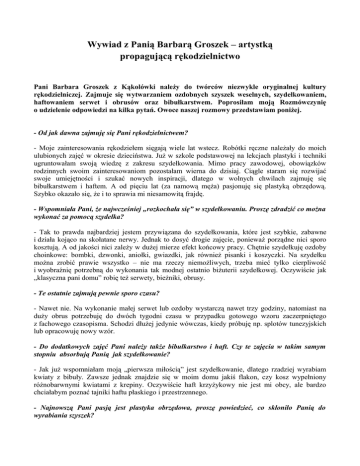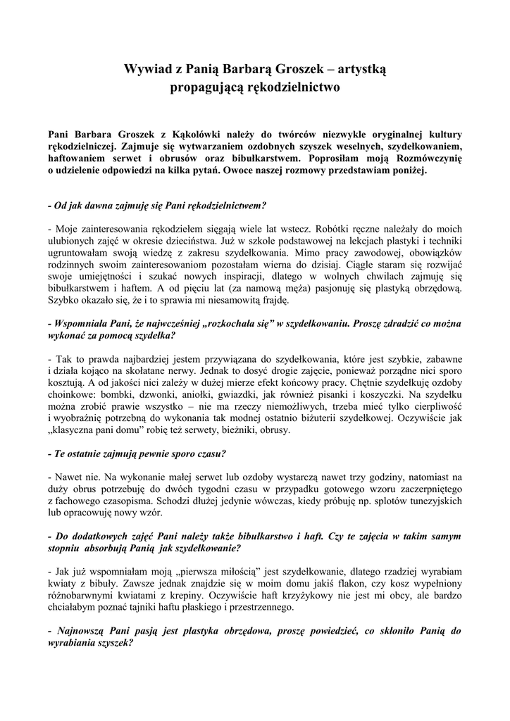 Wywiad z Panią Barbarą Groszek – artystką propagującą rękodzielnictwo Pani Barbara Groszek z Kąkolówki należy do twórców niezwykle oryginalnej kultury rękodzielniczej. Zajmuje się wytwarzaniem ozdobnych szyszek weselnych, szydełkowaniem, haftowaniem serwet i obrusów oraz bibułkarstwem. Poprosiłam moją Rozmówczynię o udzielenie odpowiedzi na kilka pytań. Owoce naszej rozmowy przedstawiam poniżej. - Od jak dawna zajmuję się Pani rękodzielnictwem? - Moje zainteresowania rękodziełem sięgają wiele lat wstecz. Robótki ręczne należały do moich ulubionych zajęć w okresie dzieciństwa. Już w szkole podstawowej na lekcjach plastyki i techniki ugruntowałam swoją wiedzę z zakresu szydełkowania. Mimo pracy zawodowej, obowiązków rodzinnych swoim zainteresowaniom pozostałam wierna do dzisiaj. Ciągle staram się rozwijać swoje umiejętności i szukać nowych inspiracji, dlatego w wolnych chwilach zajmuję się bibułkarstwem i haftem. A od pięciu lat (za namową męża) pasjonuję się plastyką obrzędową. Szybko okazało się, że i to sprawia mi niesamowitą frajdę. - Wspomniała Pani, że najwcześniej „rozkochała się” w szydełkowaniu. Proszę zdradzić co można wykonać za pomocą szydełka? - Tak to prawda najbardziej jestem przywiązana do szydełkowania, które jest szybkie, zabawne i działa kojąco na skołatane nerwy. Jednak to dosyć drogie zajęcie, ponieważ porządne nici sporo kosztują. A od jakości nici zależy w dużej mierze efekt końcowy pracy. Chętnie szydełkuję ozdoby choinkowe: bombki, dzwonki, aniołki, gwiazdki, jak również pisanki i koszyczki. Na szydełku można zrobić prawie wszystko – nie ma rzeczy niemożliwych, trzeba mieć tylko cierpliwość i wyobraźnię potrzebną do wykonania tak modnej ostatnio biżuterii szydełkowej. Oczywiście jak „klasyczna pani domu” robię też serwety, bieżniki, obrusy. - Te ostatnie zajmują pewnie sporo czasu? - Nawet nie. Na wykonanie małej serwet lub ozdoby wystarczą nawet trzy godziny, natomiast na duży obrus potrzebuję do dwóch tygodni czasu w przypadku gotowego wzoru zaczerpniętego z fachowego czasopisma. Schodzi dłużej jedynie wówczas, kiedy próbuję np. splotów tunezyjskich lub opracowuję nowy wzór. - Do dodatkowych zajęć Pani należy także bibułkarstwo i haft. Czy te zajęcia w takim samym stopniu absorbują Panią jak szydełkowanie? - Jak już wspomniałam moją „pierwsza miłością” jest szydełkowanie, dlatego rzadziej wyrabiam kwiaty z bibuły. Zawsze jednak znajdzie się w moim domu jakiś flakon, czy kosz wypełniony różnobarwnymi kwiatami z krepiny. Oczywiście haft krzyżykowy nie jest mi obcy, ale bardzo chciałabym poznać tajniki haftu płaskiego i przestrzennego. - Najnowszą Pani pasją jest plastyka obrzędowa, proszę powiedzieć, co skłoniło Panią do wyrabiania szyszek? - Tradycje ludowe, obrzędy i zwyczaje od zawsze wzbudzały moje ogromne zainteresowanie. Chętnie odwiedzałam starszych mieszkańców swojej miejscowości, którzy opowiadali o dawnych czasach, a przez to pomagali mi zrozumieć starodawne obrzędy i wyjaśniali symbolikę z nimi związaną. Zdałam sobie sprawę, że zwyczaje przekazywane z pokolenia na pokolenie jedynie drogą ustnej tradycji mogą być skazane na zagładę. Są one przecież zjawiskiem, które żyje dopóty, dopóki trwa w praktyce, po czym znika bezpowrotnie, o ile nie zostanie w jakiś sposób utrwalone. Mimo, że plastyka obrzędowa nie miała tradycji w mojej rodzinie, to postanowiłam się nią zająć, aby przedłużyć jej trwanie. Pierwsze kroki stawiłam pod okiem znajomej twórczyni ludowej z Białej. Dzisiaj jest coraz więcej osób zainteresowanych moimi pracami. Zwłaszcza latem mam bardzo dużo zamówień na szyszki i koszyczki z ciasta. Wówczas gdyby nie pomoc najbliższych to nie wiem, czy mogłabym je wszystkie zrealizować. - Czyli rodzina pomaga Pani w wyrobie szyszek? Proszę nam opowiedzieć, jak powstają te małe cuda? - Oczywiście. Ten typ rękodzielnictwa jest bardzo czasochłonny. Najpierw należy wyrobić ciasto z maki i wody o odpowiedniej konsystencji i nadać kolor stosując różne barwniki. Następnie trzeba uformować spód szyszki, a później ręcznie każdy jej element. Dlatego bez pomocy męża i dwójki dzieci sama nie wypiekłabym i nie ozdobiłabym 250 szyszek i 100 koszyków, bo takie największe zamówienie udało się nam wspólnie zrealizować. Są oczywiście mniejsze zapotrzebowania, ale to zależy od ilości gości weselnych. Najważniejsze, że moi najbliżsi chcą mi pomagać. Cieszy mnie fakt, że mój syn, który chodzi do 3 kl. szkoły podstawowej sam potrafi uformować szyszkę, a córka – gimnazjalistka – realizuje własne, twórcze pomysły na ozdoby weselne, z całkiem niezłym rezultatem. - Wiem, że chętnie prezentuje Pani swoje prace na różnych imprezach kulturalnych i konkursach. Czy mogłaby Pani pochwalić się swymi osiągnięciami? - Dość często zdarza mi się wystawiać wyroby rękodzielnicze, bo nawet trzy razy w roku. Zawsze korzystam z zaproszeń Gminnego Ośrodka Kultury w Błażowej, Wojewódzkiego Domu Kultury w Rzeszowie, czy Podkarpackiego Ośrodka Doradztwa Rolniczego w Boguchwale. Coraz częściej jestem zapraszana na festyny organizowane z udziałem dużych firm, jak np. RCMB w Rzeszowie. Na koniec dodam, ze moje prace były nawet w Portugalii i Niemczech. - Jakie są Pani plany i marzenia związane z przyszłością rękodzielnictwa? - Wraz z kilkoma innymi paniami, pasjonatkami o podobnych zainteresowaniach, które przez swoją działalność gromadzą wokół siebie ludzi, doceniających potencjał swych małych ojczyzn, marzę o tym, by każdy kto odwiedzi naszą gminę, mógł poczuć jej klimat. Być może uda nam się w przyszłości powołać stowarzyszenie, które pozwoli nam w pełni realizować swe zamierzenia. - Dziękuję za rozmowę. Aneta Garduła – uczennica kl. VI SP w Kąko