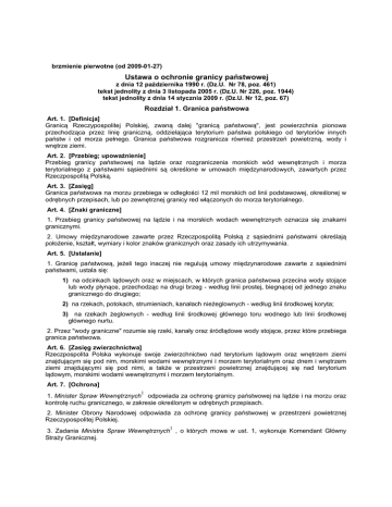 brzmienie pierwotne (od 2009-01-27) Ustawa o ochronie granicy państwowej z dnia 12 października 1990 r. (Dz.U. Nr 78, poz. 461) tekst jednolity z dnia 3 listopada 2005 r. (Dz.U. Nr 226, poz. 1944) tekst jednolity z dnia 14 stycznia 2009 r. (Dz.U. Nr 12, poz. 67) Rozdział 1. Granica państwowa Art. 1. [Definicja] Granicą Rzeczypospolitej Polskiej, zwaną dalej "granicą państwową", jest powierzchnia pionowa przechodząca przez linię graniczną, oddzielająca terytorium państwa polskiego od terytoriów innych państw i od morza pełnego. Granica państwowa rozgranicza również przestrzeń powietrzną, wody i wnętrze ziemi. Art. 2. [Przebieg; upoważnienie] Przebieg granicy państwowej na lądzie oraz rozgraniczenia morskich wód wewnętrznych i morza terytorialnego z państwami sąsiednimi są określone w umowach międzynarodowych, zawartych przez Rzeczpospolitą Polską. Art. 3. [Zasięg] Granica państwowa na morzu przebiega w odległości 12 mil morskich od linii podstawowej, określonej w odrębnych przepisach, lub po zewnętrznej granicy red włączonych do morza terytorialnego. Art. 4. [Znaki graniczne] 1. Przebieg granicy państwowej na lądzie i na morskich wodach wewnętrznych oznacza się znakami granicznymi. 2. Umowy międzynarodowe zawarte przez Rzeczpospolitą Polską z sąsiednimi państwami określają położenie, kształt, wymiary i kolor znaków granicznych oraz zasady ich utrzymywania. Art. 5. [Ustalanie] 1. Granicę państwową, jeżeli tego inaczej nie regulują umowy międzynarodowe zawarte z sąsiednimi państwami, ustala się: 1) na odcinkach lądowych oraz w miejscach, w których granica państwowa przecina wody stojące lub wody płynące, przechodząc na drugi brzeg - według linii prostej, biegnącej od jednego znaku granicznego do drugiego; 2) na rzekach, potokach, strumieniach, kanałach nieżeglownych - według linii środkowej koryta; 3) na rzekach żeglownych - według linii środkowej głównego toru wodnego lub linii środkowej głównego nurtu. 2. Przez "wody graniczne" rozumie się rzeki, kanały oraz śródlądowe wody stojące, przez które przebiega granica państwowa. Art. 6. [Zasięg zwierzchnictwa] Rzeczpospolita Polska wykonuje swoje zwierzchnictwo nad terytorium lądowym oraz wnętrzem ziemi znajdującym się pod nim, morskimi wodami wewnętrznymi i morzem terytorialnym oraz dnem i wnętrzem ziemi znajdującymi się pod nimi, a także w przestrzeni powietrznej znajdującej się nad terytorium lądowym, morskimi wodami wewnętrznymi i morzem terytorialnym. Art. 7. [Ochrona] 1 1. Minister Spraw Wewnętrznych odpowiada za ochronę granicy państwowej na lądzie i na morzu oraz kontrolę ruchu granicznego, w zakresie określonym w odrębnych przepisach. 2. Minister Obrony Narodowej odpowiada za ochronę granicy państwowej w przestrzeni powietrznej Rzeczypospolitej Polskiej. 1 3. Zadania Ministra Spraw Wewnętrznych , o których mowa w ust. 1, wykonuje Komendant Główny Straży Granicznej. 4. Zadania Ministra Obrony Narodowej w zakresie ochrony granicy państwowej w przestrzeni powietrznej Rzeczypospolitej Polskiej wykonuje Dowódca Operacyjny Sił Zbrojnych. Rozdział 2. Pogranicze Art. 8. [Pas drogi granicznej; strefa nadgraniczna] W celu ochrony granicy państwowej ustanawia się pas drogi granicznej i strefę nadgraniczną. Art. 9. [Definicja; zakazy przebywania] 1. Pasem drogi granicznej jest obszar o szerokości 15 metrów, licząc w głąb kraju od linii granicy państwowej lub od brzegu wód granicznych albo brzegu morskiego. 2. Jeżeli wynika to bezpośrednio z potrzeb związanych z ochroną granicy państwowej, wojewoda może, na wniosek lub po zaopiniowaniu przez właściwy organ ochrony granicy państwowej, wprowadzić zakaz przebywania na niektórych odcinkach pasa drogi granicznej. 3. Zakazu, o którym mowa w ust. 2, nie stosuje się do właścicieli lub użytkowników gruntów położonych w pasie drogi granicznej. 4. Zakaz, o którym mowa w ust. 2, nie może być ustanawiany na oznakowanych szlakach turystycznych, brzegu morskim i w kąpieliskach. 4a. W pasie drogi granicznej umieszcza się w dobrze widocznych miejscach tablice informacyjne z napisem "Granica państwa przekraczanie zabronione. 5. Pas drogi granicznej w miejscach, w których jest wprowadzony zakaz przebywania, oznacza się w dobrze widocznych miejscach tablicami z napisem "Pas drogi granicznej - wejście zabronione". 5a. Minister właściwy do spraw wewnętrznych określi, w drodze rozporządzenia, wzór tablic, o których mowa w ust. 4a i 5, oraz sposób ich utrzymywania przez właściwych komendantów oddziałów Straży Granicznej, uwzględniając konieczność należytego oznaczenia przebiegu granicy państwowej oraz pasa drogi granicznej. Art. 10. [Oznakowanie i ochrona] 1. Na gruntach położonych w pasie drogi granicznej Straż Graniczna może wykonywać czynności związane z oznakowaniem i ochroną granicy państwowej oraz budową urządzeń służących tej ochronie. Właściciele lub użytkownicy tych gruntów są obowiązani do umożliwienia wykonywania tych czynności. 2. Ze względów technicznych dopuszcza się budowanie urządzeń służących ochronie granicy państwowej także poza pasem drogi granicznej. 3. Właścicielowi nieruchomości za szkody wyrządzone czynnościami, o których mowa w ust. 1 i 2, przysługuje odszkodowanie według zasad prawa cywilnego. Art. 11. [Utrzymywanie] 1. W pasie drogi granicznej grunty i lasy przylegające do granicy państwowej lub do brzegów rzek granicznych powinny być utrzymywane w stanie zapewniającym widoczność linii granicy państwowej i znaków granicznych. 2. Właściciele i użytkownicy gruntów i lasów, o których mowa w ust. 1, są obowiązani do oczyszczania, odpłatnie na warunkach uzgodnionych z właściwymi organami Straży Granicznej, tych gruntów i lasów z drzew i krzewów oraz innych zarośli na szerokość ustaloną w umowach międzynarodowych zawartych przez Rzeczpospolitą Po
