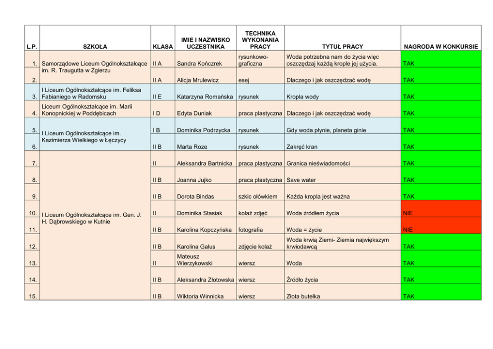 L.P. SZKOŁA KLASA IMIE I NAZWISKO UCZESTNIKA TECHNIKA WYKONANIA PRACY TYTUŁ PRACY NAGRODA W KONKURSIE 1. Samorządowe Liceum Ogólnokształcące II A im. R. Traugutta w Zgierzu Sandra Kończrek rysunkowograficzna Woda potrzebna nam do życia więc oszczędzaj każdą krople jej użycia. TAK 2. II A Alicja Mrulewicz esej Dlaczego i jak oszczędzać wodę TAK I Liceum Ogólnokształcące im. Feliksa 3. Fabianiego w Radomsku II E Katarzyna Romańska rysunek Kropla wody TAK Liceum Ogólnokształcące im. Marii 4. Konopnickiej w Poddębicach ID Edyta Duniak praca plastyczna Dlaczego i jak oszczędzać wodę TAK 5. IB Dominika Podrzycka rysunek Gdy woda płynie, planeta ginie TAK 6. II B Marta Roze rysunek Zakręć kran TAK 7. II Aleksandra Bartnicka praca plastyczna Granica nieświadomości TAK 8. II B Joanna Jujko praca plastyczna Save water TAK 9. II B Dorota Bindas szkic ołówkiem Każda kropla jest ważna TAK 10. I Liceum Ogólnokształcące im. Gen. J. H. Dąbrowskiego w Kutnie 11. II Dominika Stasiak kolaż zdjęć Woda źródłem życia NIE II B Karolina Kopczyńska fotografia Woda = życie NIE 12. II B Karolina Galus zdjęcie kolaż Woda krwią Ziemi- Ziemia największym krwiodawcą TAK 13. II Mateusz Wierzykowski wiersz Woda TAK 14. II B Aleksandra Złotowska wiersz Źródło życia TAK 15. II B Wiktoria Winnicka Złota butelka TAK I Liceum Ogólnokształcące im. Kazimierza Wielkiego w Łęczycy wiersz 16. II B Małgorzata Kochanowska wiersz Płynne złoto TAK 17. II B Justyna Lewandowska wiersz Oszczędzaj H2O TAK 18. II B Agata Kaźmierczak wiersz Murzynek Bambo TAK 19. II Kacper Stoś wiersz Wartość wody TAK 20. II Maciej Grzebielucha wiersz Woda czyli ja zsostać przyjacielem H2O TAK 21. II B Aleksandra Rykalska wiersz Szanuj wodę TAK Aleksandra Oleksiewicz wiersz Dlaczego należy oszczędzać wodę TAK 22. 23. II B Maria Kalbarczyk esej Dlaczego należy oszczędzać wodę TAK 24. II Patrycja Mielczarek kredki Woda na miarę złota TAK 25. IA Michalina Piotrowska akwarela/pastele suche Być albo nie być TAK II Aleksandra Zając akwarela NIE I Liceum Ogólnokształcące im. T. Kościuszki w Łasku 26. LICZBA WSZYSTKICH PRAC KONKURSOWYCH ZE SZKÓŁ W WOJEWÓDZTWIE ŁÓDZKIM – 26 LICZBA PRAC NAGRODZONYCH – 23 SZKOŁY: Samorządowe Liceum Ogólnokształcące im. R. Traugutta w Zgierzu – 2 PRACE I Liceum Ogólnokształcące im. Feliksa Fabianiego w Radomsku – 1 PRACA Liceum Ogólnokształcące im. Marii Konopnickiej w Poddębicach – 1 PRACA Równowaga I Liceum Ogólnokształcące im. Kazimierza Wielkiego w Łęczycy – 2 PRACE I Liceum Ogólnokształcące im. Gen. J. H. Dąbrowskiego w Kutnie – 15 PRAC I Liceum Ogólnokształcące im. T. Kościuszki w Łasku – 2 PRACE LICZBA PRAC NIENAGRODZONYCH – 3 SZKOŁY: I Liceum Ogólnokształcące im. Gen. J. H. Dąbrowskiego w Kutnie – 2 PRACE I Liceum Ogólnokształcące im. T. Kościuszki w Łasku – 1 PRACA