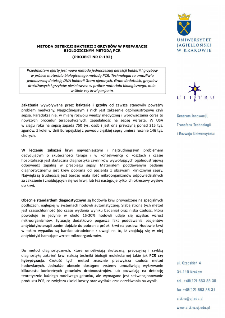 METODA DETEKCJI BAKTERII I GRZYBÓW W PREPARACIE BIOLOGICZNYM METODĄ PCR (PROJEKT NR P-192) Przedmiotem oferty jest nowa metoda jednoczesnej detekcji bakterii i grzybów w próbce materiału biologicznego metodą PCR. Technologia ta umożliwia jednoczesną detekcję DNA bakterii Gram ujemnych, Gram dodatnich, grzybów drożdżowych i grzybów pleśniowych w próbce materiału biologicznego, m.in. w ślinie czy krwi pacjenta. Zakażenia wywoływane przez bakterie i grzyby od zawsze stanowiły poważny problem medyczny. Najgroźniejszym z nich jest zakażenie ogólnoustrojowe czyli sepsa. Paradoksalnie, w miarę rozwoju wiedzy medycznej i wprowadzania coraz to nowszych procedur terapeutycznych, zapadalność na sepsę wzrasta. W USA w ciągu roku na sepsę zapada 750 tys. osób i jest ona przyczyną ponad 215 tys. zgonów. Z kolei w Unii Europejskiej z powodu ciężkiej sepsy umiera rocznie 146 tys. chorych. W leczeniu zakażeń krwi najważniejszym i najtrudniejszym problemem decydującym o skuteczności terapii i w konsekwencji o kosztach i czasie hospitalizacji jest skuteczna diagnostyka czynników wywołujących ogólnoustrojową odpowiedź zapalną w przebiegu sepsy. Materiałem poddawanym badaniu diagnostycznemu jest krew pobrana od pacjenta z objawami klinicznymi sepsy. Największą trudnością jest bardzo mała ilość mikroorganizmów odpowiedzialnych za zakażenie i znajdujących się we krwi, lub też następuje tylko ich okresowy wysiew do krwi. Obecnie standardem diagnostycznym są hodowle krwi prowadzone na specjalnych podłożach, najlepiej w systemach hodowli automatycznej. Słabą stroną tych metod jest czasochłonność (do czasu wydania wyniku badania) oraz niska czułość, która powoduje że jedynie w około 15‐20% hodowli udaje się uzyskać wzrost mikroorganizmów. Sytuację dodatkowo pogarsza fakt poddawania pacjentów antybiotykoterapii zanim dojdzie do pobrania próbki krwi na posiew. Hodowle krwi w takim wypadku są bardzo utrudnione z uwagi na to, iż znajdują się w niej antybiotyki hamujące wzrost mikroorganizmów. Do metod diagnostycznych, które umożliwiają skuteczną, precyzyjną i szybką diagnostykę zakażeń krwi należą techniki biologii molekularnej takie jak PCR czy hybrydyzacja. Czułość tych metod znacznie przewyższa czułość metod hodowlanych. Jednakże obecnie dostępne systemy umożliwiają wykrywanie kilkunastu konkretnych gatunków drobnoustrojów, lub pozwalają na detekcję teoretycznie każdego możliwego gatunku, ale wymagane jest sekwencjonowanie produktu PCR, co zwiększa z kolei koszty oraz wydłuża czas oczekiwania na wynik. Przedmiotem wynalazku jest nowa metoda detekcji bakterii i grzybów w próbce materiału biologicznego, w którym zawarte DNA poddaje się amplifikacji w reakcji PCR w czasie rzeczywistym w systemie multipleksowym. Reakcję amplifikacji prowadzi się dwuetapowo z zastosowaniem w pierwszym etapie starterów specyficznych dla bakterii oraz grzybów, a następnie produkt pierwszej amplifikacji wykorzystuje się jako matrycę w drugim etapie – amplifikacji z zastosowaniem starterów i sond różnicujących grzyby na grupę grzybów pleśniowych i drożdżopodobnych i bakterie na Gram dodatnie i Gram ujemne. Do podstawowych zalet proponowanej metody należą: objęcie całości panelu mikroorganizmów bakteryjnych i grzybiczych, z różnicowaniem na bakterie Gram ujemne, Gram dodatnie, grzyby drożdżopodobne i grzyby pleśniowe, lecz bez typowania konkretnych gatunków; jednoczesna amplifikacja co najmniej 2 sekwencji DNA, co pozwala na jednoczesną detekcję bakterii i grzybów, bez oczekiwania na wynik elektroforezy DNA; zastosowanie systemu Nested pozwala na zwiększenie czułości metody detekcji o dwa rzędy wielkości w porównaniu do PCR jednostopniowego; możliwość wykorzystania metody do wykrywania tylko bakterii lub tylko grzybów, lub do jednoczesnego wykrywania zarówno grzybów jak i bakterii, co wpływa na obniżenie kosztów badania. możliwość wytypowania konkretnego po sekwencjonowaniu produktu PCR. gatunku drobnoustroju Oferowana metoda detekcji bakterii i grzybów w preparacie biologicznym stanowi przedmiot zgłoszenia patentowego. Dalsze prace nad jej rozwojem są prowadzone w Katedrze Mikrobiologii UJ CM, a Centrum Innowacji, Transferu Technologii i Rozwoju Uniwersytetu poszukuje podmiotów zainteresowanych komercyjnym wykorzystaniem wynalazku. Dalsze informacje: dr Klaudia Polakowska Specjalista ds. Transferu Technologii CITTRU, Uniwersytet Jagielloński www.cittru.uj.edu.pl tel. 12 663 3832, fax: 12 663 3831 e-mail: [email protected]