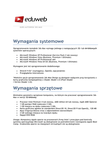 __________________________________ KURS AUTODESK 3DS MAX Wymagania systemowe Oprogramowanie Autodesk 3ds Max wymaga jednego z następujących 32- lub 64-bitowych systemów operacyjnych: • • • • Microsoft Windows Microsoft Windows Microsoft Windows Microsoft Windows XP Professional (Service Pack 2 lub nowszy) Vista (Business, Premium i Ultimate) XP Professional x64 Vista 64 bit (Business, Premium i Ultimate) Wymagane jest też oprogramowanie dodatkowego: • • DirectX 9.0c* (wymagany), OpenGL (opcjonalnie) Przeglądarka internetowa *Niektóre opcje oprogramowania 3ds Max Design są dostępne wyłącznie przy korzystaniu z karty graficznej kompatybilnej z Shader Model 3.0 (Pixel Shader i Vertex Shader 3.0). Wymagania sprzętowe Minimalne parametry sprzętowe komputera, na którym ma pracować oprogramowanie 3ds Max w wersji 32-bitowej: • • • • • • • Procesor Intel Pentium 4 lub nowszy, AMD Athlon 64 lub nowszy, bądź AMD Opteron 1 GB pamięci RAM (zalecane 2 GB) 1 GB miejsca na dysku (zalecane 2 GB) Karta graficzna zgodna ze standardem Direct3D 10, Direct3D 9 lub OpenGL, 128 MB Mysz trójprzyciskowa wraz z odpowiednimi sterownikami 2 GB wolnego miejsca na twardym dysku Napęd DVD-ROM Uwaga: Komputery Apple oparte na procesorach firmy Intel i pracujące pod kontrolą systemu operacyjnego Microsoft są obsługiwane za pośrednictwem rozwiązania Apple Boot Camp. Środowiska oparte na maszynach wirtualnych nie są obsługiwane. Minimalne parametry sprzętowe komputera, na którym ma pracować oprogramowanie 3ds Max 2010 w wersji 64-bitowej: • • • • • • • Procesor Intel EM64T, AMD Athlon 64 lub nowszy, bądź AMD Opteron 1 GB pamięci RAM (zalecane 4 GB) 1 GB miejsca na dysku (zalecane 2 GB) Karta graficzna zgodna ze standardem Direct3D 10, Direct3D 9 lub OpenGL, 128 MB Mysz trójprzyciskowa wraz z odpowiednimi sterownikami 2 GB wolnego miejsca na twardym dysku Napęd DVD-ROM Skąd Pobrać 3ds Max? Wersję próbną można pobrać ze strony www.autodesk.pl wchodząc w zakładkę produkty a następnie wybierając z listy 3ds Max. Znajduje się tam też opis oraz prezentacja programu. Ściągnięty program to 30-dniowa wersja Autodesk 3ds Max. W pełni funkcjonalna wersja oprogramowania, dzięki której uzyskać można nieodpłatny dostęp do oprogramowania w celach niekomercyjnego wykorzystania. ________________________________________________________________________ Tel. 022 398 33 61 Tel. 022 398 48 97 e-mail: [email protected] INSIGO GRZEGORZ RÓG UL. FILTROWA 79/13 02-032 WARSZAWA