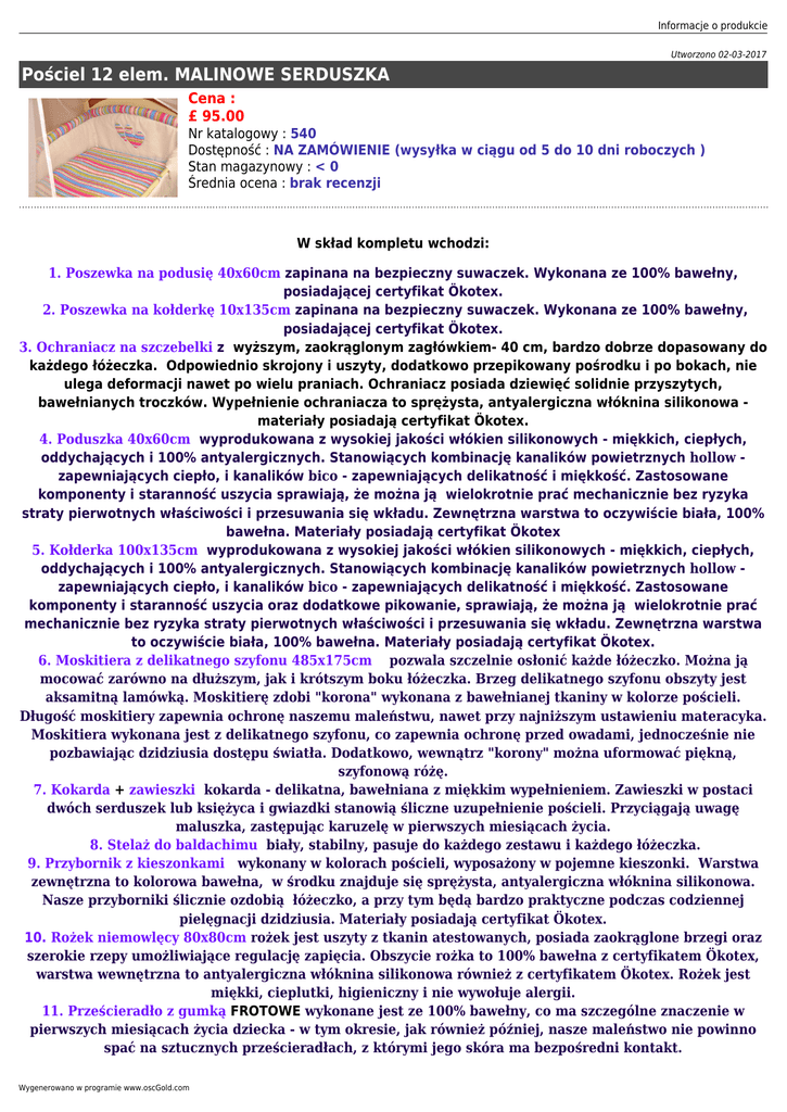 Informacje o produkcie Utworzono 02-03-2017 Pościel 12 elem. MALINOWE SERDUSZKA Cena : £ 95.00 Nr katalogowy : 540 Dostępność : NA ZAMÓWIENIE (wysyłka w ciągu od 5 do 10 dni roboczych ) Stan magazynowy : < 0 Średnia ocena : brak recenzji W skład kompletu wchodzi: 1. Poszewka na podusię 40x60cm zapinana na bezpieczny suwaczek. Wykonana ze 100% bawełny, posiadającej certyfikat Ökotex. 2. Poszewka na kołderkę 10x135cm zapinana na bezpieczny suwaczek. Wykonana ze 100% bawełny, posiadającej certyfikat Ökotex. 3. Ochraniacz na szczebelki z wyższym, zaokrąglonym zagłówkiem- 40 cm, bardzo dobrze dopasowany do każdego łóżeczka. Odpowiednio skrojony i uszyty, dodatkowo przepikowany pośrodku i po bokach, nie ulega deformacji nawet po wielu praniach. Ochraniacz posiada dziewięć solidnie przyszytych, bawełnianych troczków. Wypełnienie ochraniacza to sprężysta, antyalergiczna włóknina silikonowa materiały posiadają certyfikat Ökotex. 4. Poduszka 40x60cm wyprodukowana z wysokiej jakości włókien silikonowych - miękkich, ciepłych, oddychających i 100% antyalergicznych. Stanowiących kombinację kanalików powietrznych hollow zapewniających ciepło, i kanalików bico - zapewniających delikatność i miękkość. Zastosowane komponenty i staranność uszycia sprawiają, że można ją wielokrotnie prać mechanicznie bez ryzyka straty pierwotnych właściwości i przesuwania się wkładu. Zewnętrzna warstwa to oczywiście biała, 100% bawełna. Materiały posiadają certyfikat Ökotex 5. Kołderka 100x135cm wyprodukowana z wysokiej jakości włókien silikonowych - miękkich, ciepłych, oddychających i 100% antyalergicznych. Stanowiących kombinację kanalików powietrznych hollow zapewniających ciepło, i kanalików bico - zapewniających delikatność i miękkość. Zastosowane komponenty i staranność uszycia oraz dodatkowe pikowanie, sprawiają, że można ją wielokrotnie prać mechanicznie bez ryzyka straty pierwotnych właściwości i przesuwania się wkładu. Zewnętrzna warstwa to oczywiście biała, 100% bawełna. Materiały posiadają certyfikat Ökotex. 6. Moskitiera z delikatnego szyfonu 485x175cm pozwala szczelnie osłonić każde łóżeczko. Można ją mocować zarówno na dłuższym, jak i krótszym boku łóżeczka. Brzeg delikatnego szyfonu obszyty jest aksamitną lamówką. Moskitierę zdobi "korona" wykonana z bawełnianej tkaniny w kolorze pościeli. Długość moskitiery zapewnia ochronę naszemu maleństwu, nawet przy najniższym ustawieniu materacyka. Moskitiera wykonana jest z delikatnego szyfonu, co zapewnia ochronę przed owadami, jednocześnie nie pozbawiając dzidziusia dostępu światła. Dodatkowo, wewnątrz "korony" można uformować piękną, szyfonową różę. 7. Kokarda + zawieszki kokarda - delikatna, bawełniana z miękkim wypełnieniem. Zawieszki w postaci dwóch serduszek lub księżyca i gwiazdki stanowią śliczne uzupełnienie pościeli. Przyciągają uwagę maluszka, zastępując karuzelę w pierwszych miesiącach życia. 8. Stelaż do baldachimu biały, stabilny, pasuje do każdego zestawu i każdego łóżeczka. 9. Przybornik z kieszonkami wykonany w kolorach pościeli, wyposażony w pojemne kieszonki. Warstwa zewnętrzna to kolorowa bawełna, w środku znajduje się sprężysta, antyalergiczna włóknina silikonowa. Nasze przyborniki ślicznie ozdobią łóżeczko, a przy tym będą bardzo praktyczne podczas codziennej pielęgnacji dzidziusia. Materiały posiadają certyfikat Ökotex. 10. Rożek niemowlęcy 80x80cm rożek jest uszyty z tkanin atestowanych, posiada zaokrąglone brzegi oraz szerokie rzepy umożliwiające regulację zapięcia. Obszycie rożka to 100% bawełna z certyfikatem Ökotex, warstwa wewnętrzna to antyalergiczna włóknina silikonowa również z certyfikatem Ökotex. Rożek jest miękki, cieplutki, higieniczny i nie wywołuje alergii. 11. Prześcieradło z gumką FROTOWE wykonane jest ze 100% bawełny, co ma szczególne znaczenie w pierwszych miesiącach życia dziecka - w tym okresie, jak również później, nasze maleństwo nie powinno spać na sztucznych prześcieradłach, z którymi jego skóra ma bezpośredni kontakt. Wygenerowano w programie www.oscGold.com 12. Prześcieradło maskujące z falbaną pod materacyk uszyte z tych samych materiałów co cała pościel, pięknie komponuje się z całością i zdobi łóżeczko.