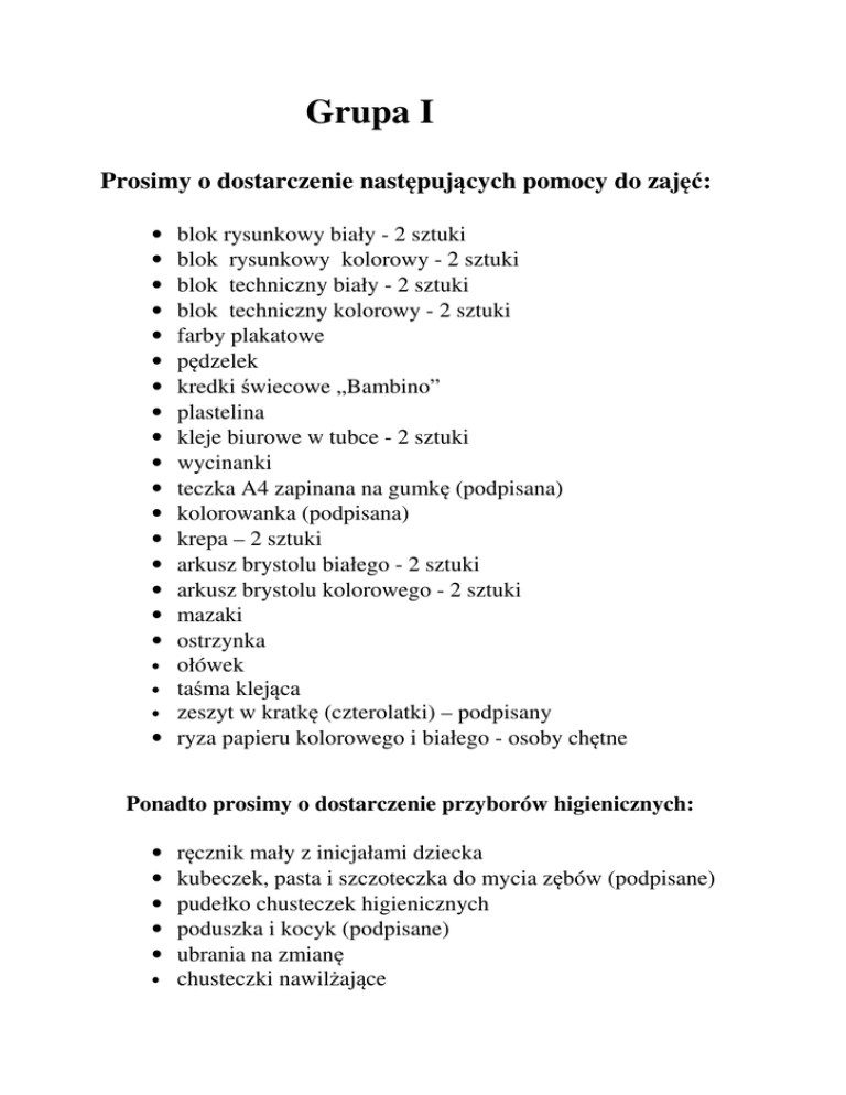 Grupa I Prosimy o dostarczenie następujących pomocy do zajęć: blok rysunkowy biały - 2 sztuki blok rysunkowy kolorowy - 2 sztuki blok techniczny biały - 2 sztuki blok techniczny kolorowy - 2 sztuki farby plakatowe pędzelek kredki świecowe „Bambino” plastelina kleje biurowe w tubce - 2 sztuki wycinanki teczka A4 zapinana na gumkę (podpisana) kolorowanka (podpisana) krepa – 2 sztuki arkusz brystolu białego - 2 sztuki arkusz brystolu kolorowego - 2 sztuki mazaki ostrzynka • ołówek • taśma klejąca • zeszyt w kratkę (czterolatki) – podpisany • ryza papieru kolorowego i białego - osoby chętne • • • • • • • • • • • • • • • • • Ponadto prosimy o dostarczenie przyborów higienicznych: • • • • • • ręcznik mały z inicjałami dziecka kubeczek, pasta i szczoteczka do mycia zębów (podpisane) pudełko chusteczek higienicznych poduszka i kocyk (podpisane) ubrania na zmianę chusteczki nawilżające