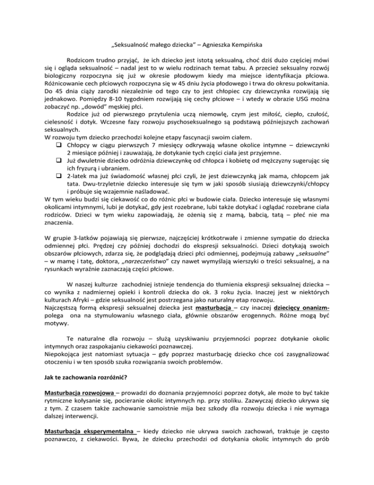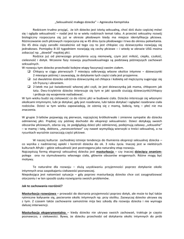 „Seksualność małego dziecka” – Agnieszka Kempińska Rodzicom trudno przyjąć, że ich dziecko jest istotą seksualną, choć dziś dużo częściej mówi się i ogląda seksualność – nadal jest to w wielu rodzinach temat tabu. A przecież seksualny rozwój biologiczny rozpoczyna się już w okresie płodowym kiedy ma miejsce identyfikacja płciowa. Różnicowanie cech płciowych rozpoczyna się w 45 dniu życia płodowego i trwa do okresu pokwitania. Do 45 dnia ciąży zarodki niezależnie od tego czy to jest chłopiec czy dziewczynka rozwijają się jednakowo. Pomiędzy 8-10 tygodniem rozwijają się cechy płciowe – i wtedy w obrazie USG można zobaczyć np. „dowód” męskiej płci. Rodzice już od pierwszego przytulenia uczą niemowlę, czym jest miłość, ciepło, czułość, cielesność i dotyk. Wczesne fazy rozwoju psychoseksualnego są podstawą późniejszych zachowań seksualnych. W rozwoju tym dziecko przechodzi kolejne etapy fascynacji swoim ciałem. Chłopcy w ciągu pierwszych 7 miesięcy odkrywają własne okolice intymne – dziewczynki 2 miesiące później i zauważają, że dotykanie tych części ciała jest przyjemne. Już dwuletnie dziecko odróżnia dziewczynkę od chłopca i kobietę od mężczyzny sugerując się ich fryzurą i ubraniem. 2-latek ma już świadomość własnej płci czyli, że jest dziewczynką jak mama, chłopcem jak tata. Dwu-trzyletnie dziecko interesuje się tym w jaki sposób siusiają dziewczynki/chłopcy i próbuje się wzajemnie naśladować. W tym wieku budzi się ciekawość co do różnic płci w budowie ciała. Dziecko interesuje się własnymi okolicami intymnymi, lubi je dotykać, gdy jest rozebrane, lubi także dotykać i oglądać rozebrane ciała rodziców. Dzieci w tym wieku zapowiadają, że ożenią się z mamą, babcią, tatą – płeć nie ma znaczenia. W grupie 3-latków pojawiają się pierwsze, najczęściej krótkotrwałe i zmienne sympatie do dziecka odmiennej płci. Prędzej czy później dochodzi do ekspresji seksualności. Dzieci dotykają swoich obszarów płciowych, zdarza się, że podglądają dzieci płci odmiennej, podejmują zabawy „seksualne” – w mamę i tatę, doktora, „narzeczeństwo” czy nawet wymyślają wierszyki o treści seksualnej, a na rysunkach wyraźnie zaznaczają części płciowe. W naszej kulturze zachodniej istnieje tendencja do tłumienia ekspresji seksualnej dziecka – co wynika z nadmiernej opieki i kontroli dziecka do ok. 3 roku życia. Inaczej jest w niektórych kulturach Afryki – gdzie seksualność jest postrzegana jako naturalny etap rozwoju. Najczęstszą formą ekspresji seksualnej dziecka jest masturbacja – czy inaczej dziecięcy onanizmpolega ona na stymulowaniu własnego ciała, głównie obszarów erogennych. Różne mogą być motywy. Te naturalne dla rozwoju – służą uzyskiwaniu przyjemności poprzez dotykanie okolic intymnych oraz zaspokajaniu ciekawości poznawczej. Niepokojąca jest natomiast sytuacja – gdy poprzez masturbację dziecko chce coś zasygnalizować otoczeniu i w ten sposób szuka rozwiązania swoich problemów. Jak te zachowania rozróżnić? Masturbacja rozwojowa – prowadzi do doznania przyjemności poprzez dotyk, ale może to być także rytmiczne kołysanie się, pocieranie okolic intymnych np. przy stoliku. Zazwyczaj dziecko ukrywa się z tym. Z czasem także zachowanie samoistnie mija bez szkody dla rozwoju dziecka i nie wymaga dalszej interwencji. Masturbacja eksperymentalna – kiedy dziecko nie ukrywa swoich zachowań, traktuje je często poznawczo, z ciekawości. Bywa, że dziecku przechodzi od dotykania okolic intymnych do prób wkładania przedmiotów do otworów ciała. Wtedy rodzice powinni wyjaśnić dziecko, że tego typu zachowania stanowią zagrożenie i kategorycznie zakazać zachowań, które są szkodliwe. Interwencji wymaga masturbacja instrumentalna. Sygnalizuje ona, że dziecko ma jakiś problem, z którym sobie nie radzi. W ten sposób dziecko może reagować na stres, albo próbować przyciągnąć uwagę rodziców zajętych młodszym rodzeństwem lub kłócących się. Zachowanie seksualne dziecka służy wtedy do uzyskania zupełnie czegoś innego niż doznanie przyjemności czy zaspokojenie ciekawości poznawczej. Dziecko może wtedy komunikować potrzebę zainteresowania albo stymulacji poznawczej. Wykorzystywanie stymulacji seksualnej dla celów pozaseksualnych to przejaw stosowania mechanizmów obronnych zamiast sposobów zaradczych. Stwarza to zagrożenie, że poprzez masturbację dziecko nauczy się radzić sobie ze stresem i trudnościami zamiast szukać innych, konstruktywnych metod ich rozwiązywania. O O O W takiej sytuacji rodzice mogą pomóc dziecku spędzając z nim więcej czasu na zabawie, przytulając i organizując czas wolny. Warto nie koncentrować się wtedy na samej masturbacji ale szukać przyczyny takiego zachowania – obserwować kiedy to się dzieje, w jaki sposób, jak często, w jakich okolicznościach, czy w jego zachowaniu jest coś niepokojącego. Można posłużyć się wymyślonymi opowiadaniami, w których bohater zachowuje się podobnie. Takie opowiadanie czy bajka powinny zawierać rozwiązanie. Jak można sobie poradzić inaczej w takiej sytuacji np. można narysować to, co się czuje, albo porozmawiać z mamą, przytulic misia. Możemy być spokojni jeżeli: O masturbacja u dzieci w wieku przedszkolnym zdarza się incydentalnie, O dziecko ogląda różnice anatomiczne rówieśników, podgląda ich lub dorosłych w łazience, mówi wierszyki o treści seksualnej, powtarza wyrazy określające okolice intymne, O odgrywa rolę żony, męża, bawi się w doktora – kiedy zabawy te polegają na poznawaniu odmienności płci. Zachowania niepokojące: O masturbacja ma miejsce regularnie i powtarza się przez kilka miesięcy co może świadczyć, że dziecko w ten sposób zaspokaja inne potrzeby: emocjonalne lub poznawcze, O niepokojące jest izolowanie się d
