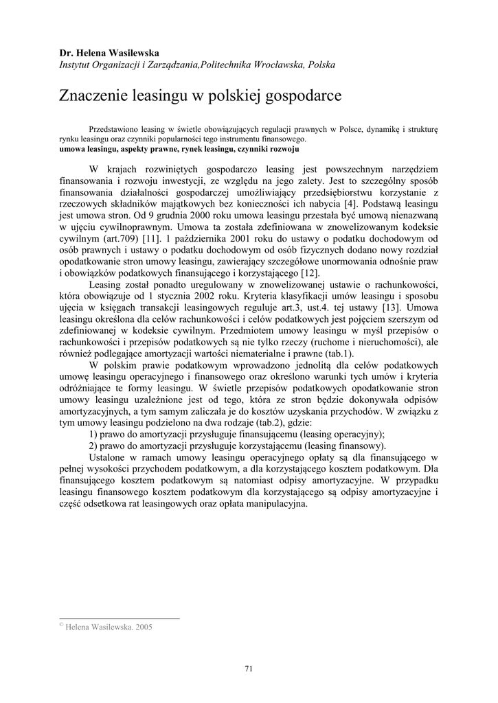 Dr. Helena Wasilewska © Instytut Organizacji i Zarządzania,Politechnika Wrocławska, Polska Znaczenie leasingu w polskiej gospodarce Przedstawiono leasing w świetle obowiązujących regulacji prawnych w Polsce, dynamikę i strukturę rynku leasingu oraz czynniki popularności tego instrumentu finansowego. umowa leasingu, aspekty prawne, rynek leasingu, czynniki rozwoju W krajach rozwiniętych gospodarczo leasing jest powszechnym narzędziem finansowania i rozwoju inwestycji, ze względu na jego zalety. Jest to szczególny sposób finansowania działalności gospodarczej umożliwiający przedsiębiorstwu korzystanie z rzeczowych składników majątkowych bez konieczności ich nabycia [4]. Podstawą leasingu jest umowa stron. Od 9 grudnia 2000 roku umowa leasingu przestała być umową nienazwaną w ujęciu cywilnoprawnym. Umowa ta została zdefiniowana w znowelizowanym kodeksie cywilnym (art.709) [11]. 1 października 2001 roku do ustawy o podatku dochodowym od osób prawnych i ustawy o podatku dochodowym od osób fizycznych dodano nowy rozdział opodatkowanie stron umowy leasingu, zawierający szczegółowe unormowania odnośnie praw i obowiązków podatkowych finansującego i korzystającego [12]. Leasing został ponadto uregulowany w znowelizowanej ustawie o rachunkowości, która obowiązuje od 1 stycznia 2002 roku. Kryteria klasyfikacji umów leasingu i sposobu ujęcia w księgach transakcji leasingowych reguluje art.3, ust.4. tej ustawy [13]. Umowa leasingu określona dla celów rachunkowości i celów podatkowych jest pojęciem szerszym od zdefiniowanej w kodeksie cywilnym. Przedmiotem umowy leasingu w myśl przepisów o rachunkowości i przepisów podatkowych są nie tylko rzeczy (ruchome i nieruchomości), ale również podlegające amortyzacji wartości niematerialne i prawne (tab.1). W polskim prawie podatkowym wprowadzono jednolitą dla celów podatkowych umowę leasingu operacyjnego i finansowego oraz określono warunki tych umów i kryteria odróżniające te formy leasingu. W świetle przepisów podatkowych opodatkowanie stron umowy leasingu uzależnione jest od tego, która ze stron będzie dokonywała odpisów amortyzacyjnych, a tym samym zaliczała je do kosztów uzyskania przychodów. W związku z tym umowy leasingu podzielono na dwa rodzaje (tab.2), gdzie: 1) prawo do amortyzacji przysługuje finansującemu (leasing operacyjny); 2) prawo do amortyzacji przysługuje korzystającemu (leasing finansowy). Ustalone w ramach umowy leasingu operacyjnego opłaty są dla finansującego w pełnej wysokości przychodem podatkowym, a dla korzystającego kosztem podatkowym. Dla finansującego kosztem podatkowym są natomiast odpisy amortyzacyjne. W przypadku leasingu finansowego kosztem podatkowym dla korzystającego są odpisy amortyzacyjne i część odsetkowa rat leasingowych oraz opłata manipulacyjna. © Helena Wasilewska. 2005 71 Tabela 1 – Porównanie regulacji prawnych umowy leasingu Art.709 kodeksu cywilnego Leasingiem jest wyłącznie umowa określona w art.709 k.c. Przez umowę leasingu finansujący zobowiązuje się w zakresie działalności swego przedsiębiorstwa nabyć rzecz od oznaczonego nabywcy na warunkach określonych w tej umowie i oddać tę rzecz korzystającemu do używania albo używania i pobierania pożytków przez czas oznaczony, a korzystający zobowiązuje się zapłacić finansującemu w uzgodnionych ratach wynagrodzenie pieniężne, równe co najmniej cenie lub wynagrodzeniu z tytułu nabycia rzeczy przez finansującego. Przedmiotem leasingu może być wyłącznie rzecz, którą zgodnie z art.45 k.c.jest przedmiot materialny, rzecz ruchoma lub nieruchomość. Korzystający jest zobowiązany do zapłaty na rzecz finansującego wynagrodzenia pieniężnego w uzgodnionych ratach, równych, co najmniej cenie nabycia rzeczy przez finansującego. Art.3 ust.4 ustawy o rachunkowości Jeżeli jednostka przyjęła do użytkowania obce środki trwałe lub wartości niematerialne i prawne na mocy umowy, zgodnie, z którą jedna ze stron, zwanej dalej „finansującym‖, oddaje drugiej stronie zwanej dalej „korzystającym‖, środki trwałe lub wartości niematerialne i prawne do odpłatnego używania lub również pobierania pożytków na czas oznaczony, środki te i wartości zalicza się do aktywów korzystającego, jeżeli umowa spełnia co najmniej jeden z następujących warunków(wymienia się siedem warunków) np.1)przenosi własność jej przedmiotu na korzystającego po zakończeniu okresu, na który została zawarta, 2) zawiera prawo do nabycia jej przedmiotu przez korzystającego, po zakończeniu okresu, na jaki została zawarta, po cenie niższej od wartości rynkowej z dnia nabycia, 3) okres, na jaki została zawarta, odpowiada w przeważającej części przewidywanemu okresowi ekonomicznej użyteczności środka trwałego lub prawa majątkowego, przy czym nie może być on krótszy niż ¾ tego okresu. Prawo własności przedmiotu umowy może być po okresie, na jaki umowa została zawarta przeniesione na korzystającego. Umowa powinna być zawarta na czas oznaczony, przy czym określenie czasu trwania umowy leży w gestii stron umowy. Źródło: sporządzono na podstawie [3], [11], [12] i [13]. 72 Międzynarodowy Standard Rachunkowości MSR 17 Umowa leasingowa jest to umowa na mocy, której w zamian za opłatę lub serie opłat, leasingodawca przekazuje, leasingodbiorcy prawo do użytkowania danego składnika aktywów przez uzgodniony okres. Ustawa o podatku dochodowym Leasingiem jest umowa nazwana w kodeksie cywilnym, która spełnia warunki określone w ustawie o podatku dochodowym. Przedmiotem leasingu są tylko niektóre rzeczy, podlegające amortyzacji środki trwałe a także grunty oraz nie zaliczane do rzeczy, podlegające amortyzacji wartości niematerialne i prawne Suma opłat ustalonych w umowie, pomniejszona o należny podatek VAT musi odpowiadać, co najmniej wartości początkowej środków trwałych lub wartości niematerial